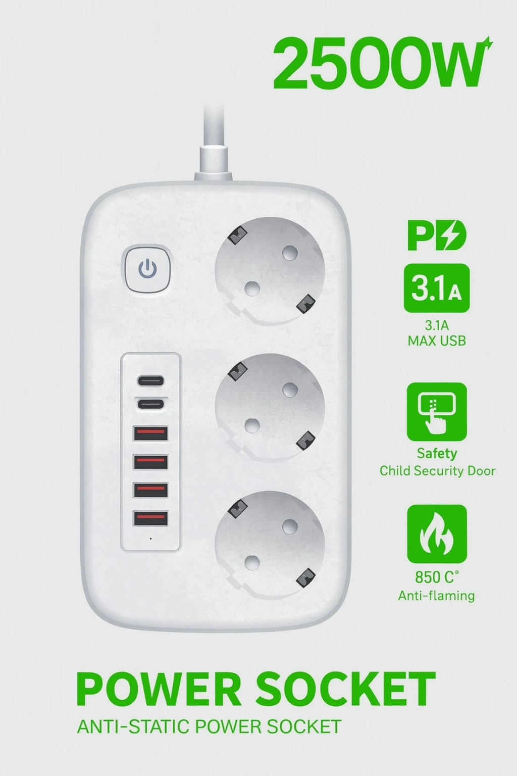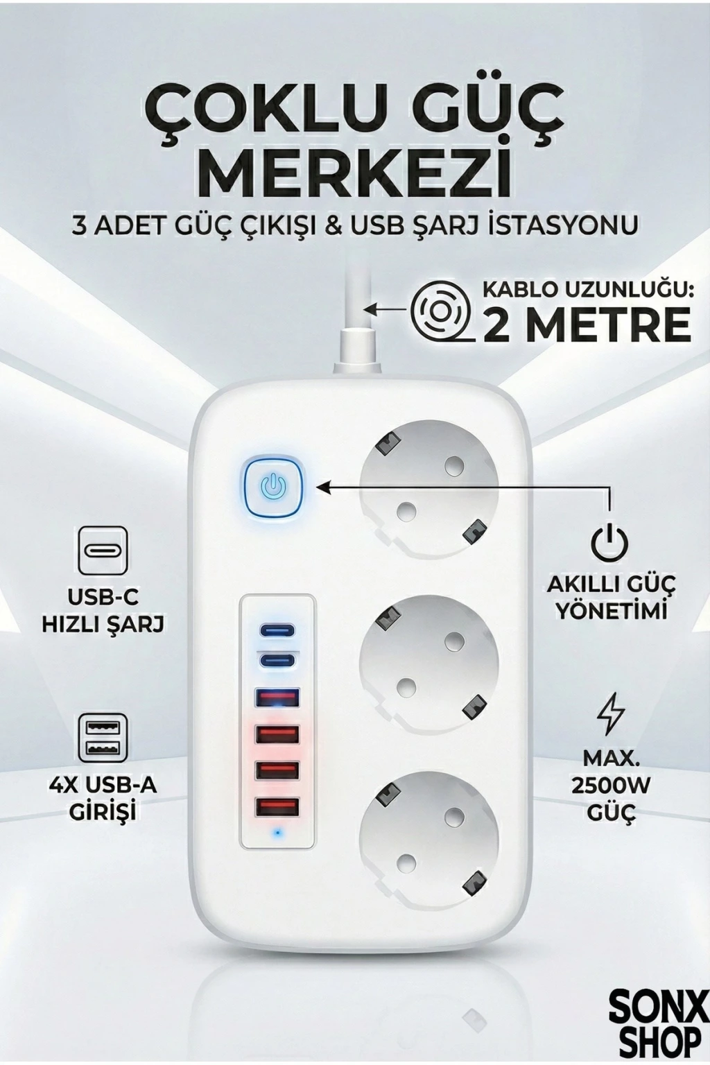 Akım Korumalı 2500W Güçlü 3 USB + Type-C Portlu Çoklu Priz | Hızlı Şarj, Çocuk Kilidi, 2 METRE