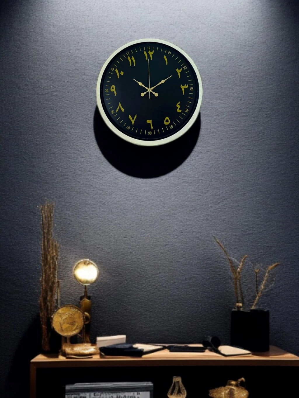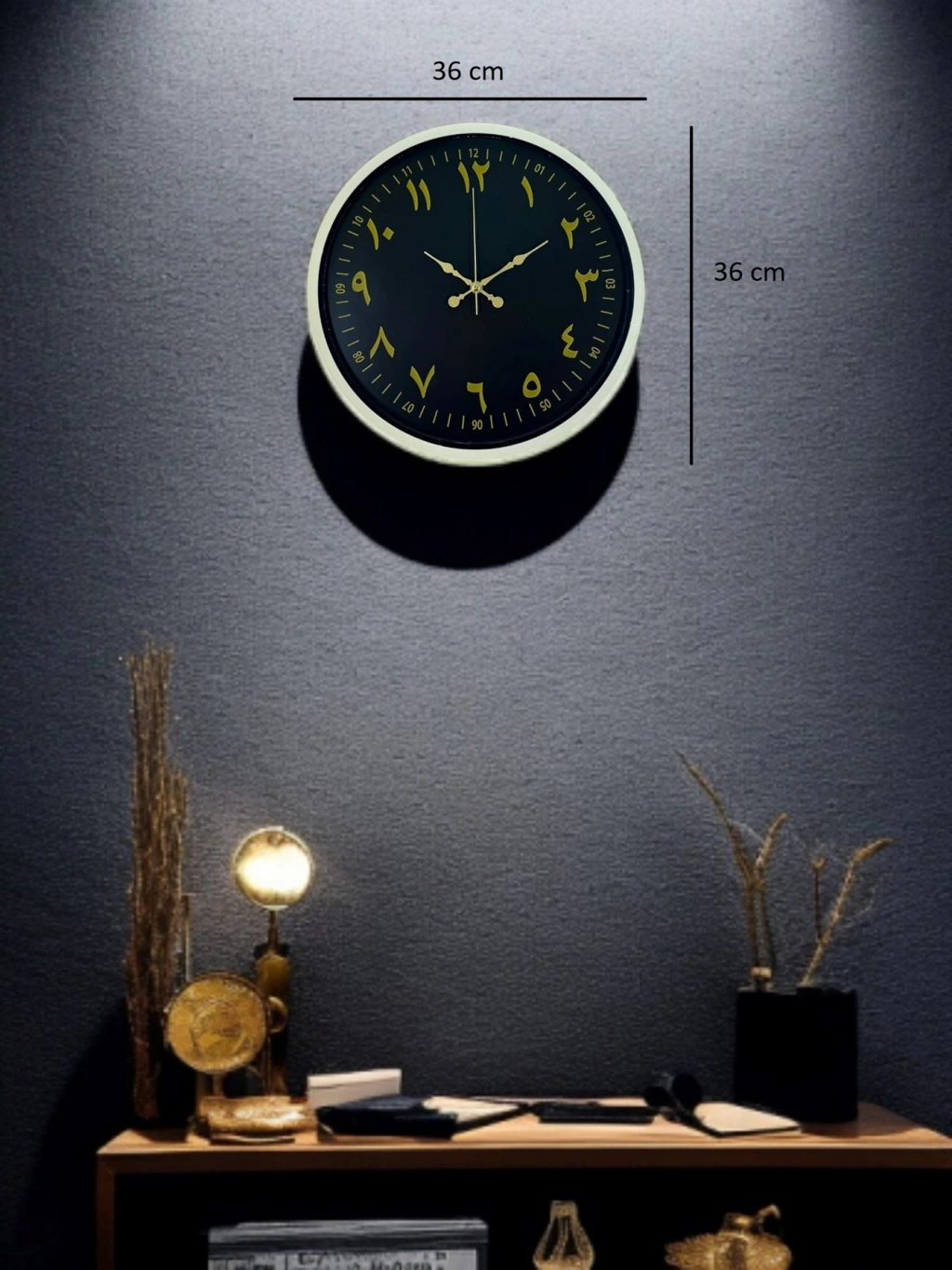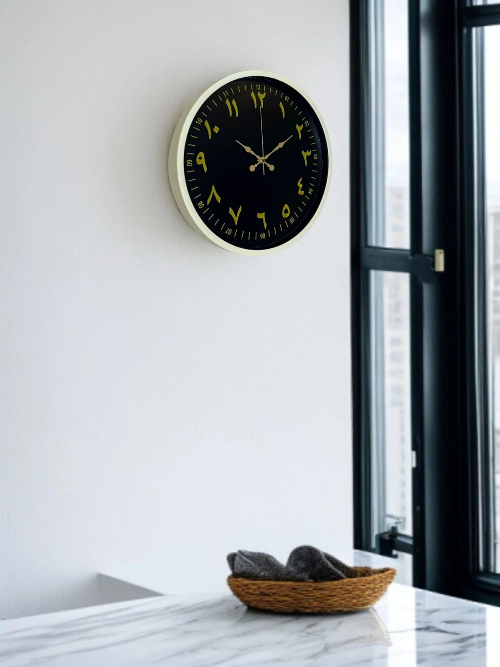 Arapça rakamlı kadranı ve siyah zemin üzerindeki gold tonlu detaylarıyla öne çıkan bu 36 cm krem duvar saati, klasik estetiği modern çizgilerle buluşturur. Farklı ve anlamlı tasarımı sayesinde standart duvar saatlerinden ayrılır; bulunduğu ortama karakter ve zarafet katar.