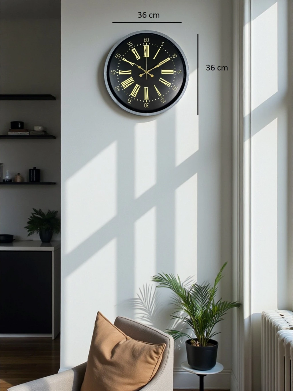 Modern ve şık dekorasyonu bir arada sunan 36 cm Gri Renk Duvar Saati, sade tasarımı ve gri-metal çerçevesiyle hem modern hem endüstriyel dekorasyon tarzlarına mükemmel uyum sağlar. Siyah arka plan üzerinde kullanılan altın tonlu Roma rakamları, saatin tasarımına lüks bir dokunuş katar ve bulunduğu ortamın estetik değerini artırır.