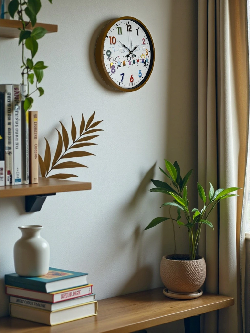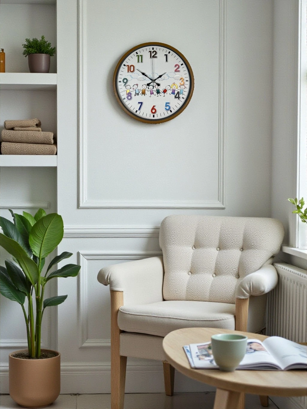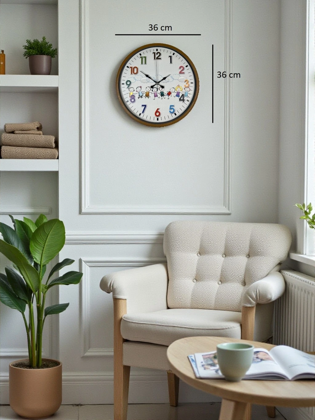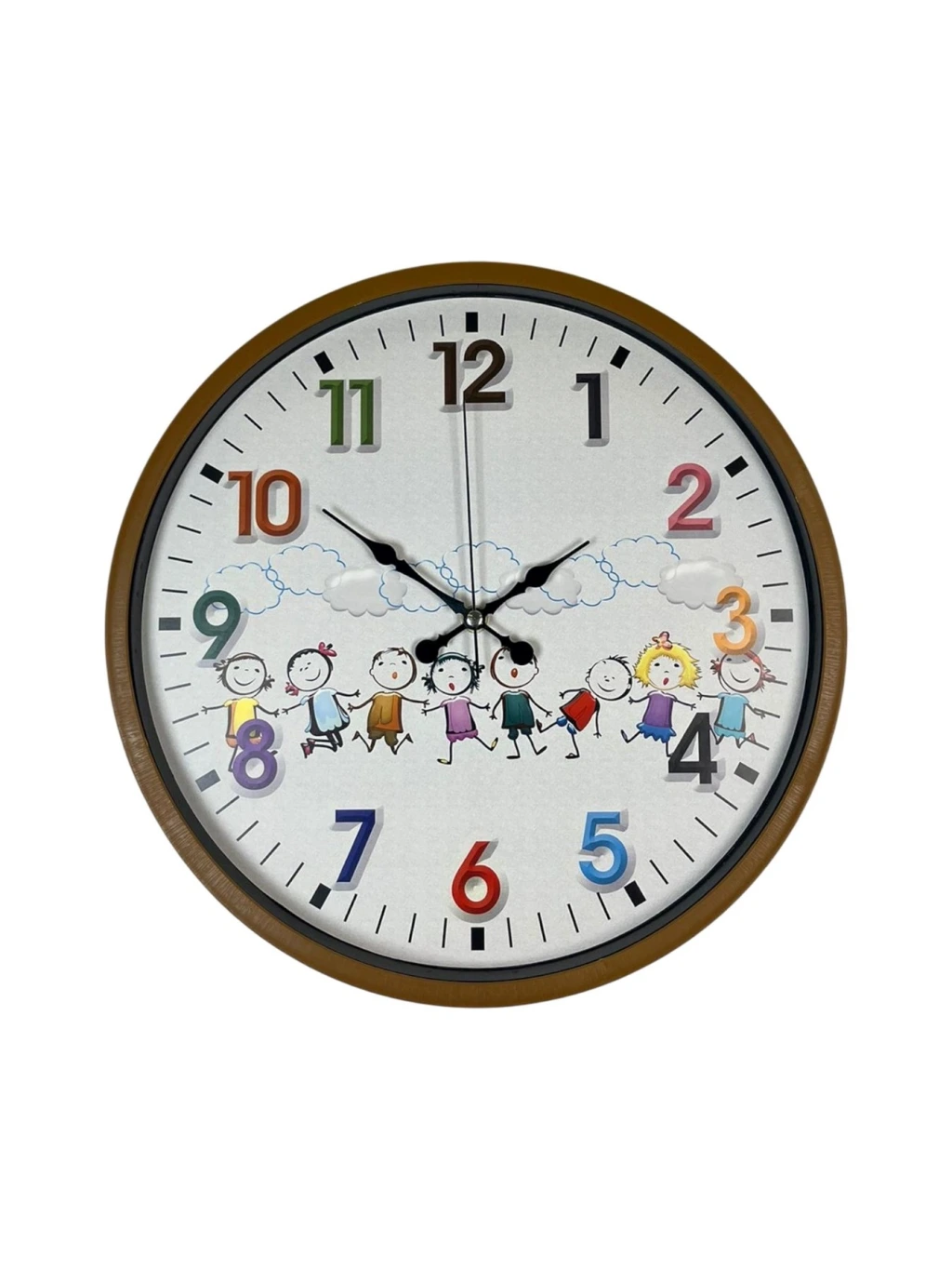 Kahverengi çerçevesi ve sevimli çizimlerle süslenmiş kadranıyla tasarlanan bu 36 cm çocuk odası duvar saati, çocukların ilgisini çeken eğlenceli tasarımıyla odalara neşeli bir atmosfer kazandırır. Renkli rakamları ve mutlu çocuk figürleri sayesinde hem dekoratif hem de öğretici bir üründür. Çocukların saat kavramını kolayca öğrenmesine yardımcı olur.
