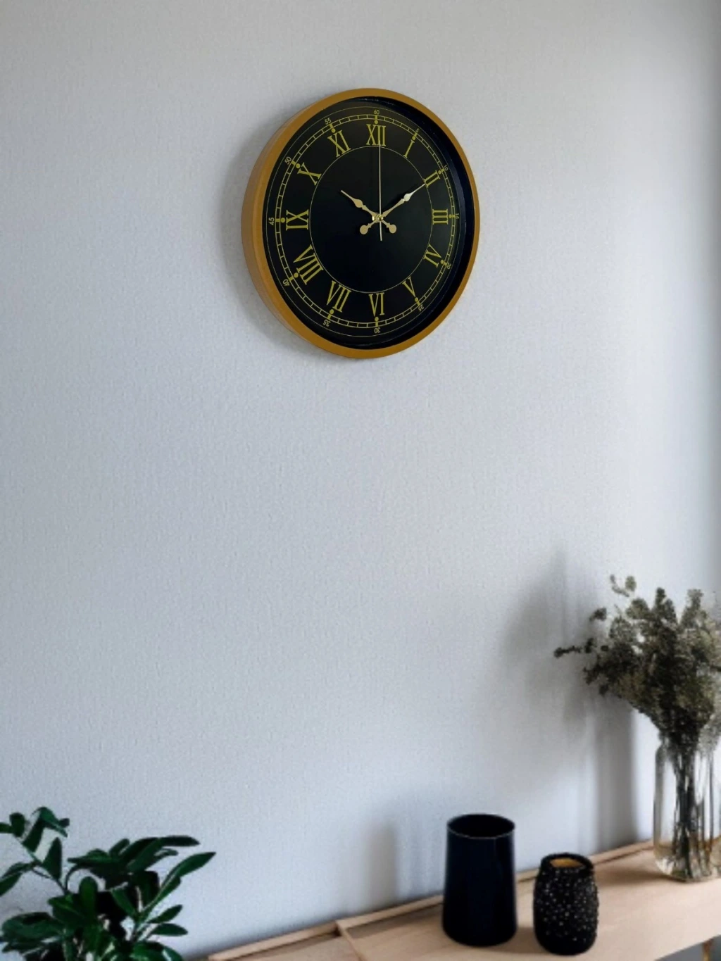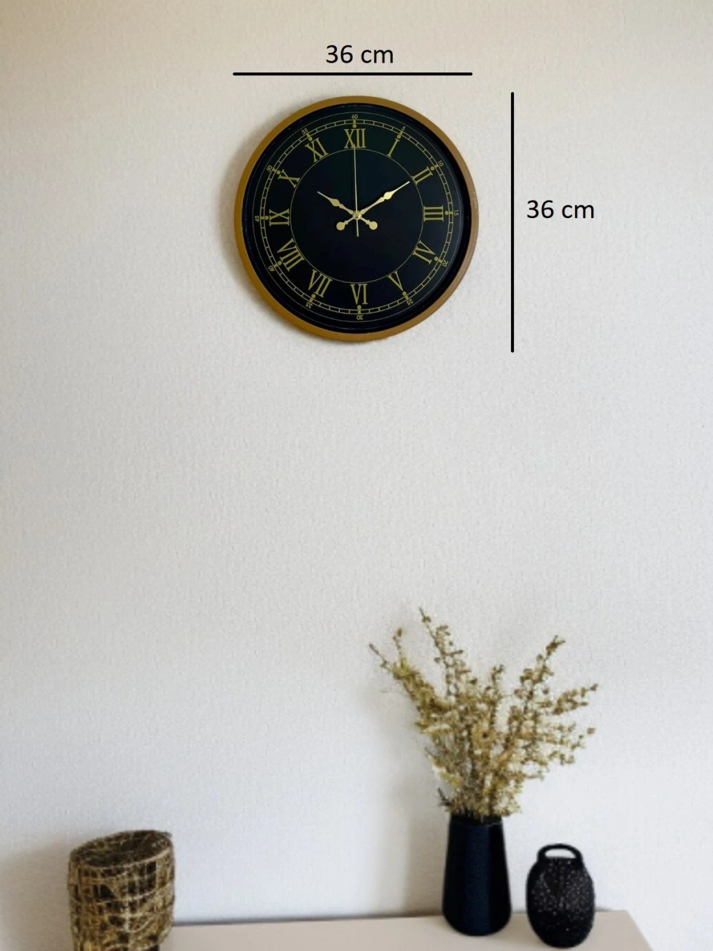 Roma rakamlı kadranı, saate klasik bir karakter kazandırırken; gold renkli akrep ve yelkovan detayları ürüne şık ve premium bir görünüm ekler. 36 cm çapı sayesinde duvarda ne çok büyük ne de küçük durur; dengeli ölçüsüyle dikkat çeker ve bulunduğu alanı tamamlar.