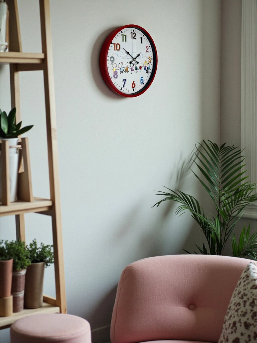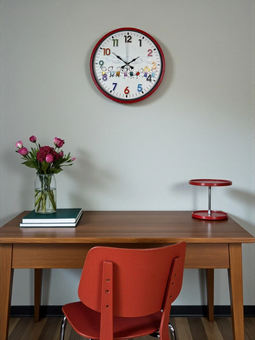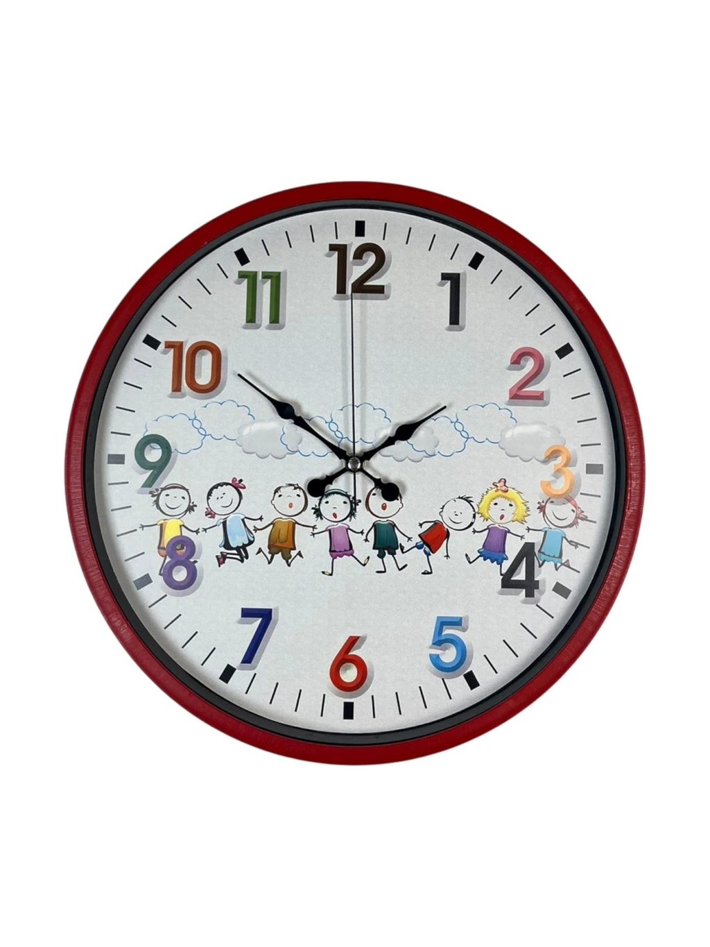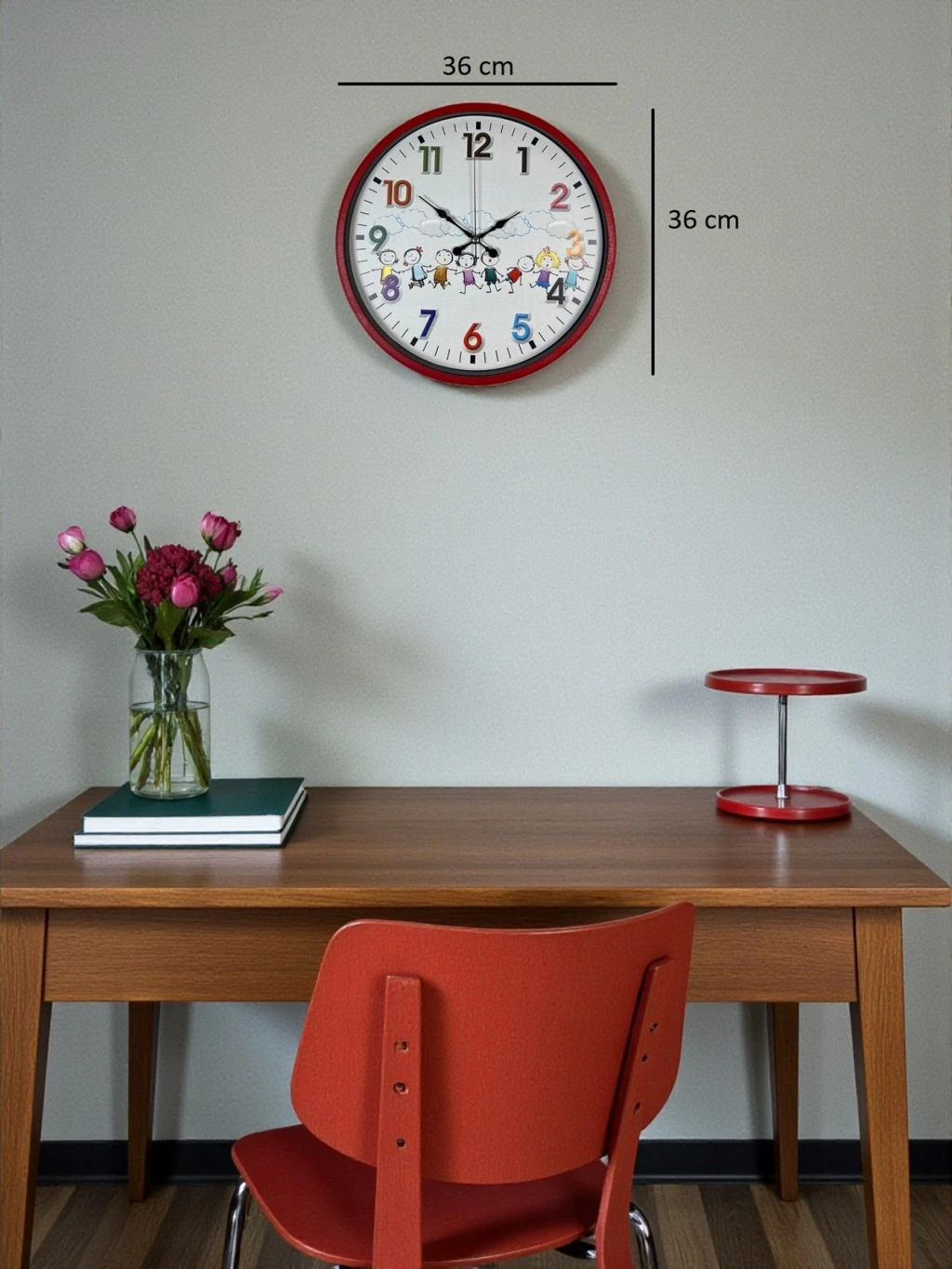 Canlı kırmızı çerçevesi ve sevimli çizimlerle süslenmiş kadranı sayesinde bu 36 cm çocuk odası duvar saati, çocuk odalarına neşe ve enerji katar. Renkli ve büyük rakamları, çocukların saatleri kolayca öğrenmesine yardımcı olurken; mutlu çocuk figürleri ile eğlenceli bir atmosfer oluşturur. Hem dekoratif hem de öğretici bir tasarıma sahiptir.