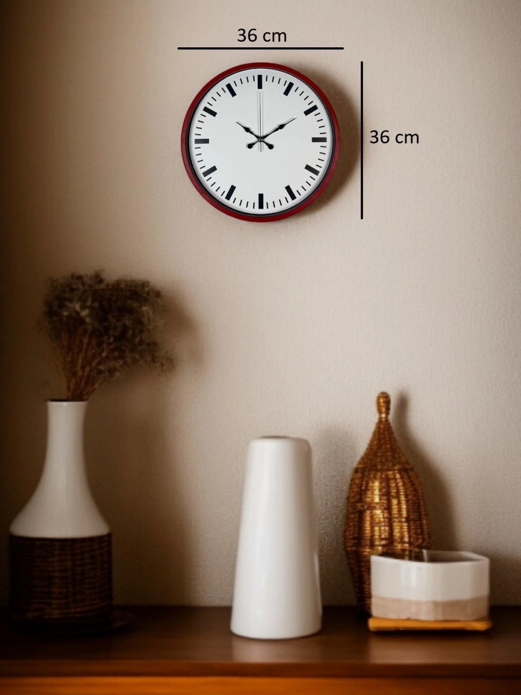36 cm çapı ile duvarda dengeli bir duruş sergileyen bu kırmızı duvar saati; mutfak, salon, ofis, genç odası ve çalışma alanları için hem dekoratif hem de işlevsel bir tercih sunar.