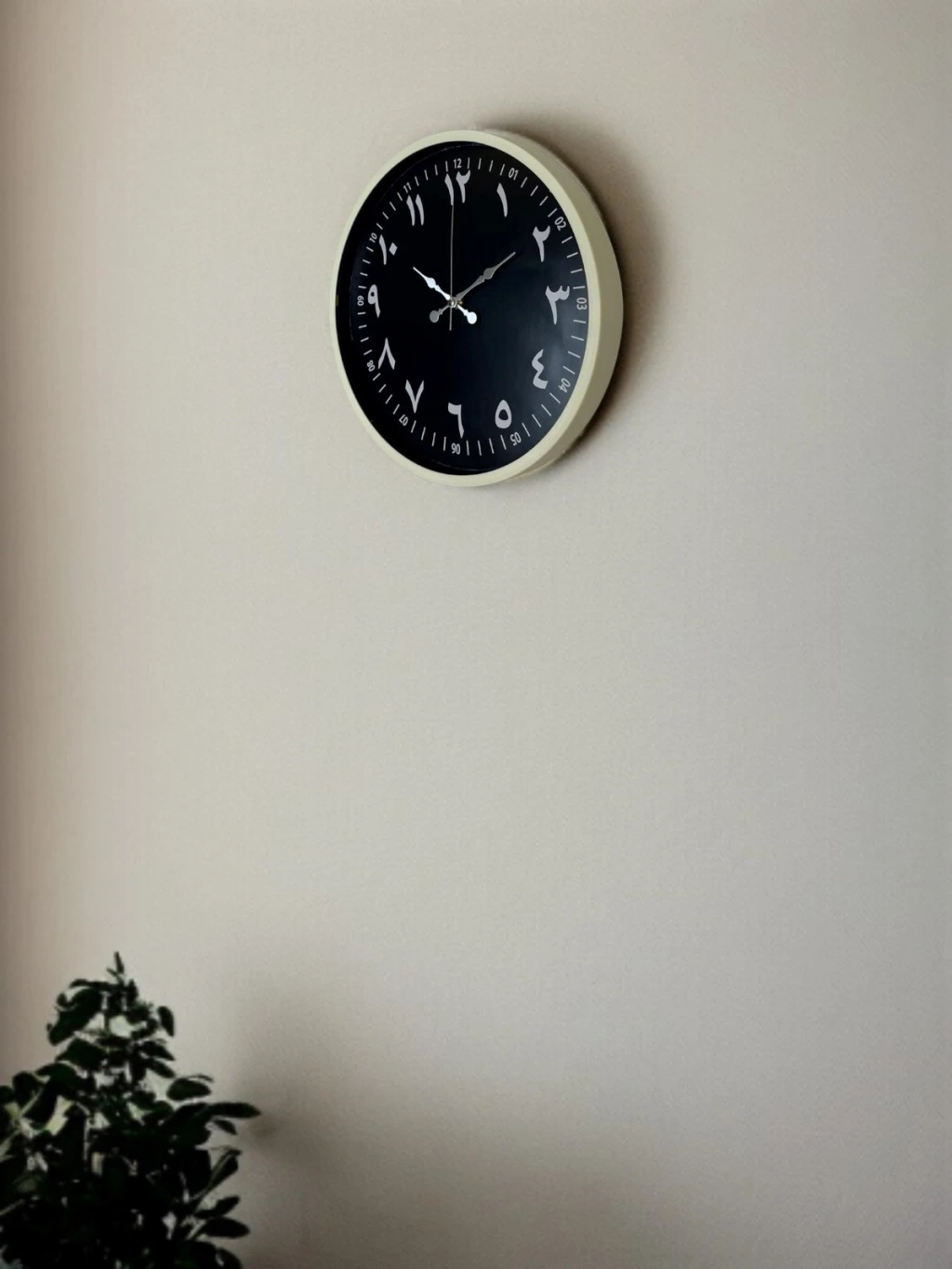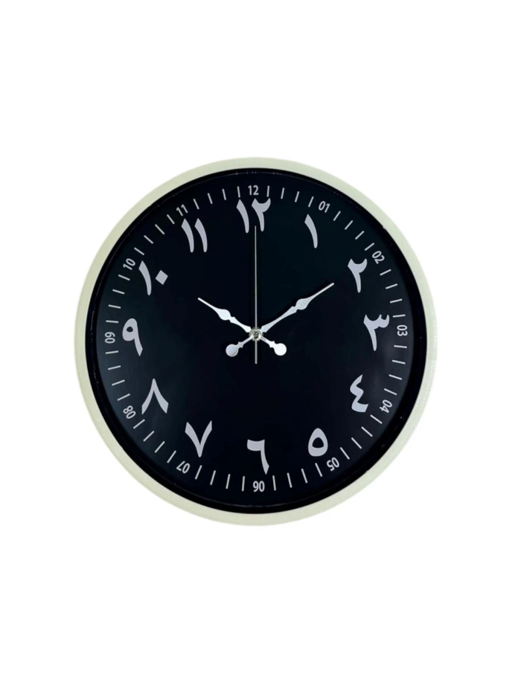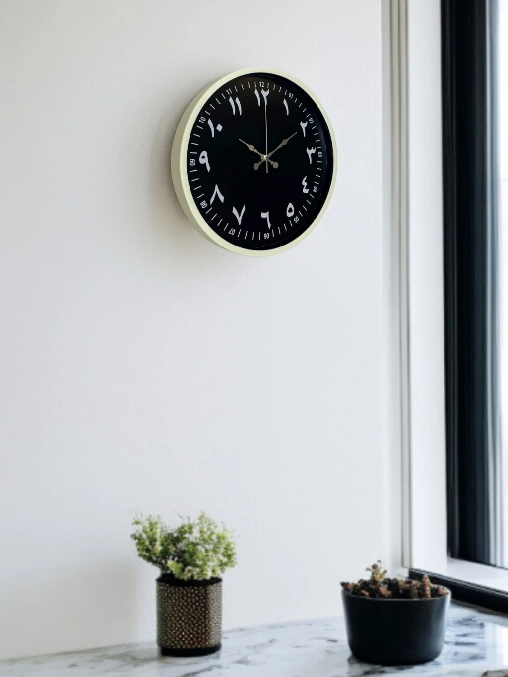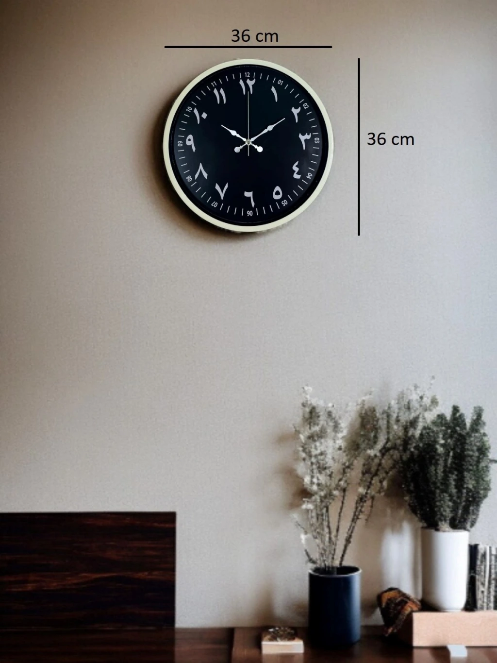 Arapça rakamlı kadranı ve siyah zemin üzerindeki gümüş tonlu detaylarıyla öne çıkan bu 36 cm krem duvar saati, klasik estetiği modern çizgilerle buluşturur. Farklı ve anlamlı tasarımı sayesinde standart duvar saatlerinden ayrılır; bulunduğu ortama karakter ve zarafet katar.