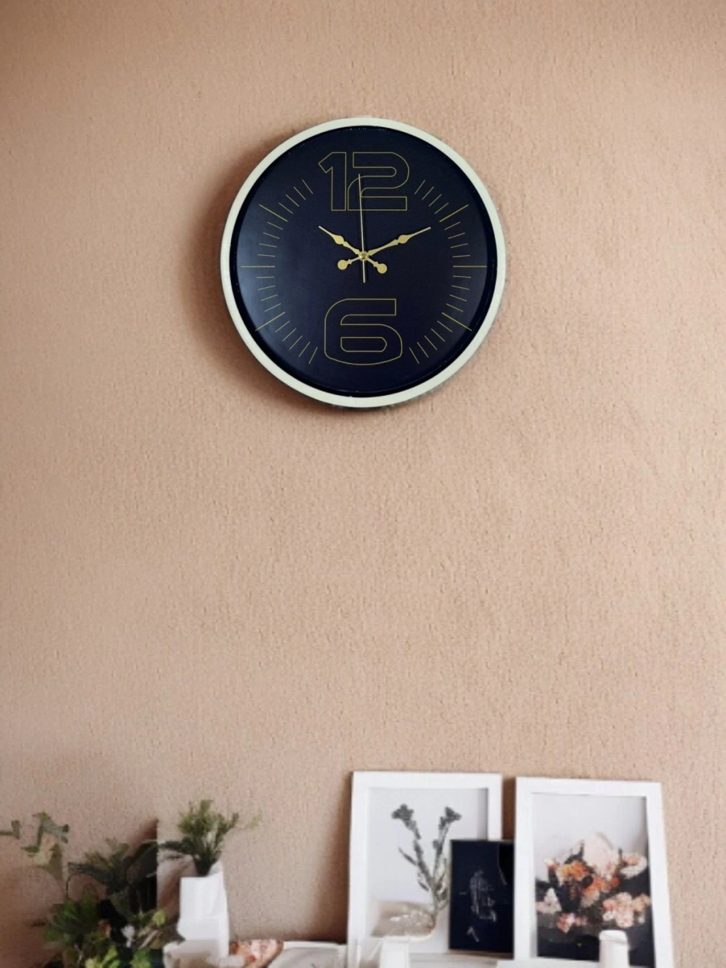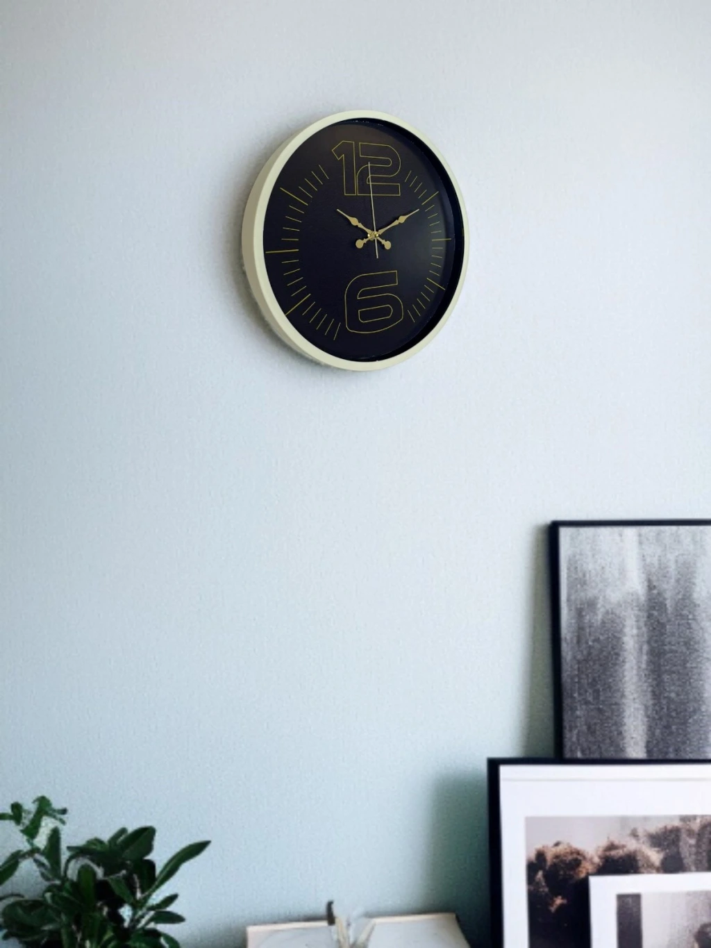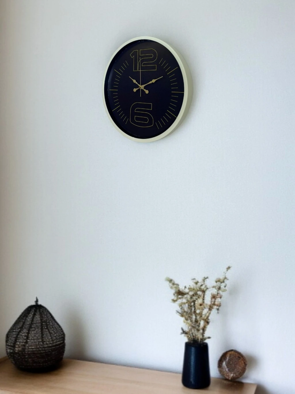 Krem renkli çerçevesi ve koyu zemin üzerindeki modern rakam tasarımıyla öne çıkan bu 36 cm duvar saati, bulunduğu ortama zarif ve dengeli bir şıklık kazandırır. Gold tonlu akrep-yelkovan detayları ve sade kadran yapısı, saate modern ve premium bir görünüm verir. Hem klasik hem de modern dekorasyon stilleriyle kolayca uyum sağlar.