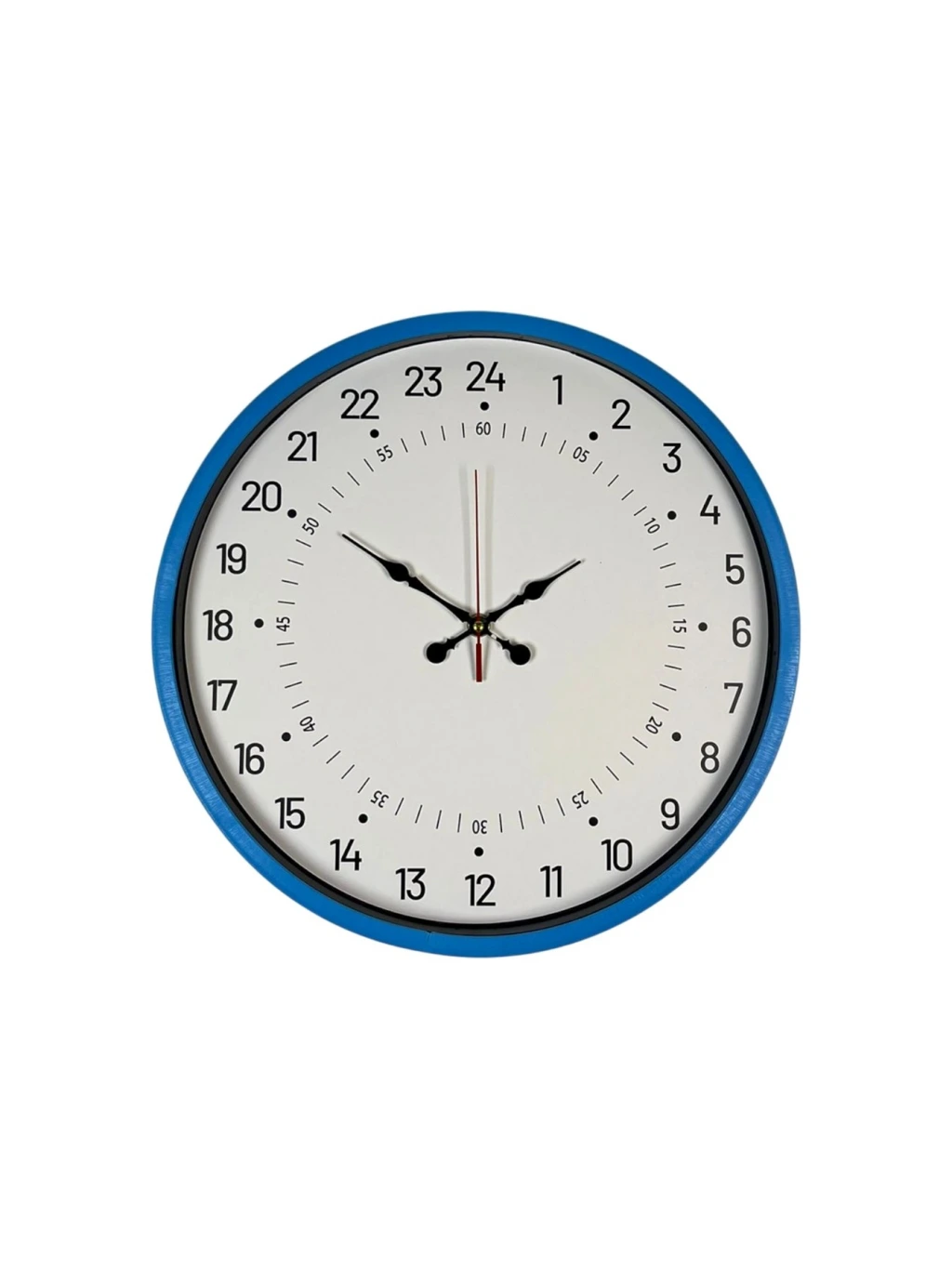 Canlı mavi çerçevesi ve sade beyaz kadranı, net siyah rakamlarla birleşerek yüksek okunabilirlik sunar. İç ve dış halkada yer alan 24 saatlik göstergeler, özellikle eğitim amaçlı kullanım, vardiyalı çalışma düzeni ve farklı zaman dilimlerine alışma süreçleri için büyük avantaj sağlar.