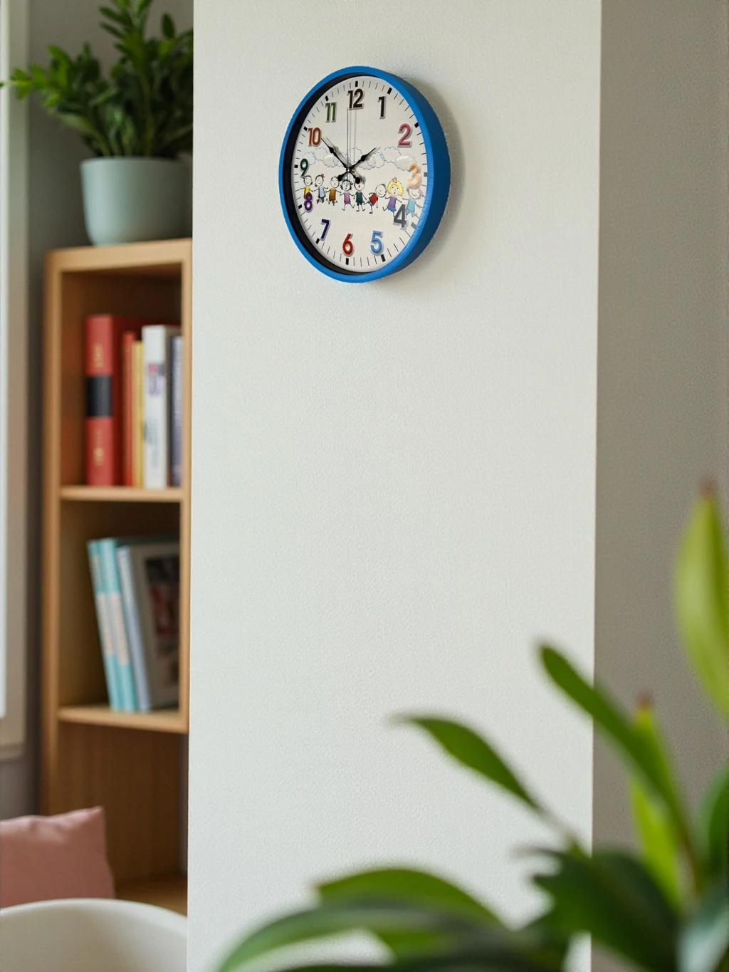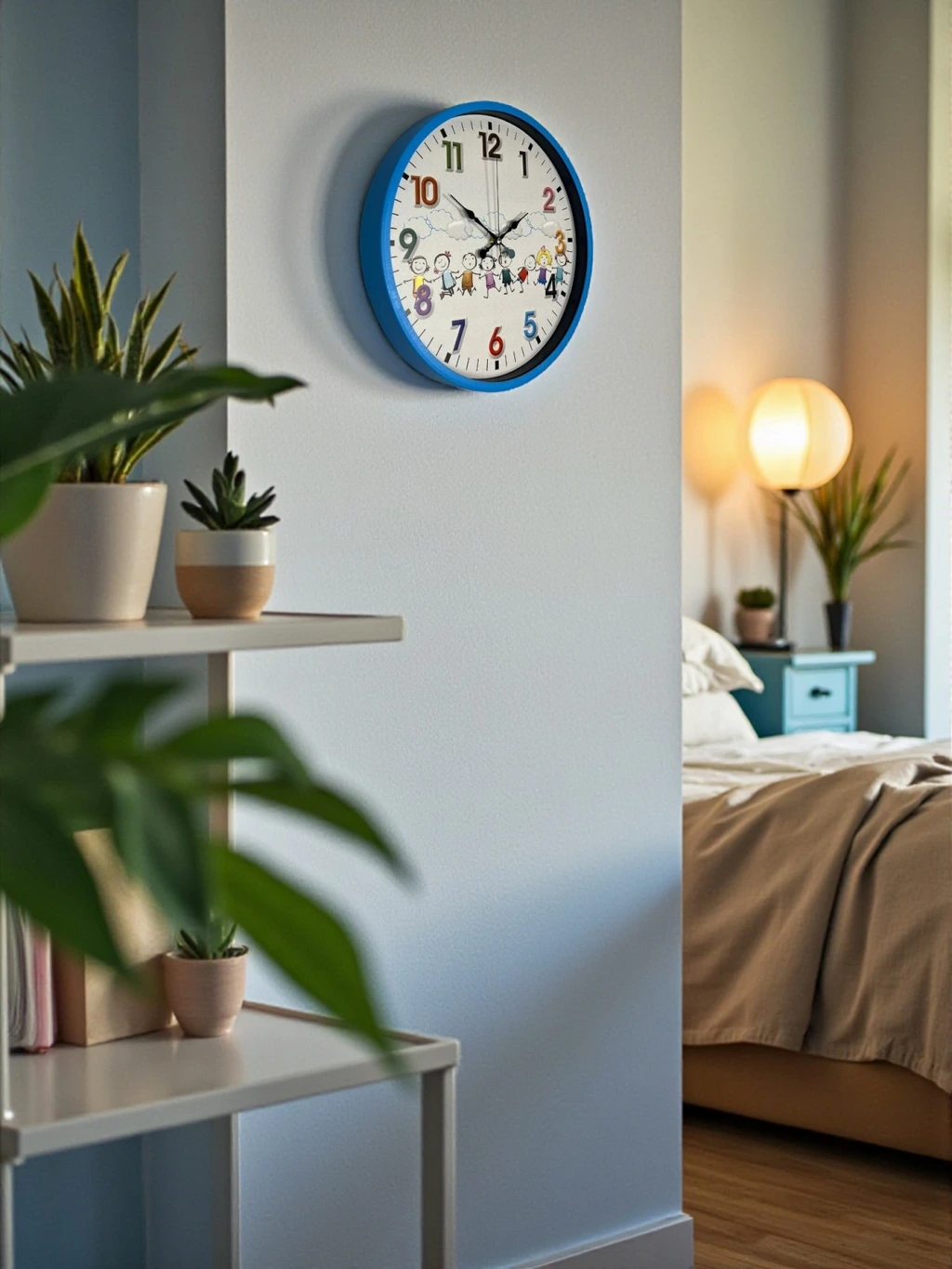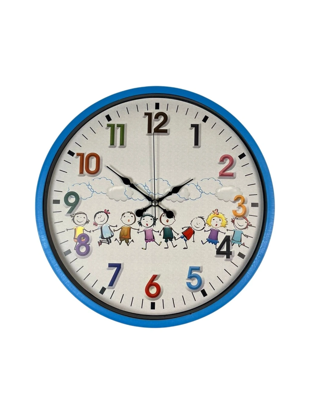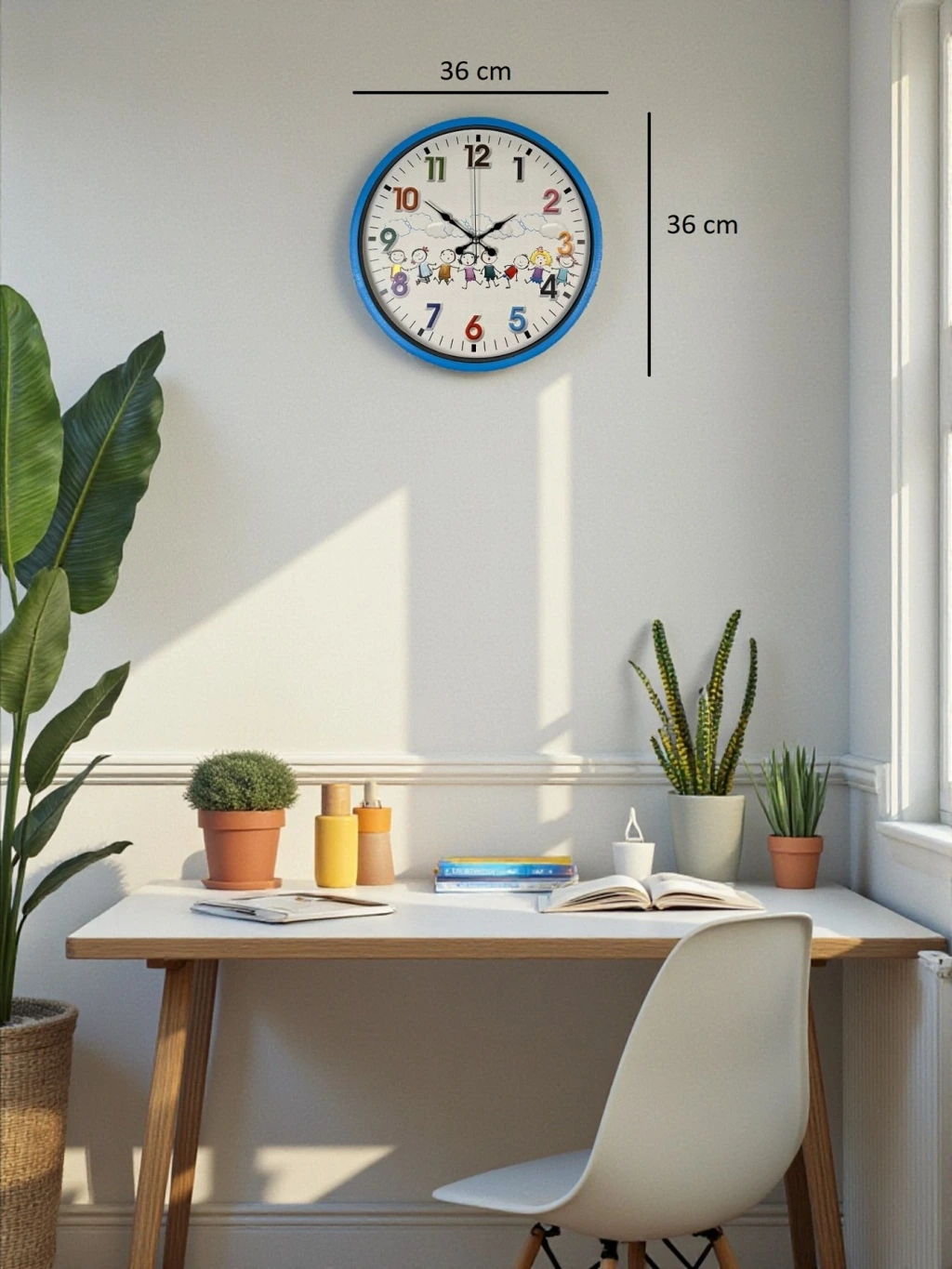 Canlı mavi çerçevesi, renkli rakamları ve sevimli çocuk figürleriyle tasarlanan bu 36 cm çocuk odası duvar saati, çocukların odasına neşe ve hareket katar. Eğlenceli tasarımı sayesinde çocukların saat kavramını öğrenmesini desteklerken, odanın dekorasyonuna da sıcak bir dokunuş ekler.