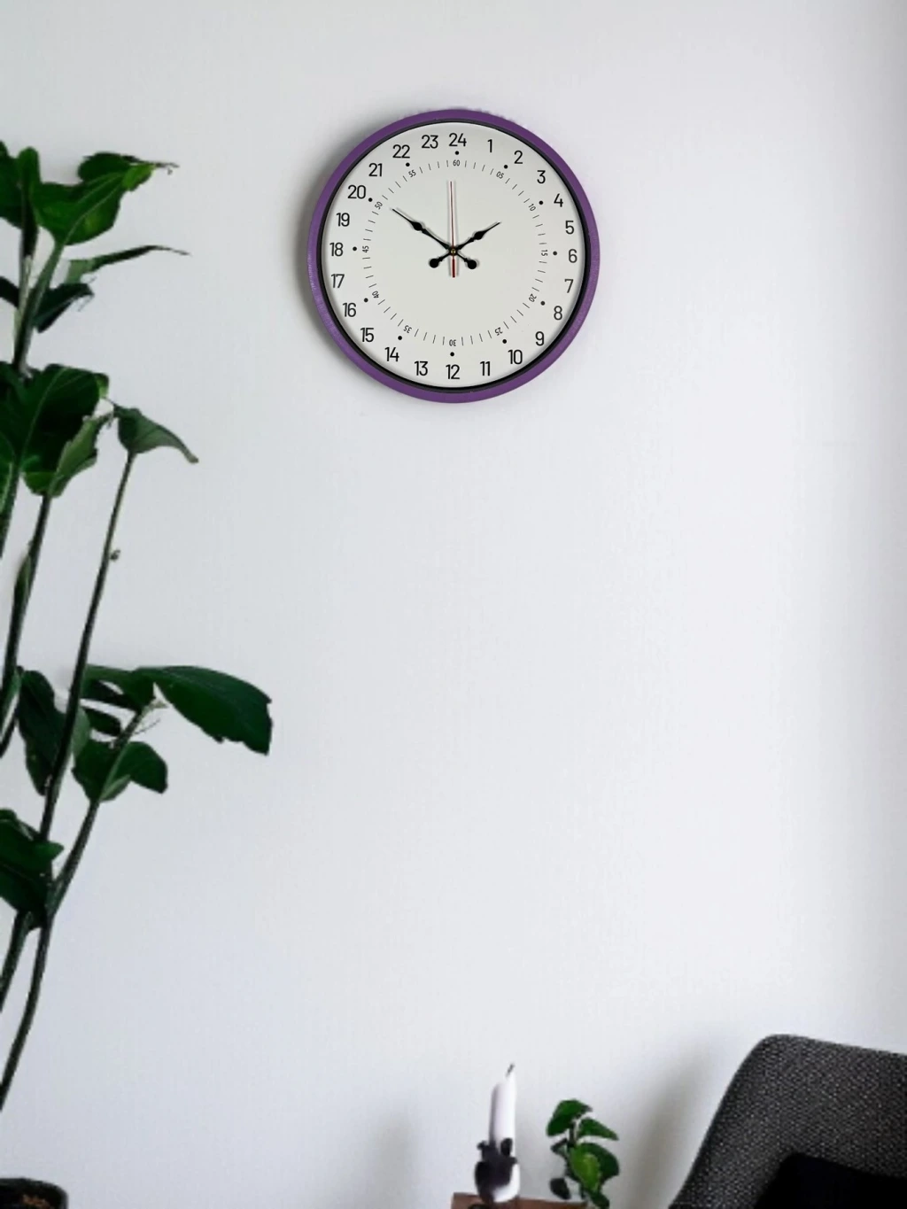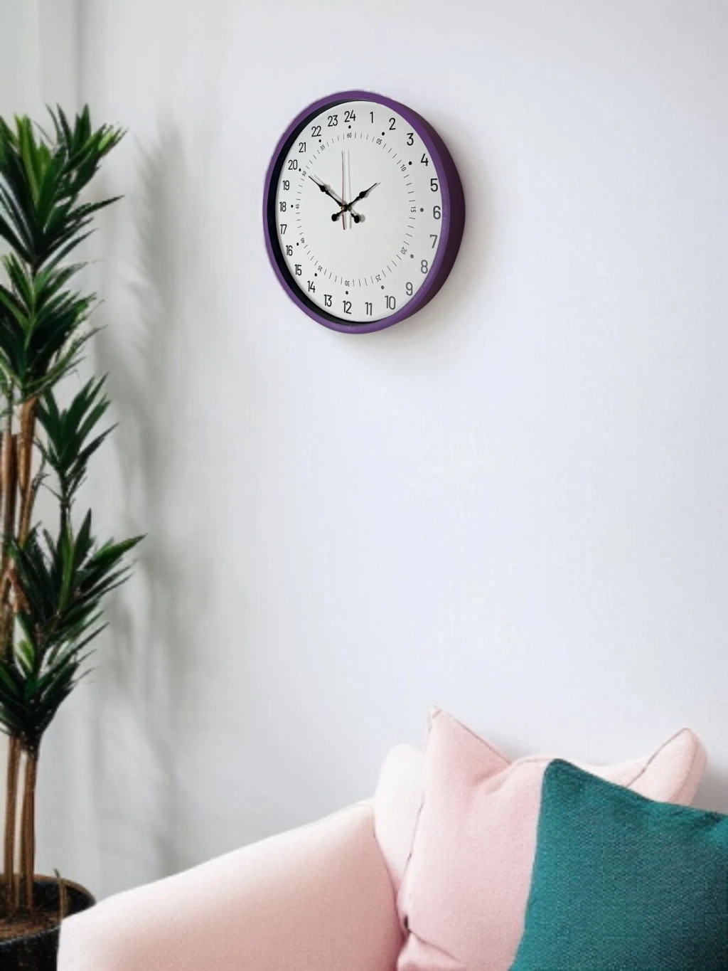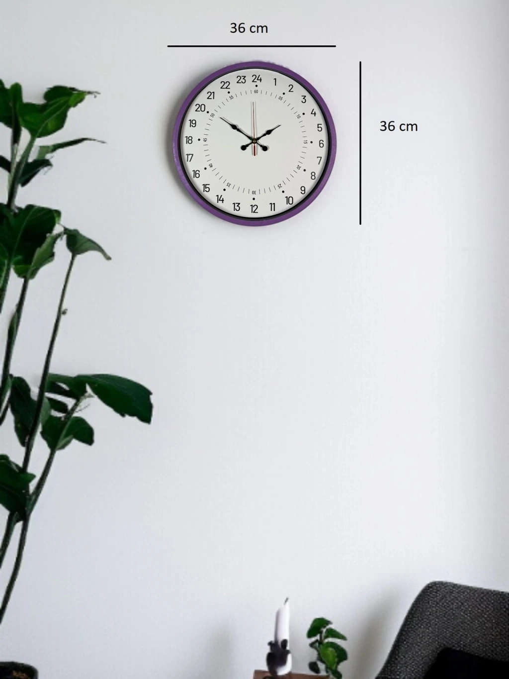 Klasik duvar saatlerinden ayrılan 24 saatlik tek kadranlı özel tasarımı ile öne çıkan bu 36 cm mor duvar saati, zamanı daha bilinçli ve net şekilde takip etmek isteyenler için tasarlanmıştır. Günün tamamını tek bakışta sunan 24 saat göstergesi sayesinde, alışılmış 12 saatlik saatlerden farklı ve işlevsel bir kullanım deneyimi sağlar.