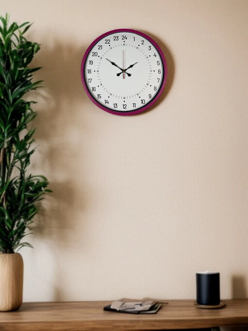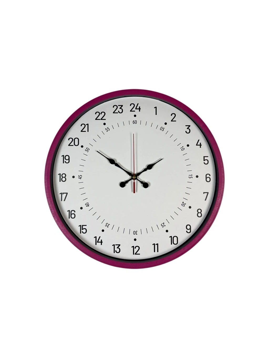Klasik duvar saatlerinden ayrılan 24 saatlik tek kadranlı özel tasarımı ile öne çıkan bu 36 cm pembe duvar saati, günün tamamını tek bakışta görmeyi sağlayarak zaman algısını güçlendirir. Alışılmış 12 saatlik saatlerden farklı yapısı sayesinde özellikle eğitim, çalışma ve vardiyalı kullanım için ideal bir çözümdür.