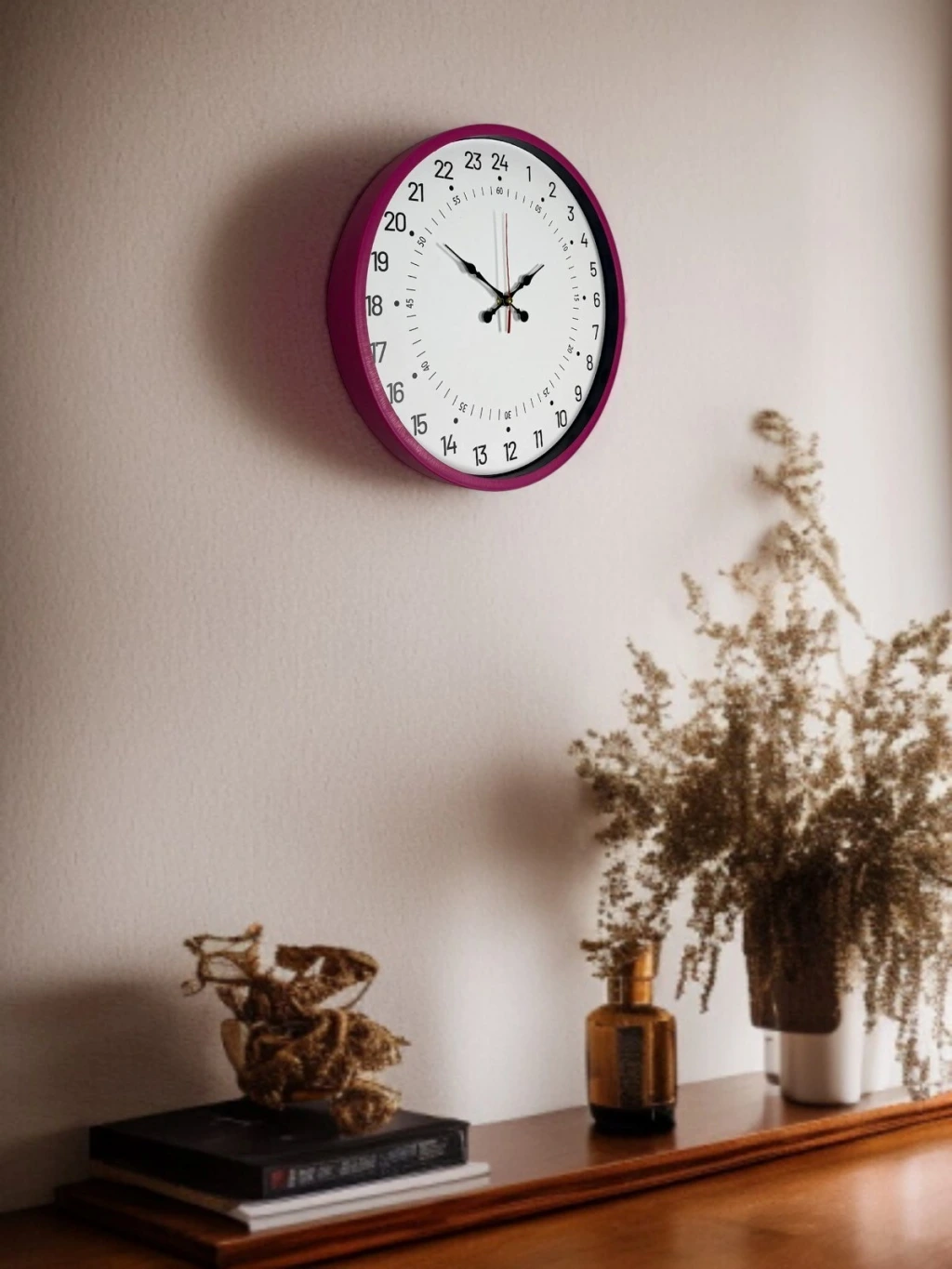 Canlı pembe çerçevesi, sade beyaz kadranı ve net siyah rakamlarıyla hem modern hem de dikkat çekici bir görünüm sunar. İç ve dış halkada yer alan 24 saatlik zaman göstergesi, zamanı daha bilinçli ve düzenli takip etmeye yardımcı olur.
