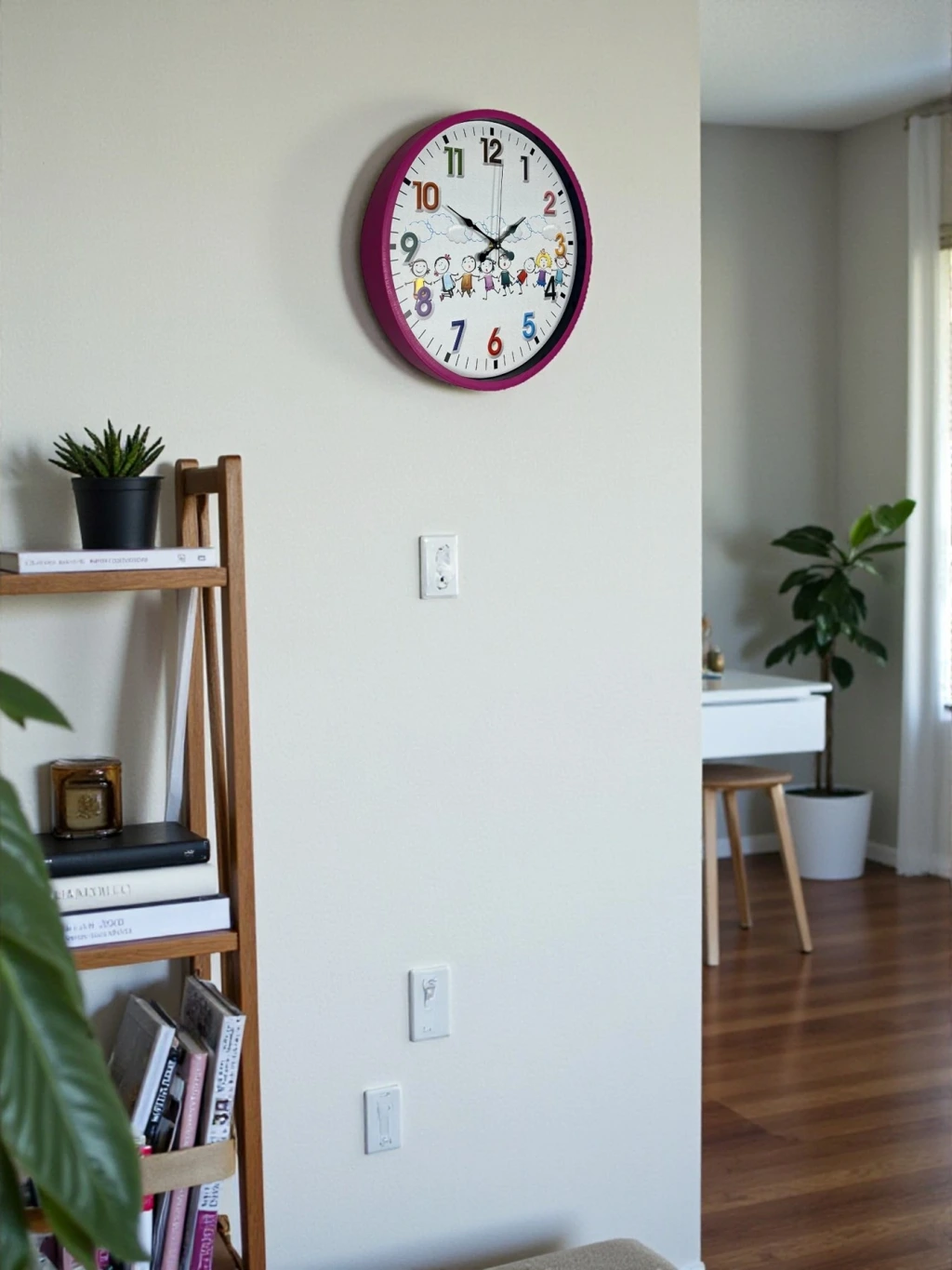 Büyük ve renkli rakamlar, çocukların saati kolayca okuyabilmesini sağlar. Kadran üzerinde yer alan bulutlar ve el ele tutuşan çocuk illüstrasyonları, ürünü hem dekoratif hem de eğitici hale getirir. Sessiz ve akıcı mekanizması, tik-tak sesi oluşturmadığı için çocukların uyku ve ders zamanlarında rahatsızlık vermez.