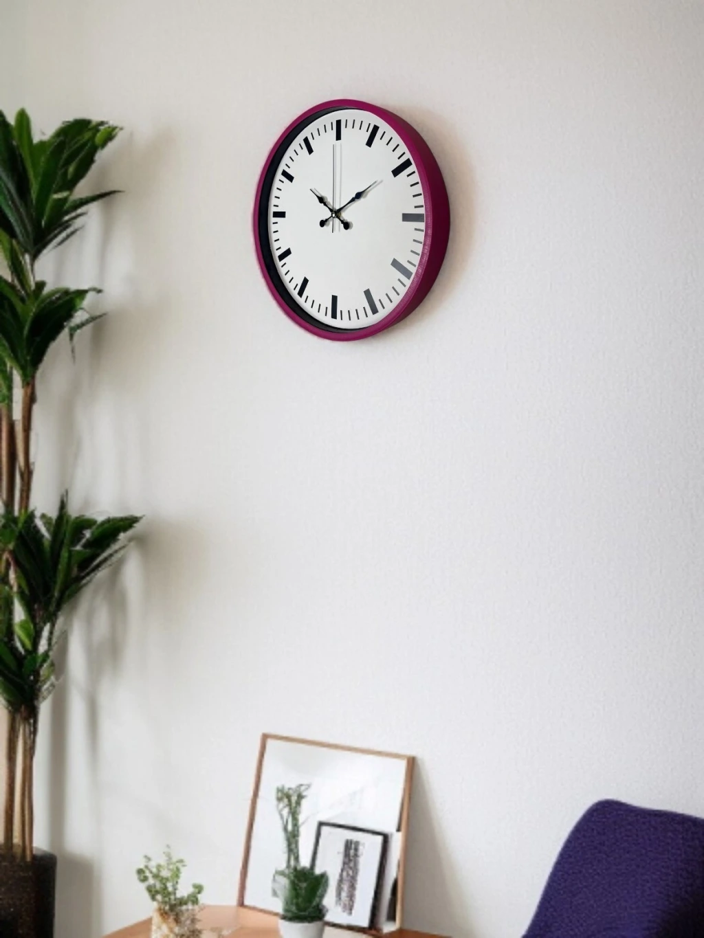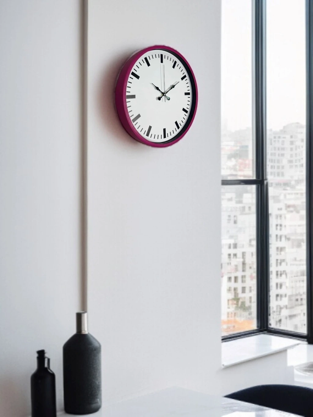 Canlı pembe çerçevesi ve sade beyaz kadran tasarımıyla öne çıkan bu 36 cm duvar saati, yaşam alanlarına enerjik ve modern bir dokunuş kazandırır. Minimal indeks yapısı sayesinde saati uzaktan dahi kolayca okumak mümkündür.