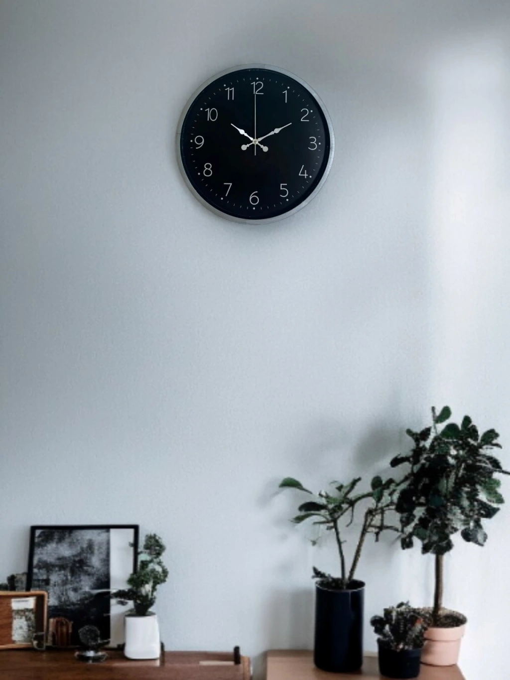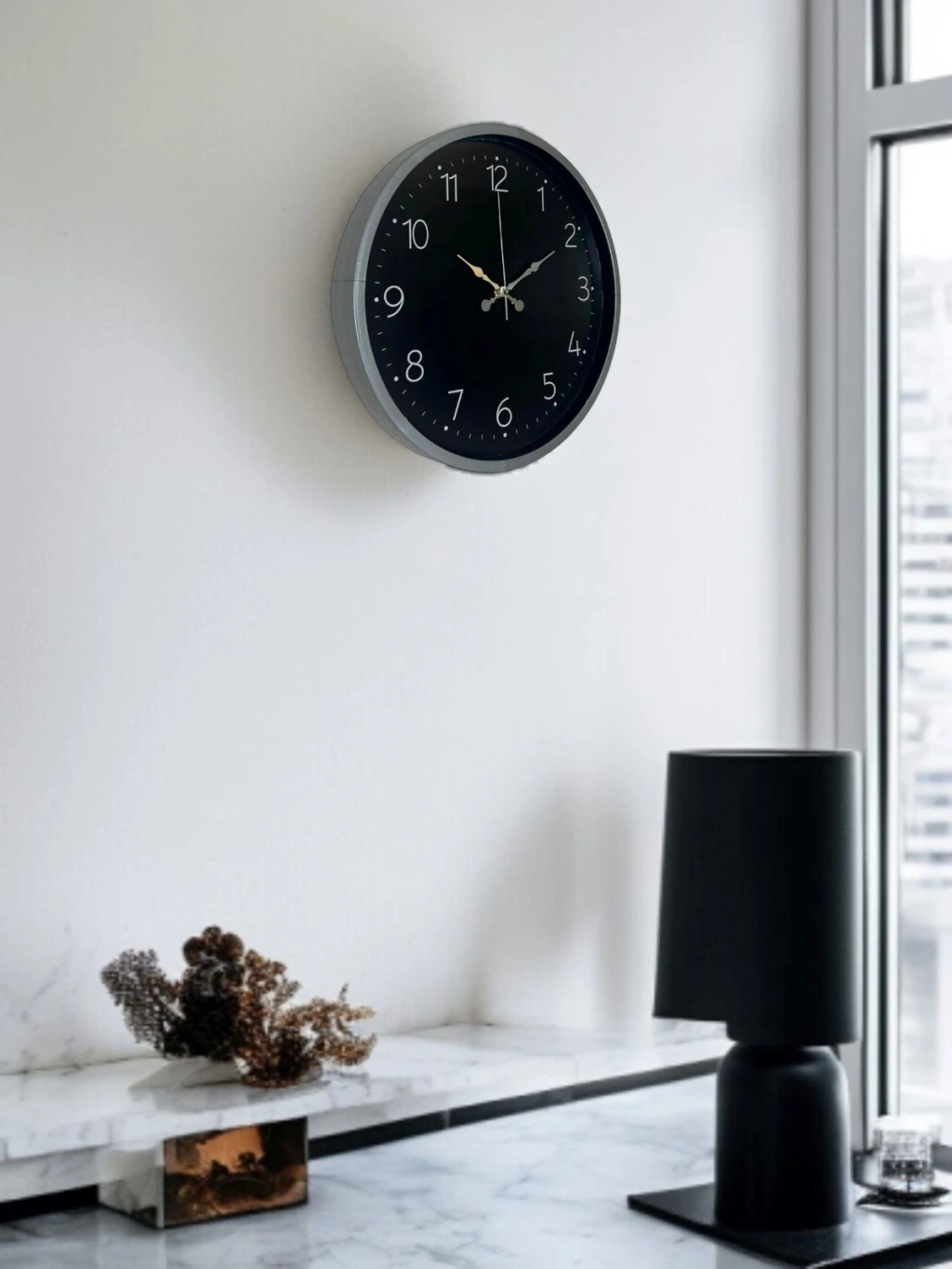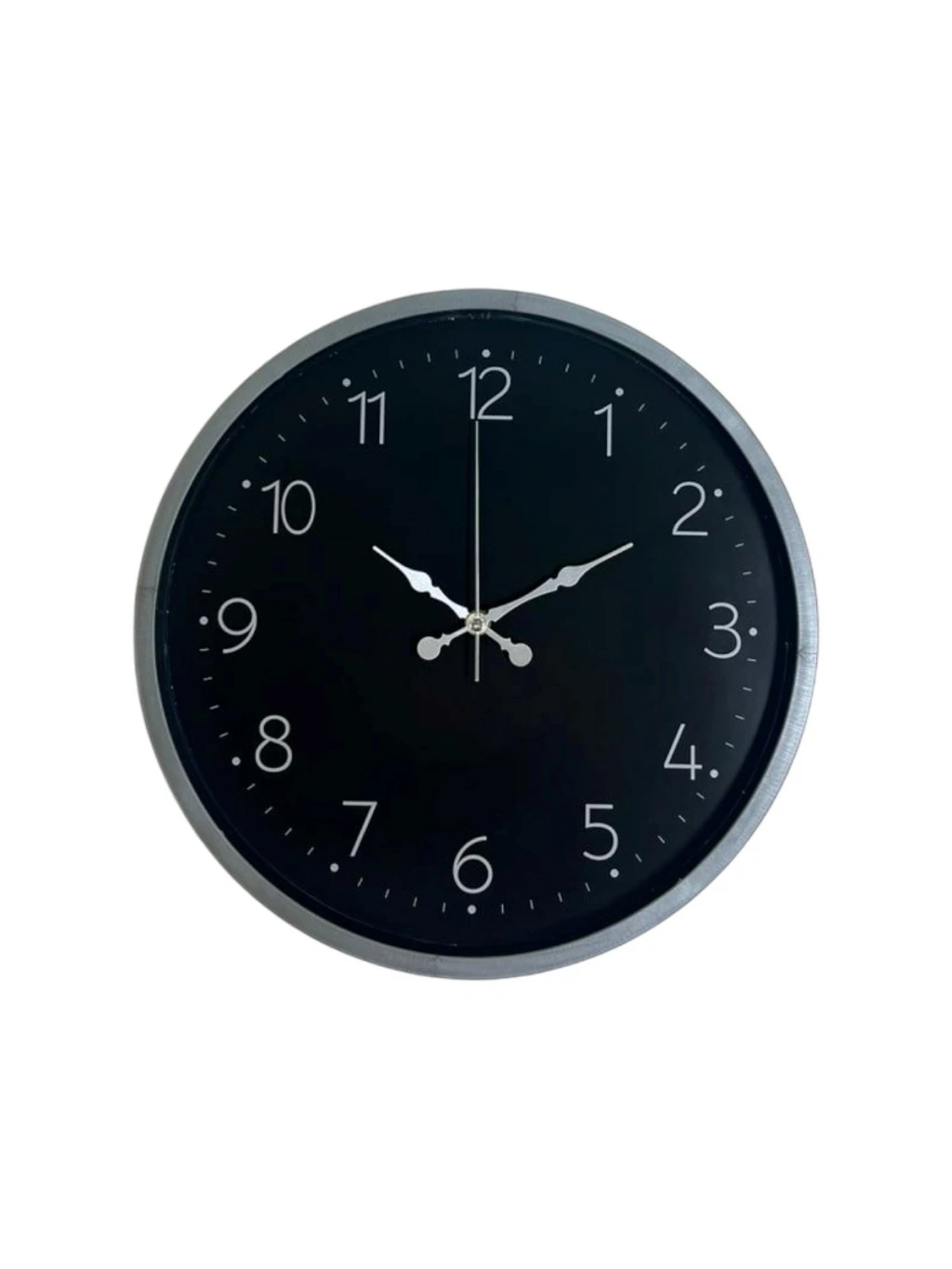 Siyah kadranı, kontrast oluşturan beyaz rakamları ve gri çerçevesiyle tasarlanan bu 36 cm duvar saati; modern, sade ve güçlü bir duruş sunar. Net rakam yapısı sayesinde uzaktan bile kolayca okunur ve günlük kullanımda pratiklik sağlar.