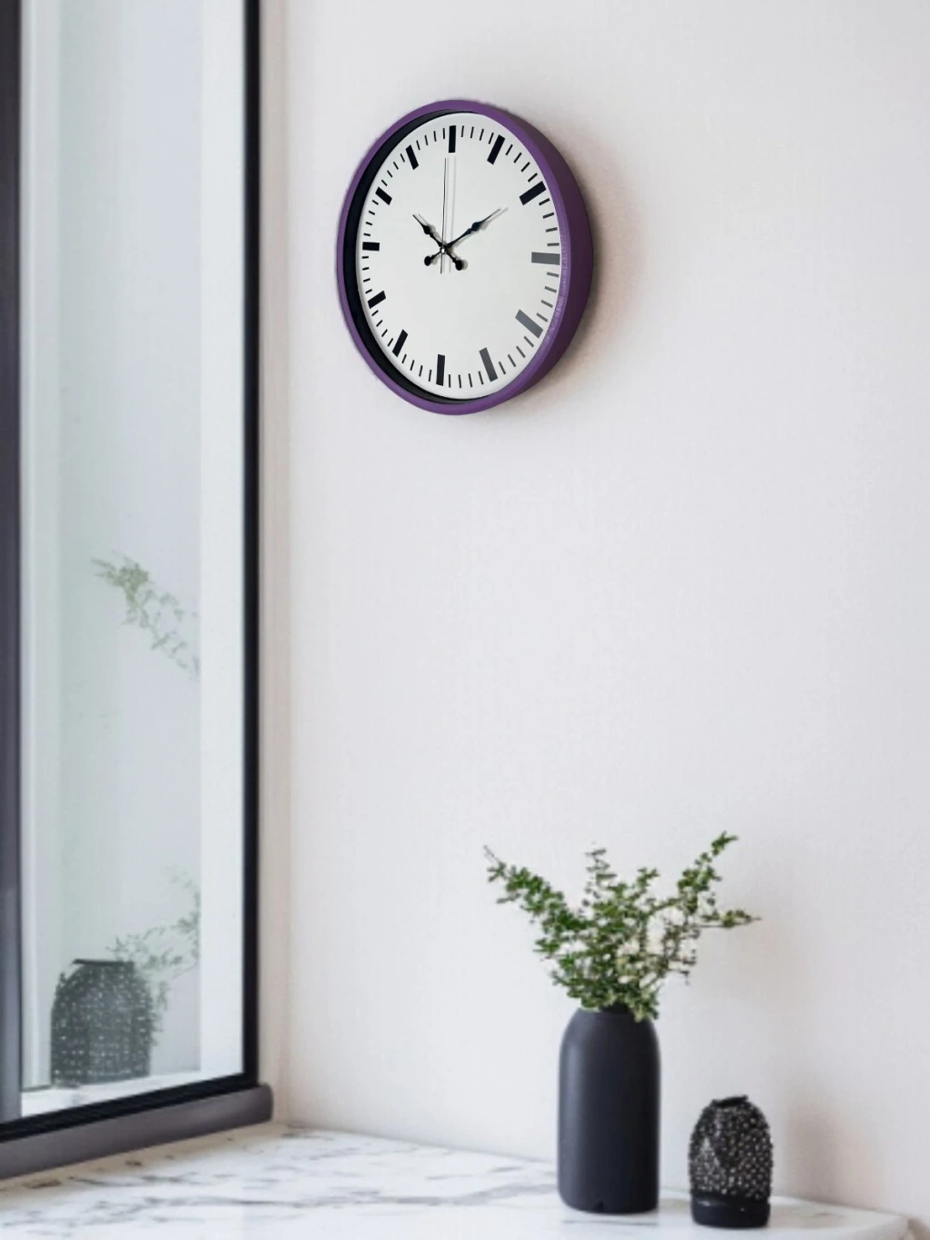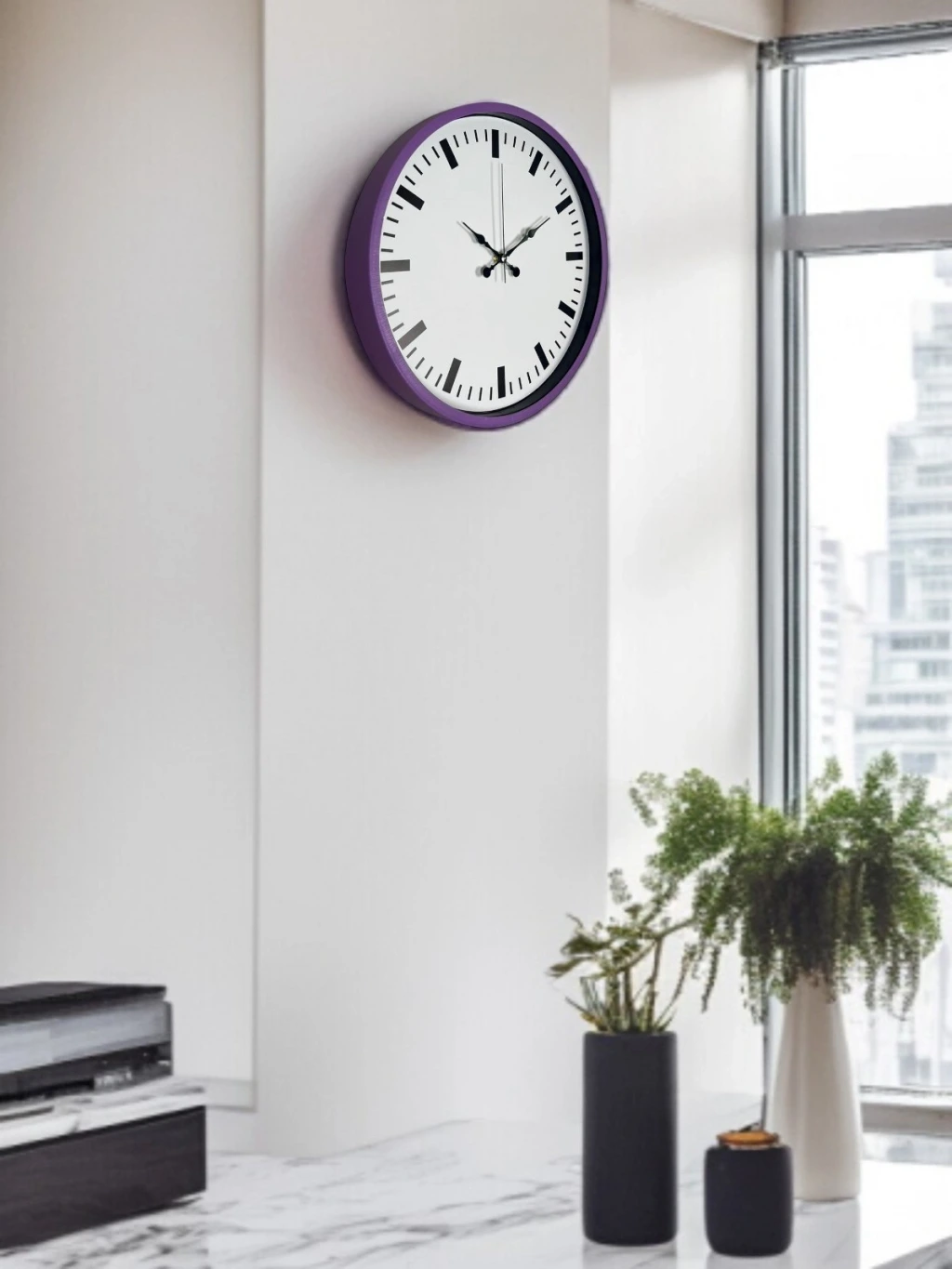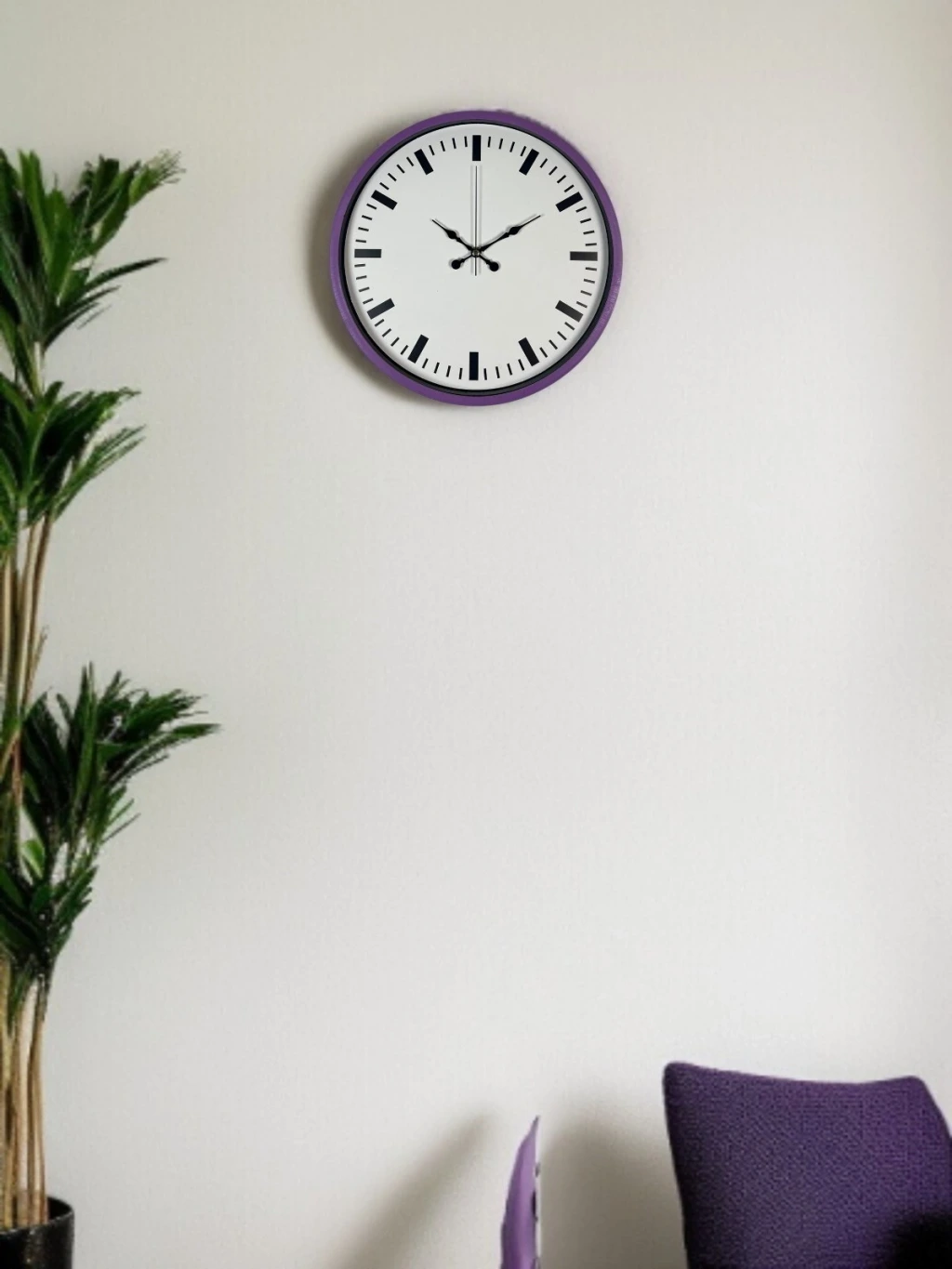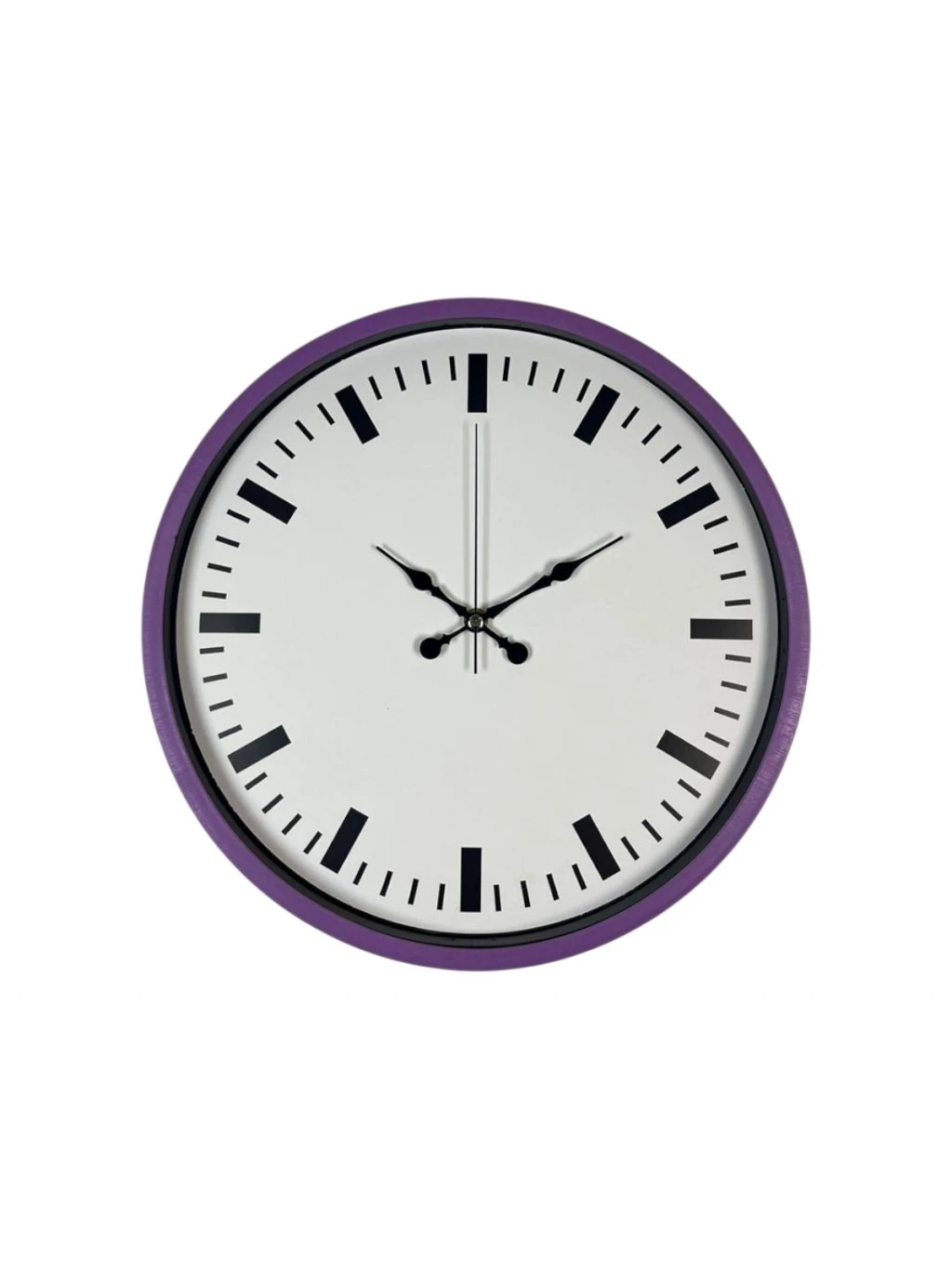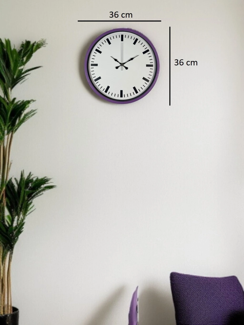 Şık mor çerçevesi ve sade beyaz kadranıyla tasarlanan bu 36 cm duvar saati, yaşam alanlarına modern ve farklı bir dokunuş kazandırır. Minimal indeks tasarımı ve net kontrastı sayesinde saati uzaktan dahi kolayca okumak mümkündür.