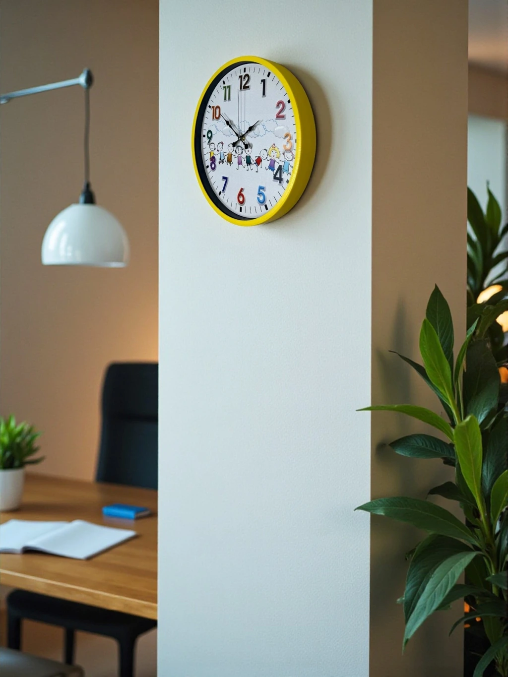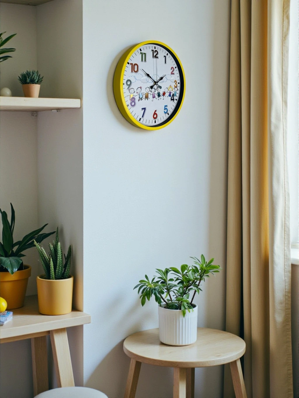 Canlı sarı çerçevesi, renkli rakamları ve sevimli çocuk figürleriyle tasarlanan bu 36 cm çocuk odası duvar saati, çocukların yaşam alanlarına neşe ve enerji katar. Eğlenceli kadran tasarımı sayesinde çocukların saat kavramını öğrenmesini desteklerken, odanın dekorasyonuna da sıcak bir dokunuş kazandırır.