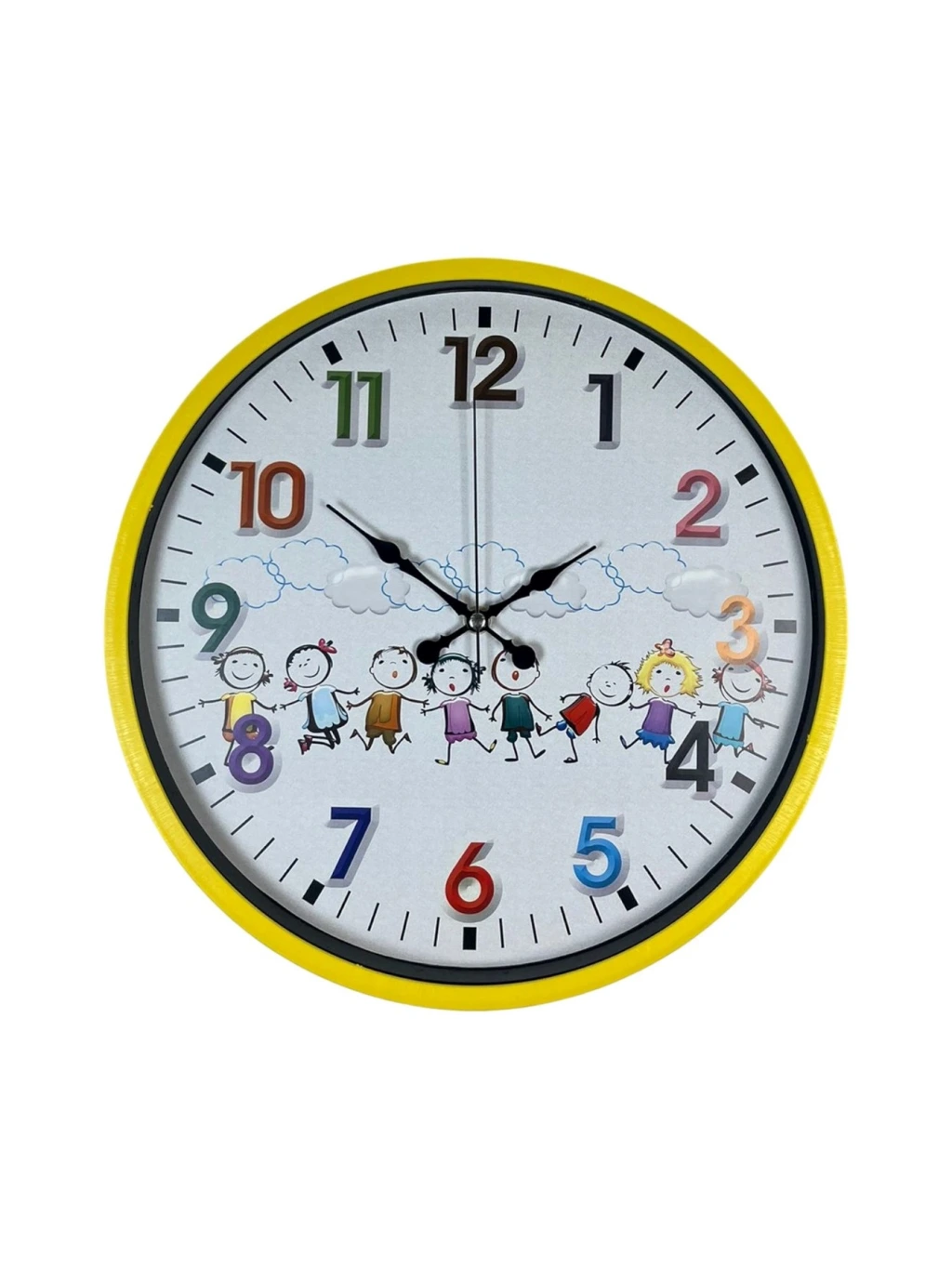 Büyük ve renkli rakamlar, çocukların saati kolayca okuyabilmesini sağlar. Kadran üzerinde yer alan bulutlar ve el ele tutuşan çocuk figürleri, ürünü hem dekoratif hem de eğitici hale getirir. Sessiz ve akıcı mekanizması, tik-tak sesi oluşturmadığı için çocukların uyku ve ders zamanlarında rahatsızlık vermez.
