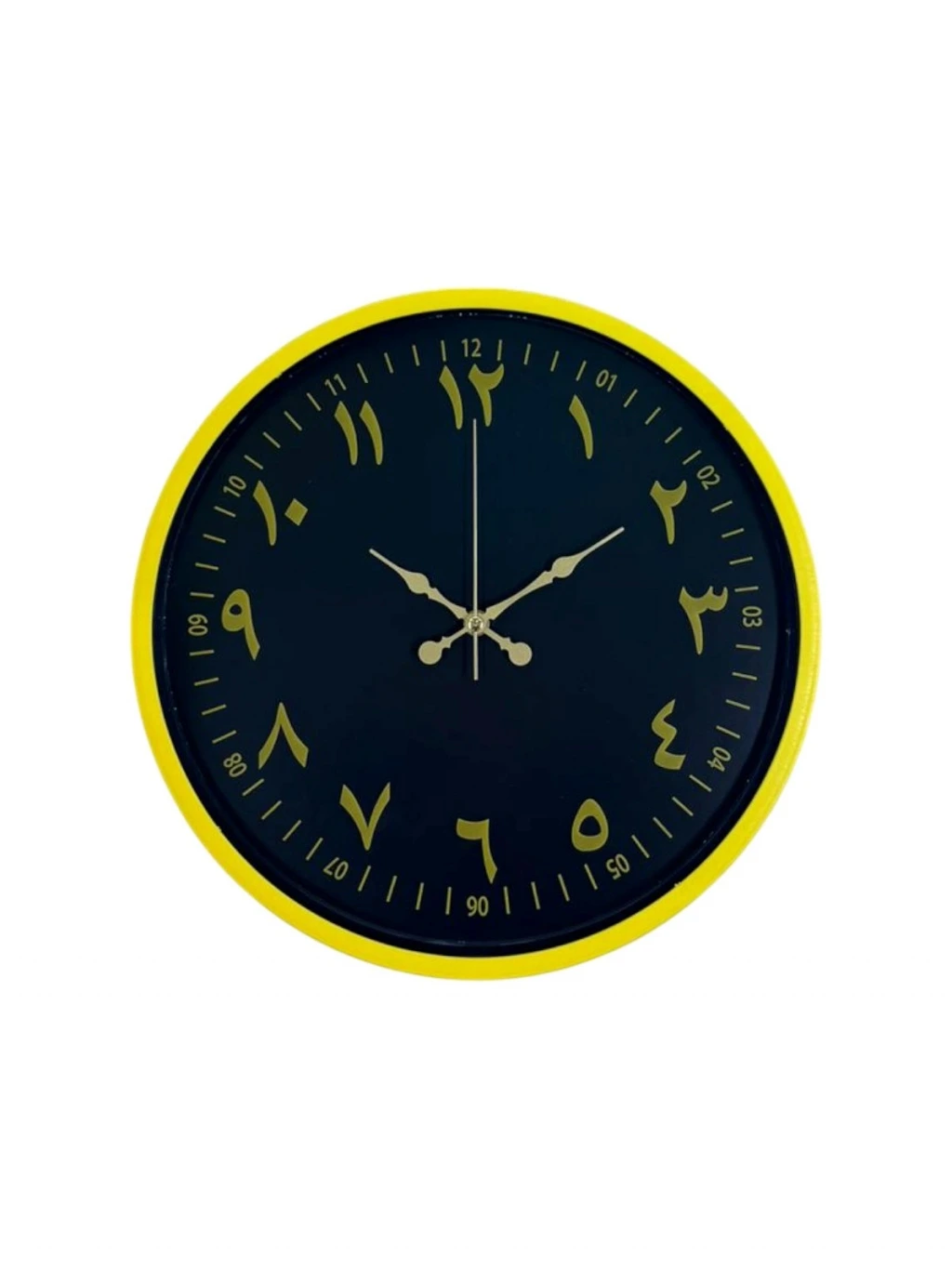Canlı sarı çerçevesi ve koyu renk kadranı üzerinde yer alan Arapça rakamları ile tasarlanan bu 36 cm duvar saati, klasik estetiği modern bir çizgiyle buluşturur. Altın tonlu rakamlar ve akrep-yelkovanlar, yüksek kontrast sayesinde saati uzaktan dahi net biçimde okunur kılar.