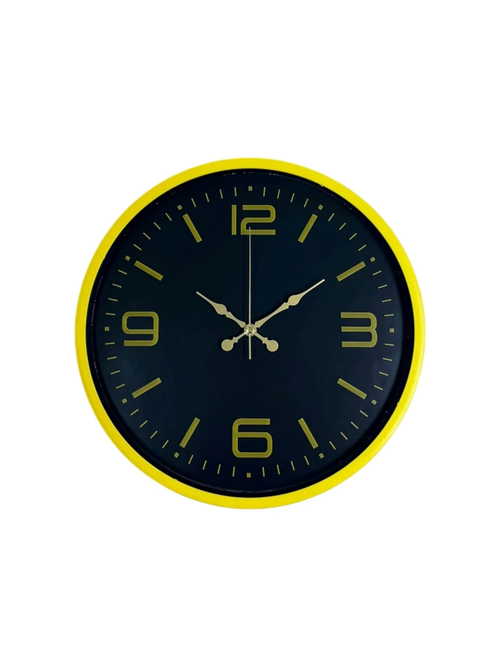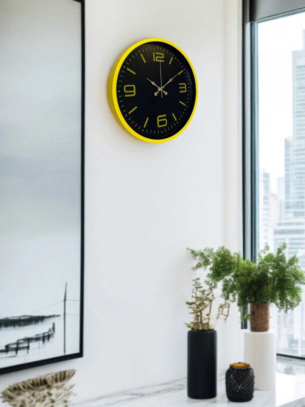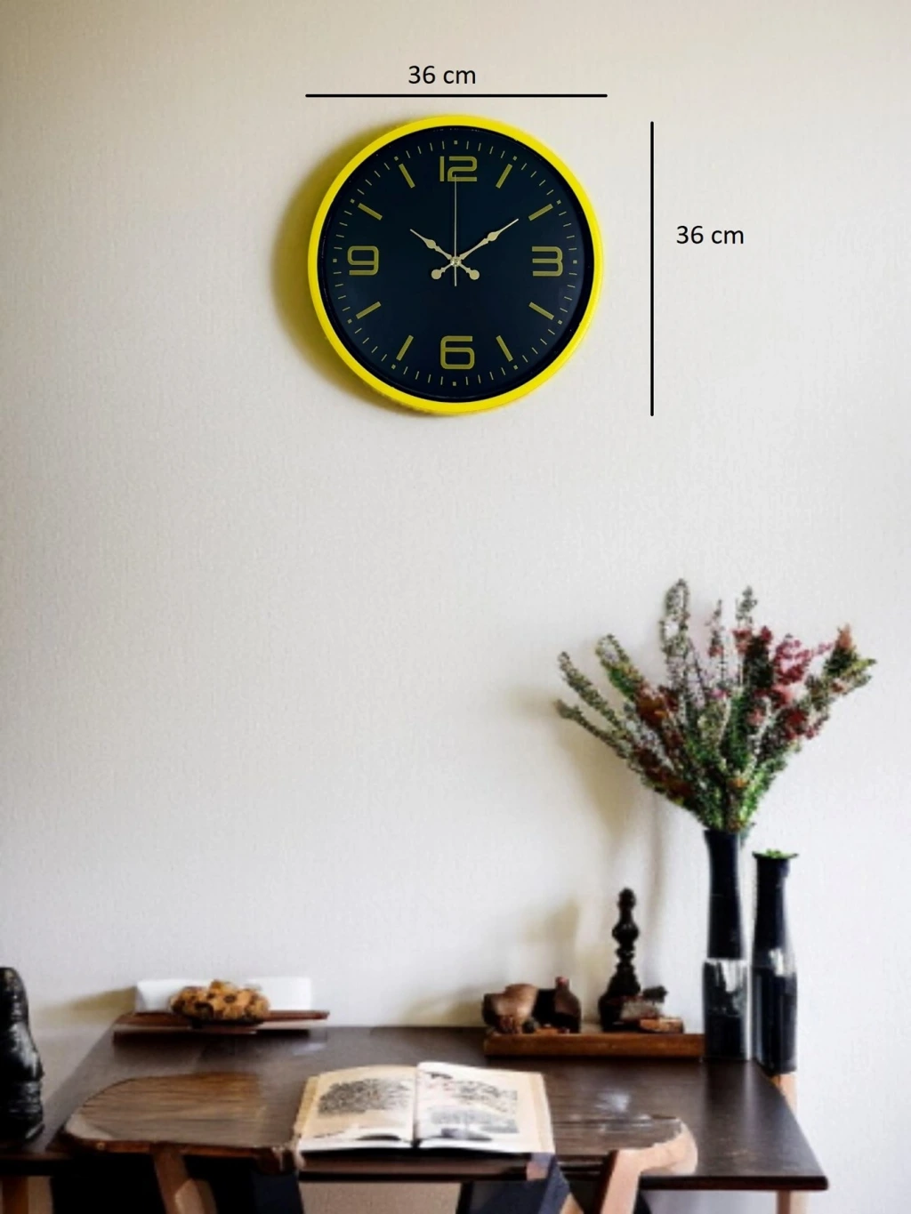Canlı sarı çerçevesi ve koyu renk kadran tasarımıyla öne çıkan bu 36 cm duvar saati, bulunduğu ortama enerji ve modern bir karakter kazandırır. Altın tonlu rakamları ve kontrastlı kadran yapısı sayesinde saati uzaktan bile rahatlıkla okumak mümkündür.