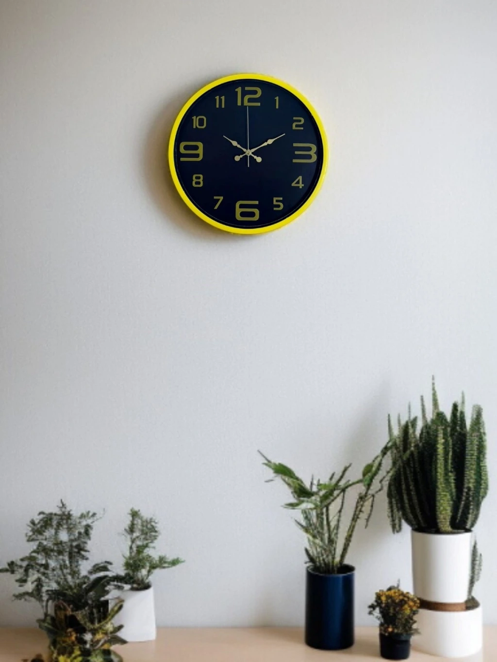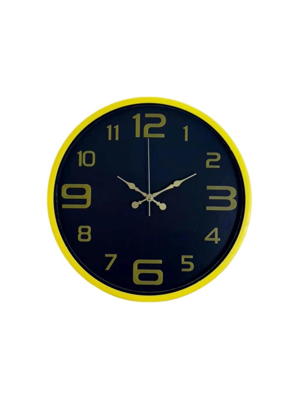 Canlı sarı çerçevesi ve koyu renk kadran tasarımıyla öne çıkan bu 36 cm duvar saati, bulunduğu ortama enerji ve modern bir karakter kazandırır. Altın tonlu rakamları ve kontrastlı kadran yapısı sayesinde saati uzaktan bile rahatlıkla okumak mümkündür.