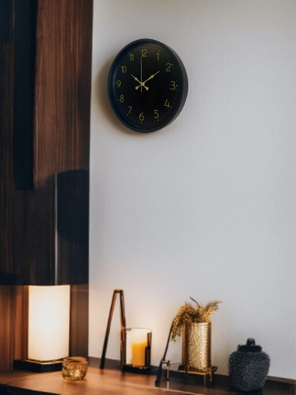 Minimal tasarımı ve asil siyah rengiyle öne çıkan bu 36 cm duvar saati, modern ve klasik dekorasyonlara kusursuz şekilde uyum sağlar. Gold tonlu rakamları ve zarif akrep-yelkovan tasarımı sayesinde saat net bir şekilde okunur ve bulunduğu ortama sofistike bir hava katar.