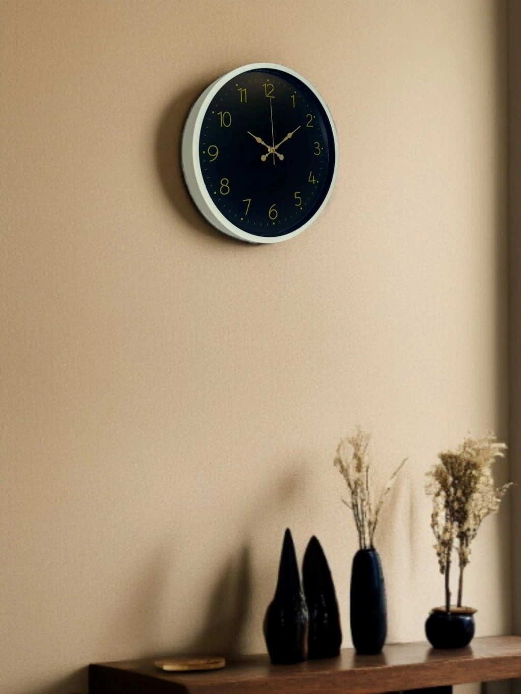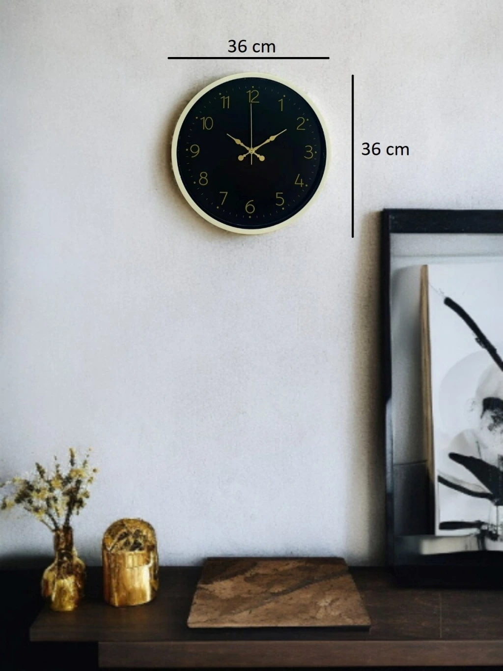 Krem renkli çerçevesi ile koyu zemin üzerindeki gold tonlu rakamları ve zarif akrep-yelkovan tasarımı sayesinde bu 36 cm duvar saati, bulunduğu ortama klasik ve sofistike bir hava katar. Net ve dengeli kadran yapısı, saatin her açıdan rahatlıkla okunmasını sağlar. Hem modern hem de klasik dekorasyon stilleriyle uyumlu, zamansız bir tasarıma sahiptir.