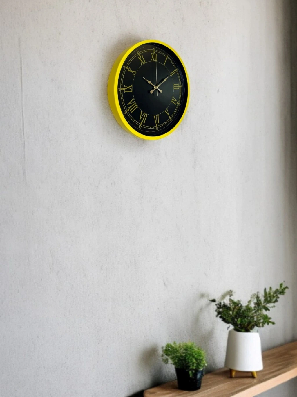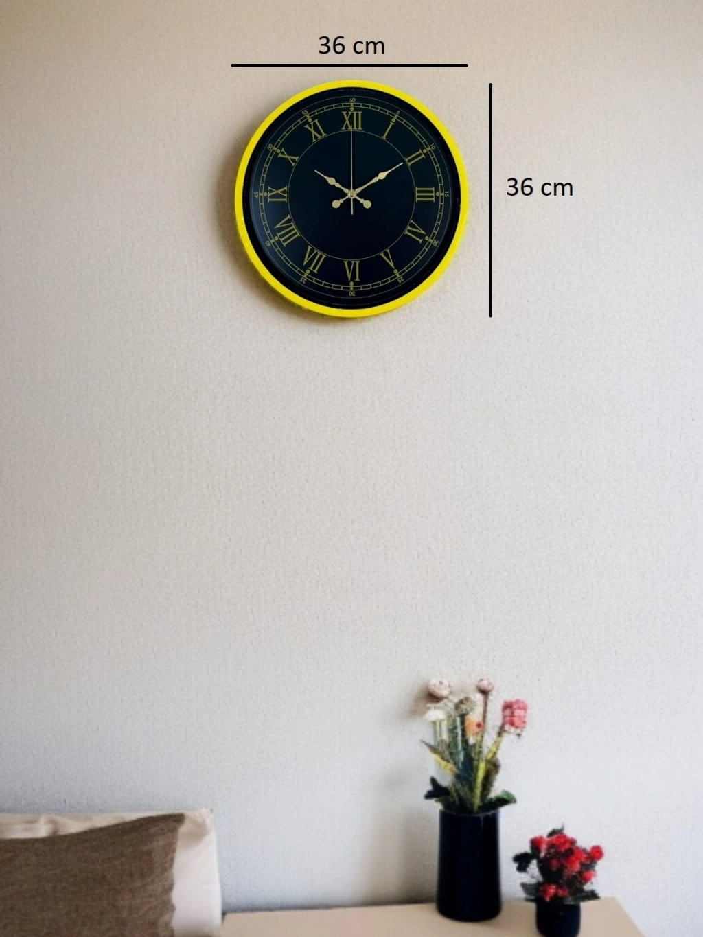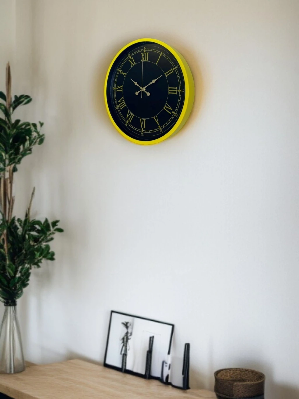 Canlı sarı çerçevesi ve siyah zemin üzerine gold Roma rakamlı tasarımıyla bu 36 cm duvar saati, bulunduğu ortama enerjik ve şık bir hava katar. Kontrast renk uyumu sayesinde hem uzaktan kolay okunur hem de dekoratif bir odak noktası oluşturur.
