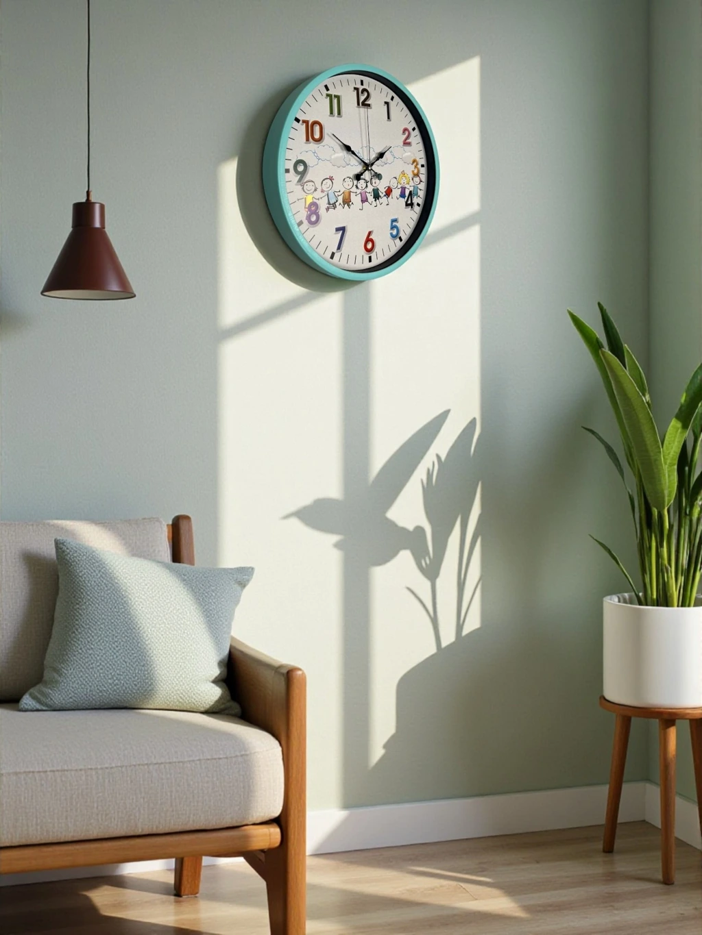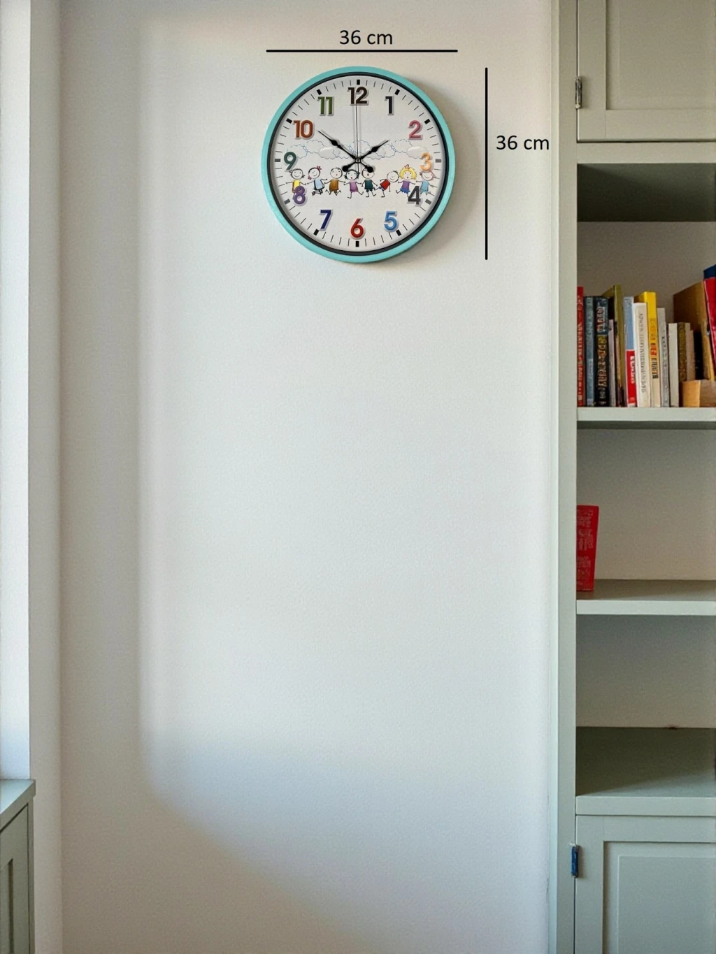 Çocuk odaları, oyun alanları ve anaokulu sınıfları için ideal bir duvar saatidir.