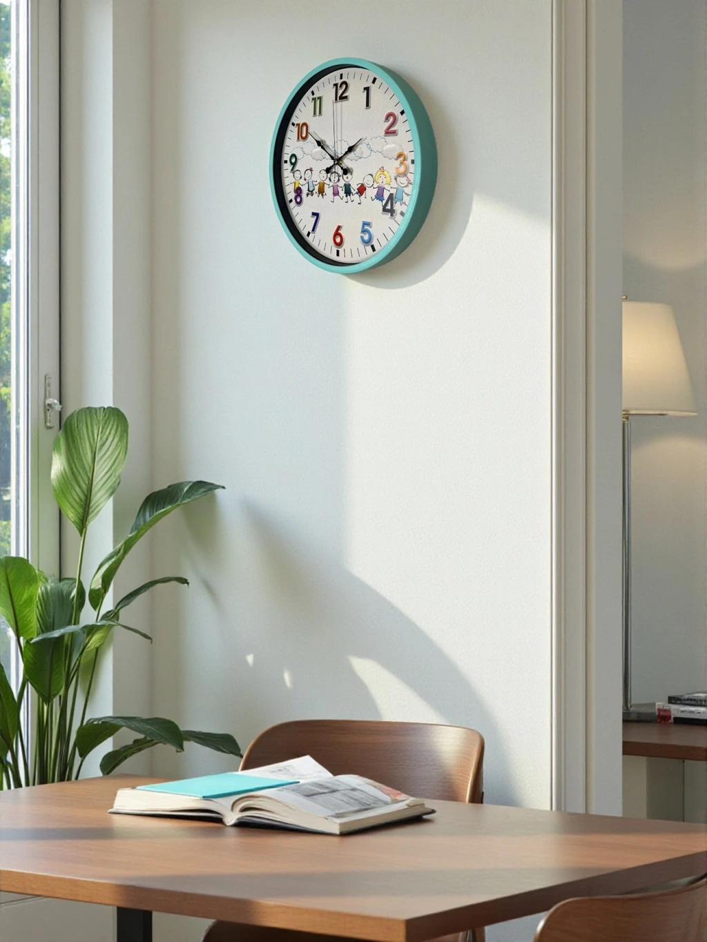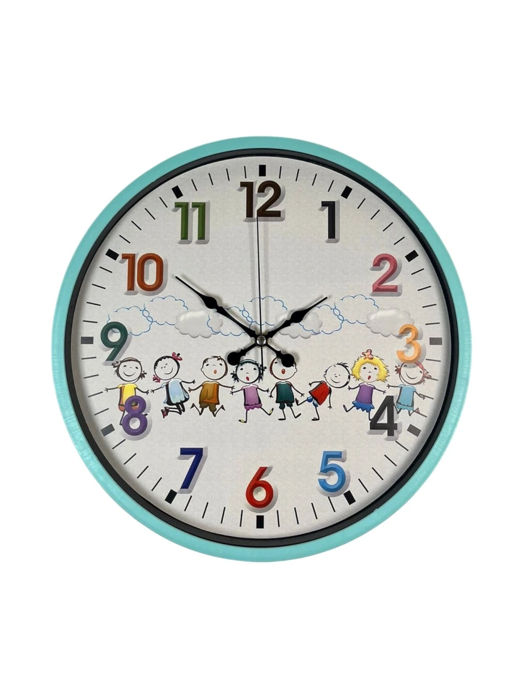 Renkli rakamları ve sevimli çocuk figürleriyle tasarlanan bu 36 cm turkuaz duvar saati, çocuk odalarına neşe ve hareket katar. Eğlenceli kadran tasarımı sayesinde çocukların saati öğrenmesini kolaylaştırırken, odanın dekorasyonuna da canlı bir dokunuş sağlar.