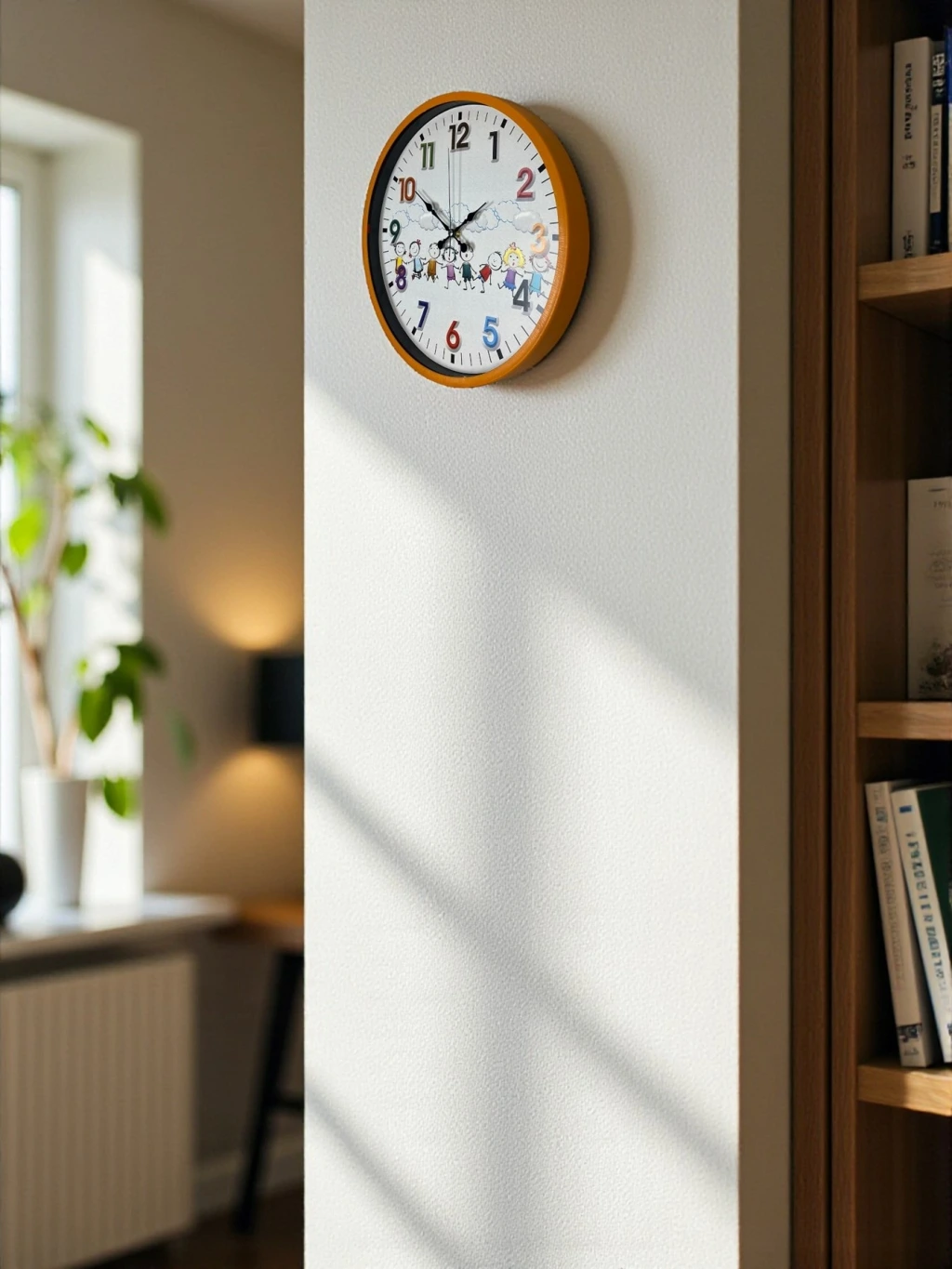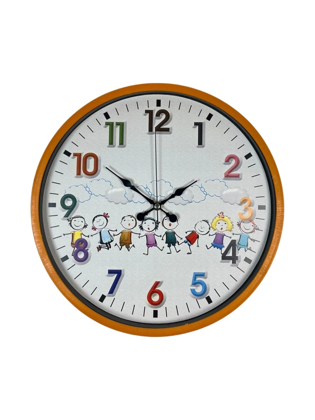 Canlı turuncu çerçevesi, renkli rakamları ve sevimli çocuk figürleriyle tasarlanan bu 36 cm duvar saati, çocuk odalarına enerji ve neşe katar. Eğlenceli kadran tasarımı sayesinde çocukların saati öğrenmesini desteklerken, odanın dekorasyonunu da tamamlar.