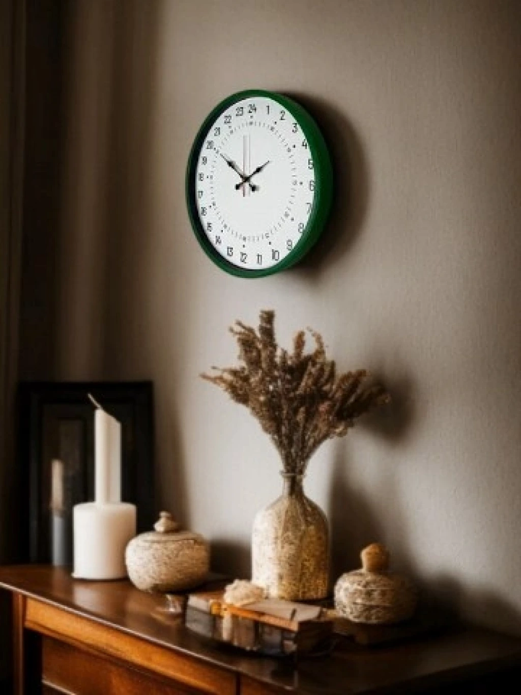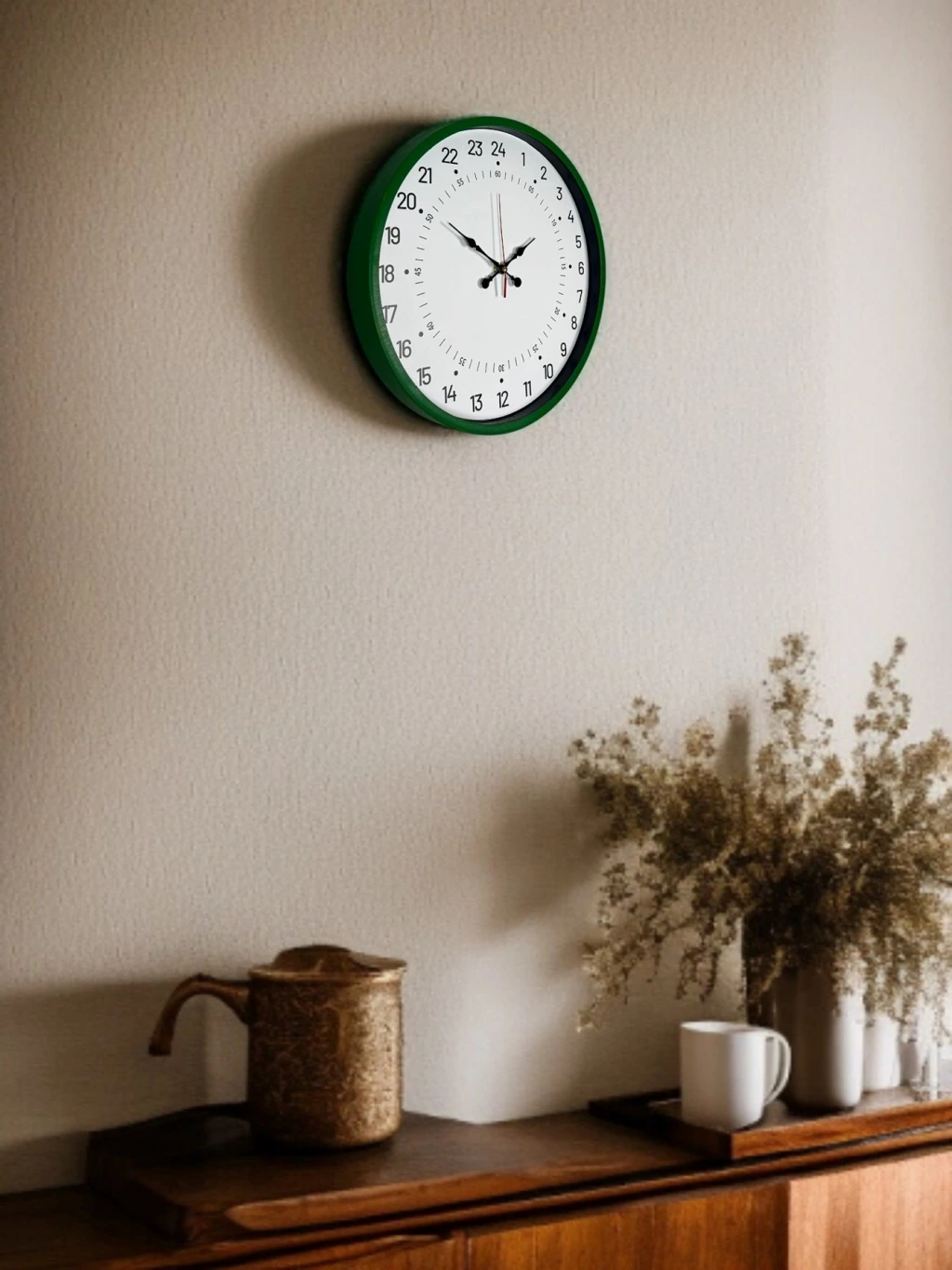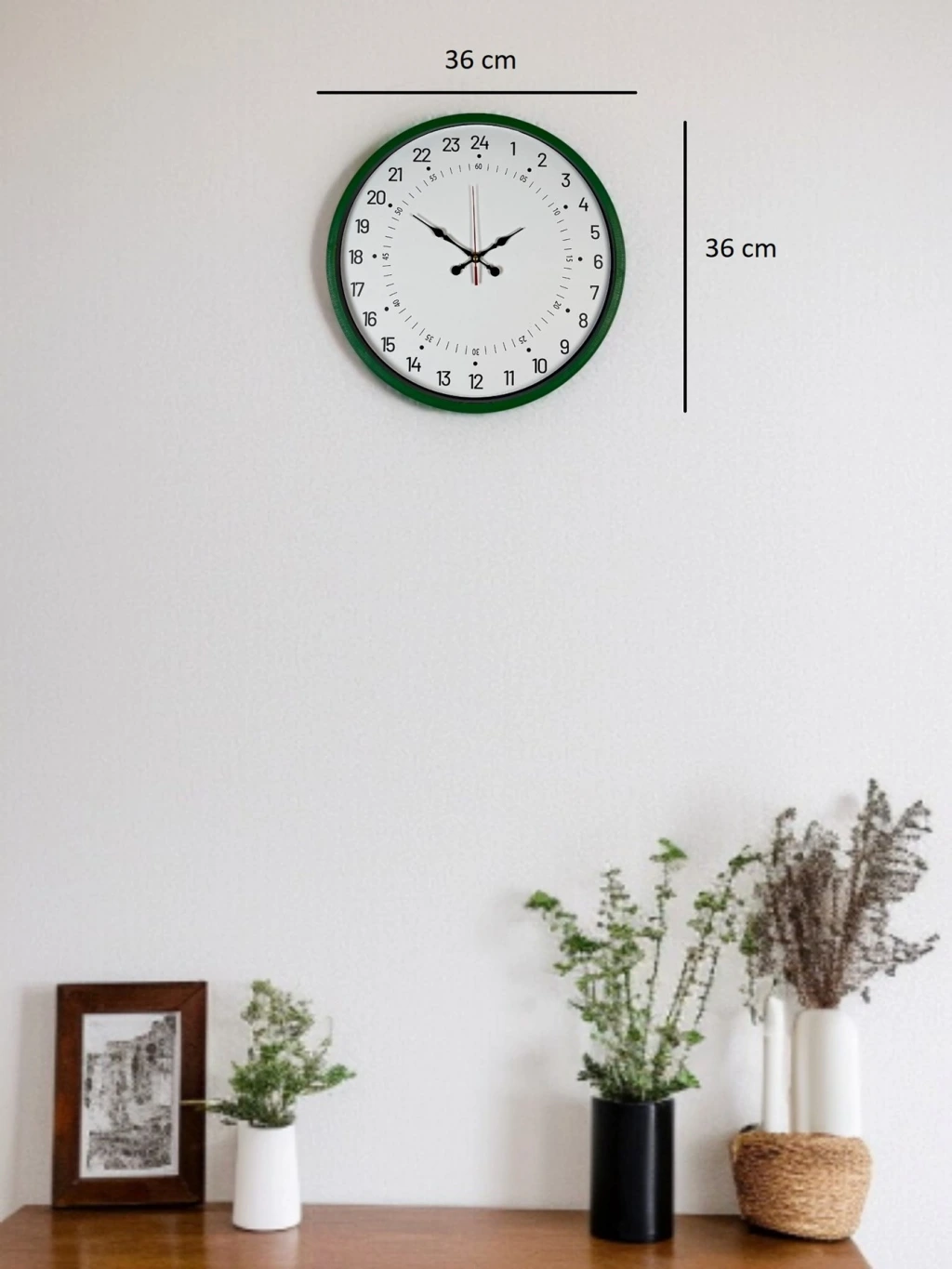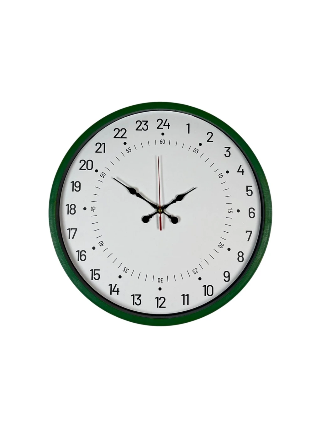 Yeşil çerçevesi ve sade beyaz kadranıyla tasarlanan bu 36 cm duvar saati, 24 saatlik (1–24) zaman gösterimi sayesinde klasik duvar saatlerinden ayrılır. Günün tüm saatlerini tek kadranda net şekilde sunarak özellikle vardiyalı çalışma düzeni olan alanlarda ve zamanı daha bilinçli takip etmek isteyen kullanıcılar için ideal bir kullanım sağlar.