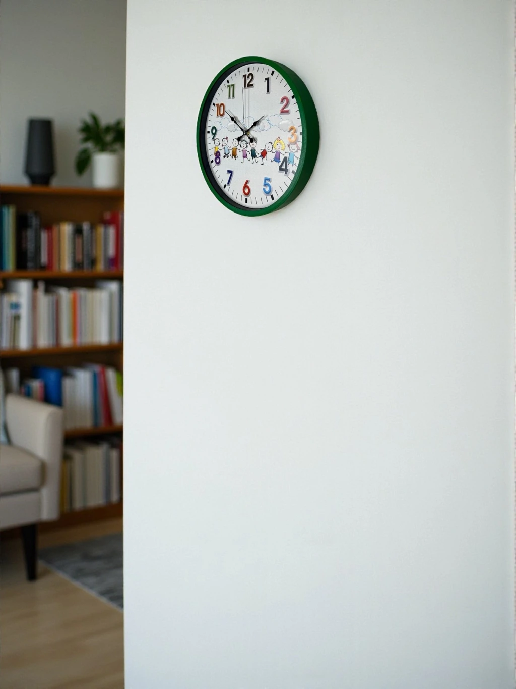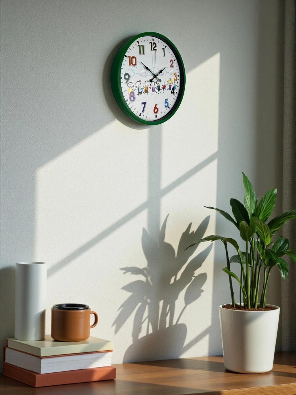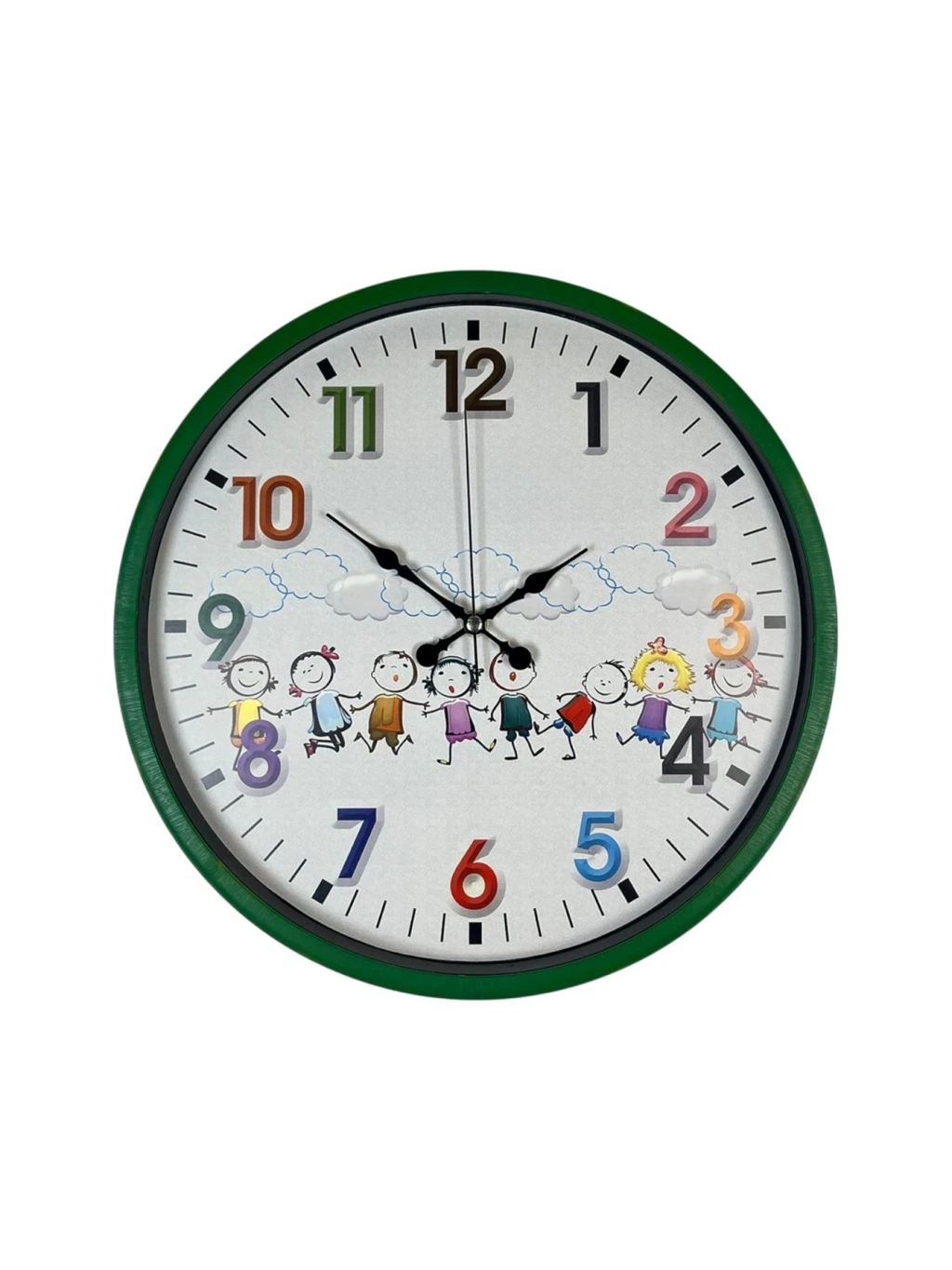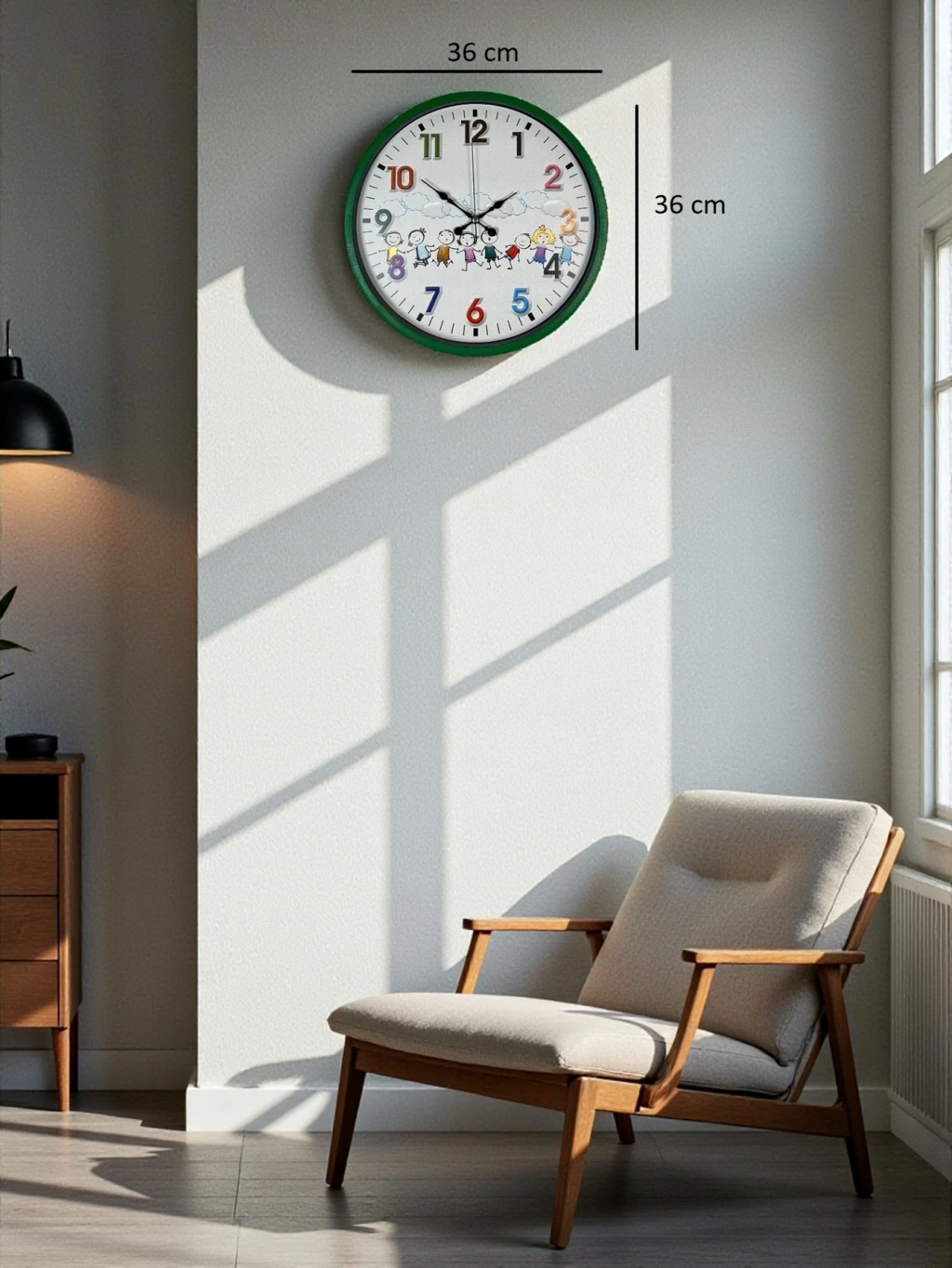 Yeşil çerçevesi, renkli rakamları ve sevimli çocuk figürleriyle tasarlanan bu 36 cm çocuk odası duvar saati; miniklerin ilgisini çeken neşeli tasarımıyla odalara canlılık katar. Renkli ve büyük rakamlar sayesinde çocukların saat öğrenmesini kolaylaştırır, eğlenceli bir öğrenme deneyimi sunar.