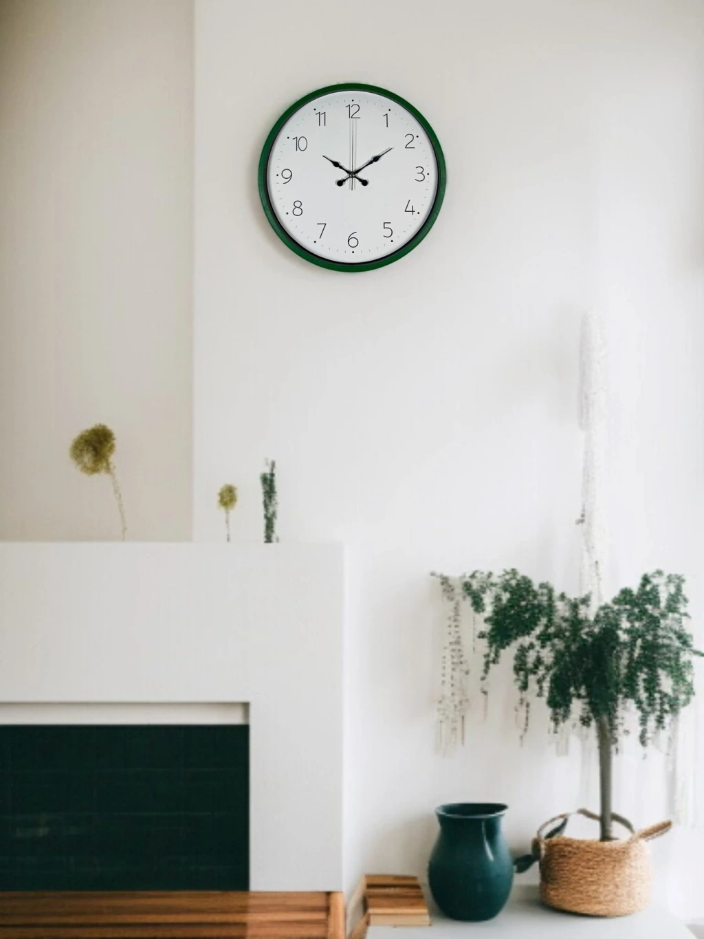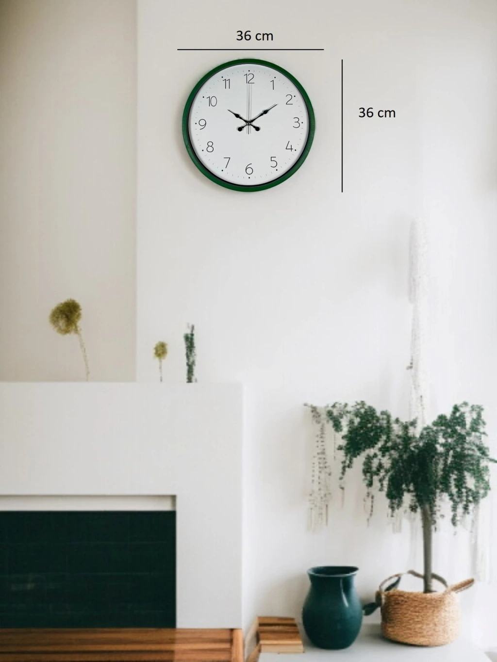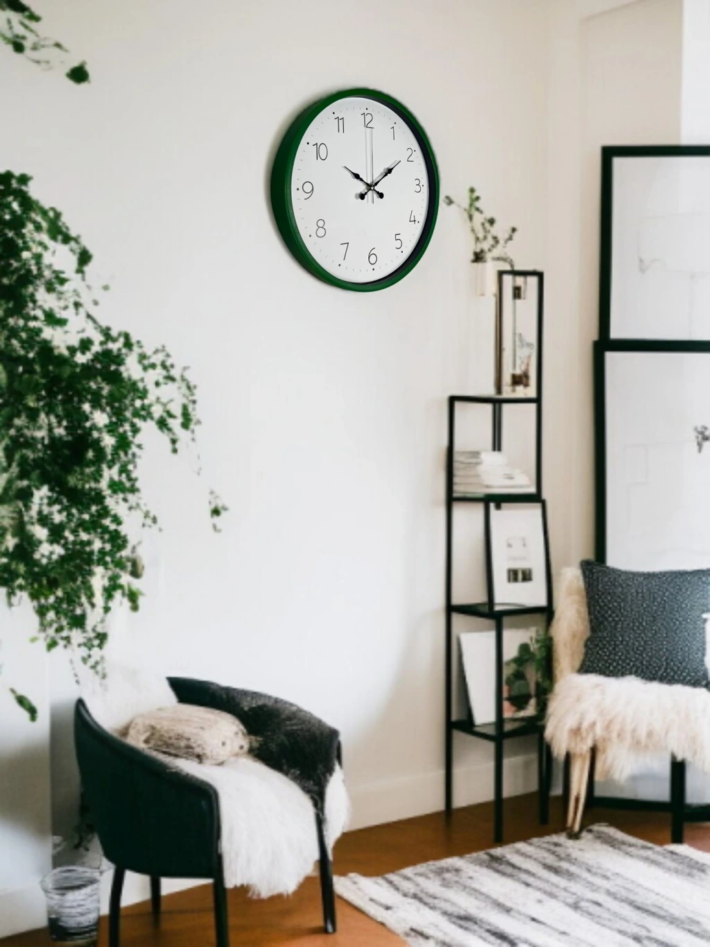 Doğanın ferahlığını ve modern tasarımı bir araya getiren bu 36 cm yeşil duvar saati, yaşam alanlarına taze ve canlı bir dokunuş katmak isteyenler için ideal bir seçimdir. Yeşil çerçevesi sayesinde mekânlara enerji, sıcaklık ve modern bir hava katar. Geniş beyaz kadranı, büyük siyah rakamları ve detaylı dakika göstergeleri (05, 10, 15...) sayesinde saati uzaktan dahi net bir şekilde okumayı kolaylaştırır. Hem dekoratif hem de fonksiyonel bir duvar saati arayanlar için mükemmel bir modeldir.