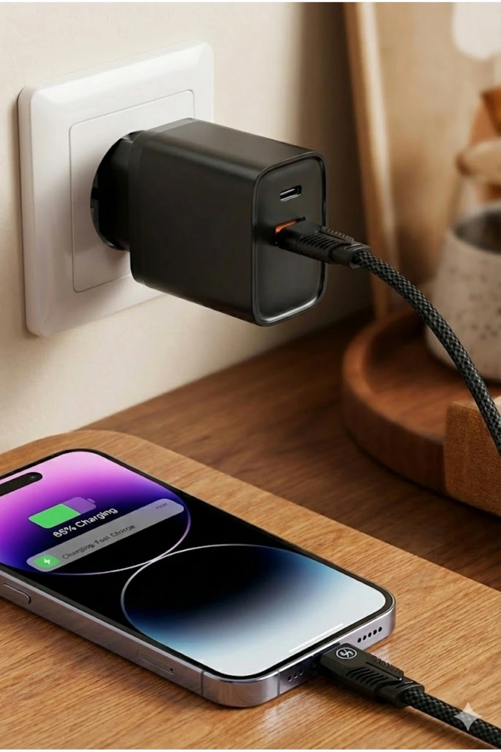65W Süper Hızlı Şarj Cihazı | Dahili Type-C Kablo | USB-C & USB-A Çıkış | Çoklu Cihaz Desteği
