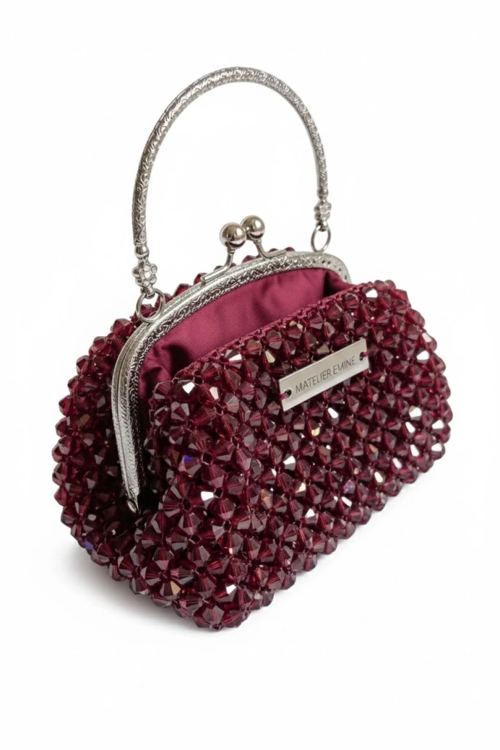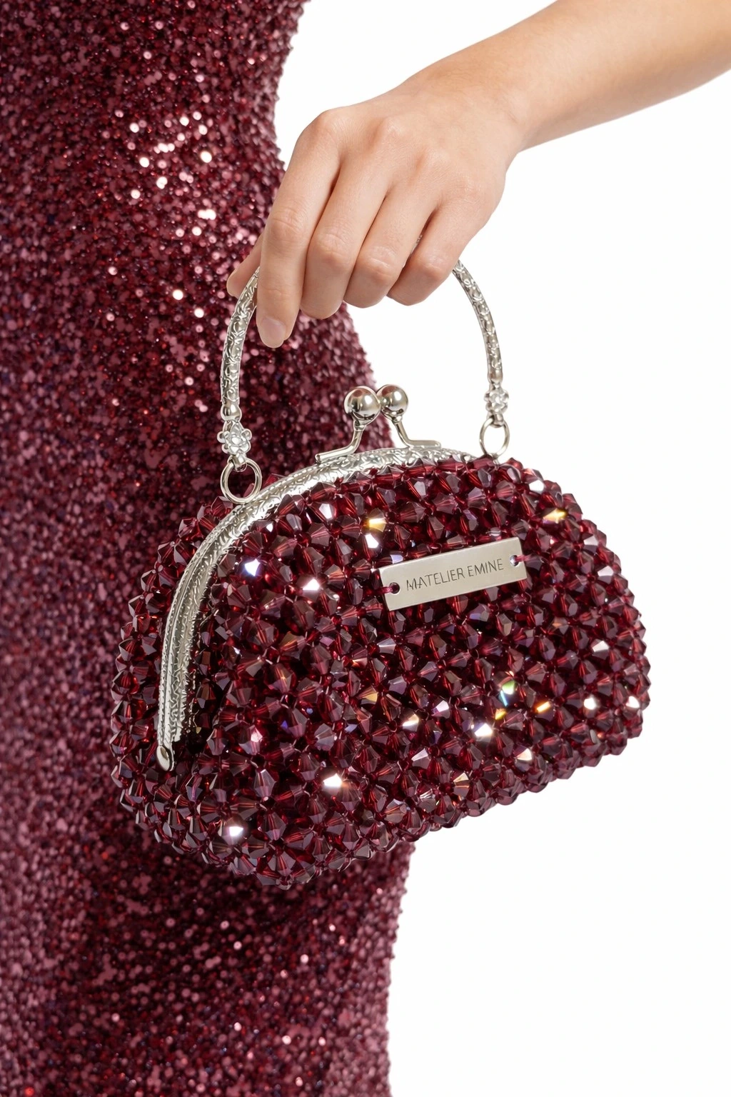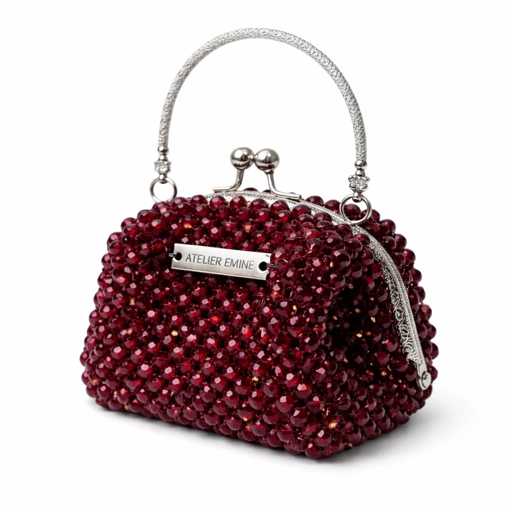 Atelier Emine’in Crystal Gelato Couture koleksiyonuna ait Affogato Granata, 8 mm optik sınıfı kristal boncukların yüksek dayanımlı misina ile tek tek örülmesiyle üretilmiş, metal çerçeve yapıya sahip premium mini çanta modelidir.
