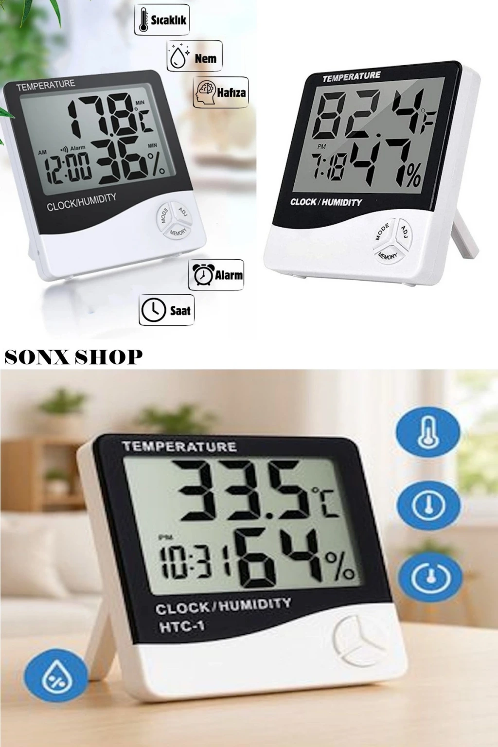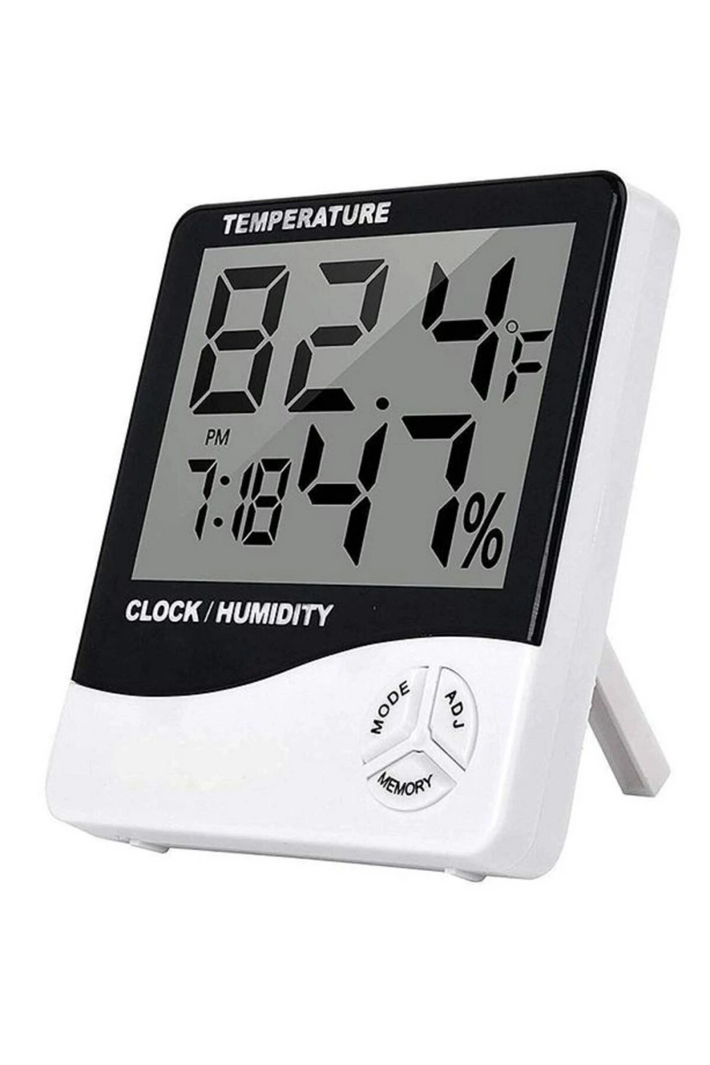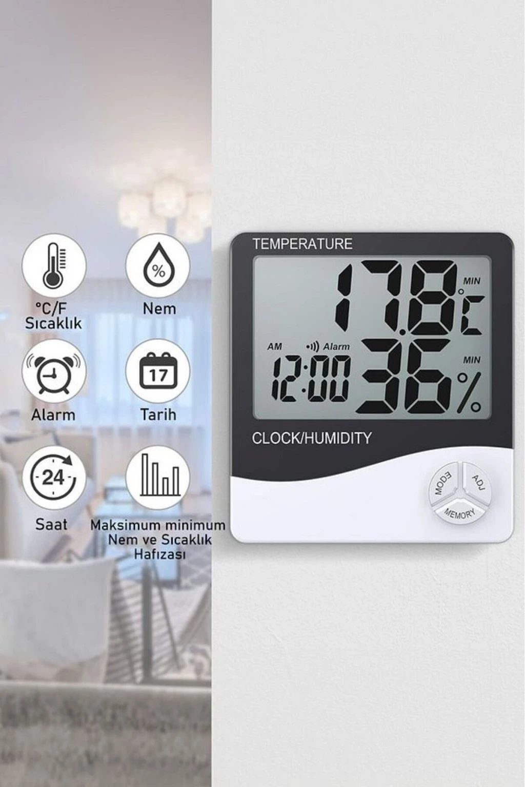 İç ve Dış Ortam Sıcaklığını Ölçebilen LCD Ekran Saat Göstergeli Alarmlı Nem Ölçer Termometre