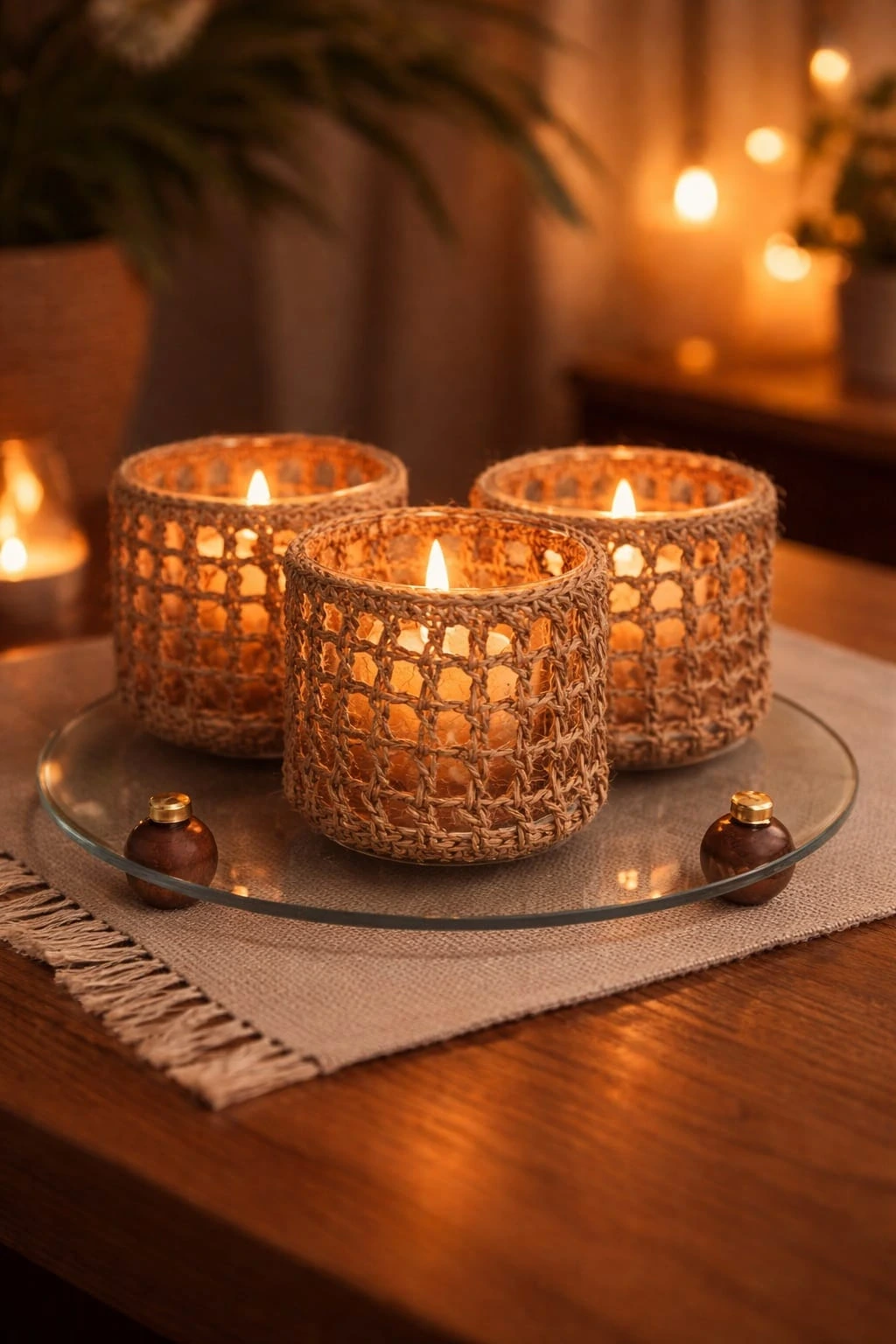 Amber Glow Hasır Mumluk Set – El Yapımı Ev Dekorasyonu