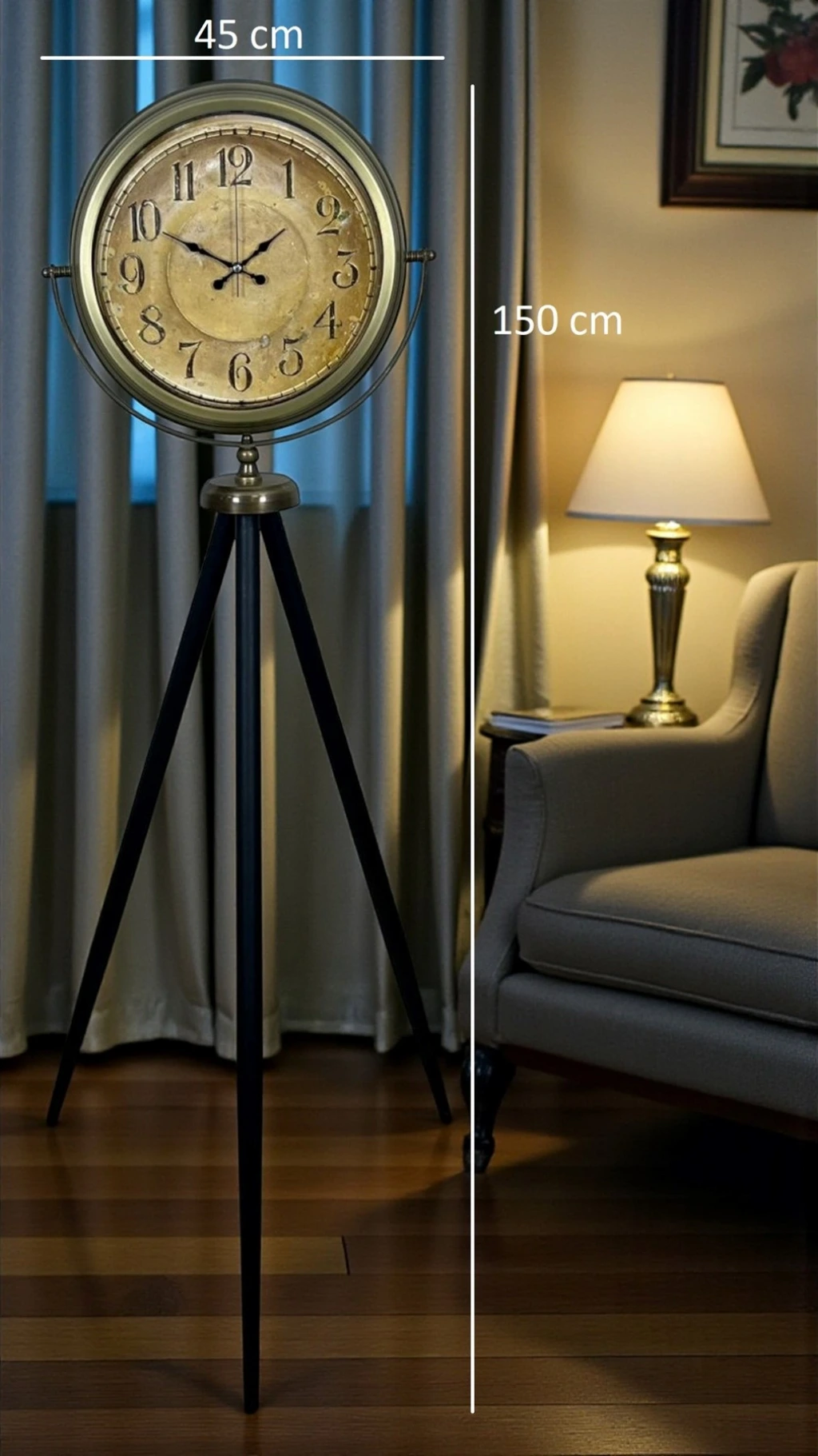 ✅ Tripod Ayaklı Yer Saati: Dengeli yapı, dekoratif ve modern bir sunum.