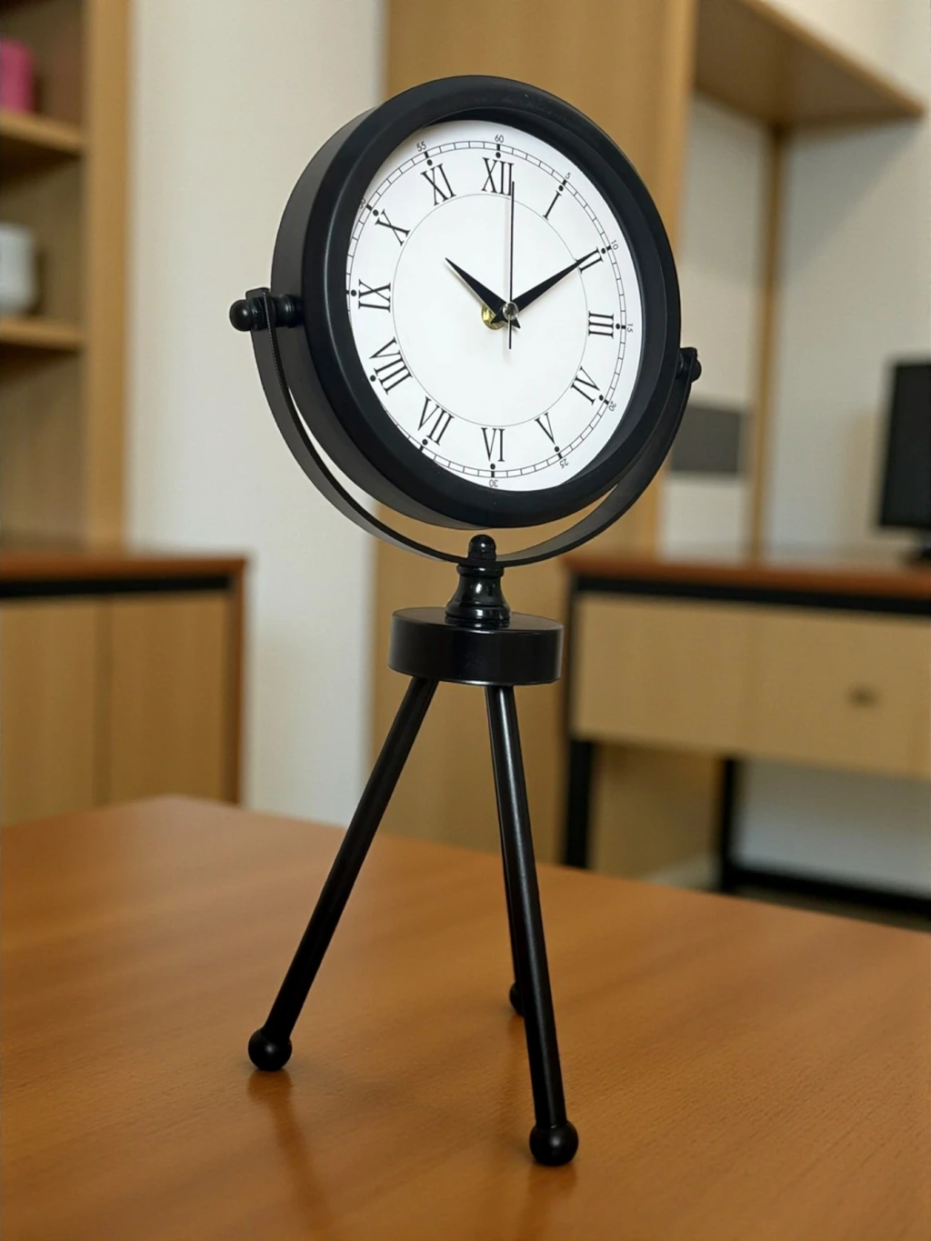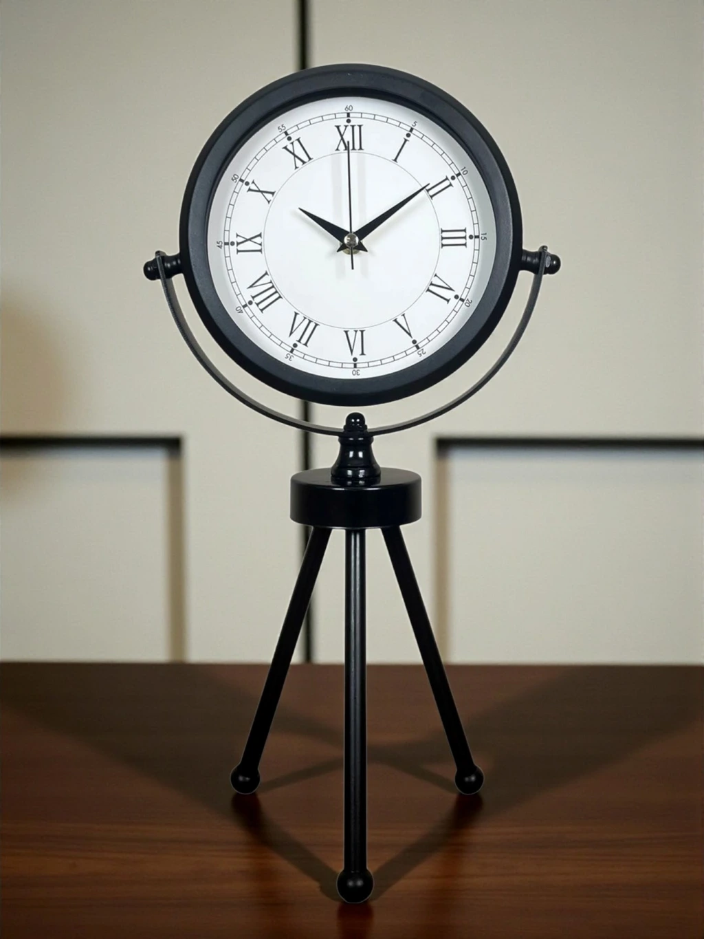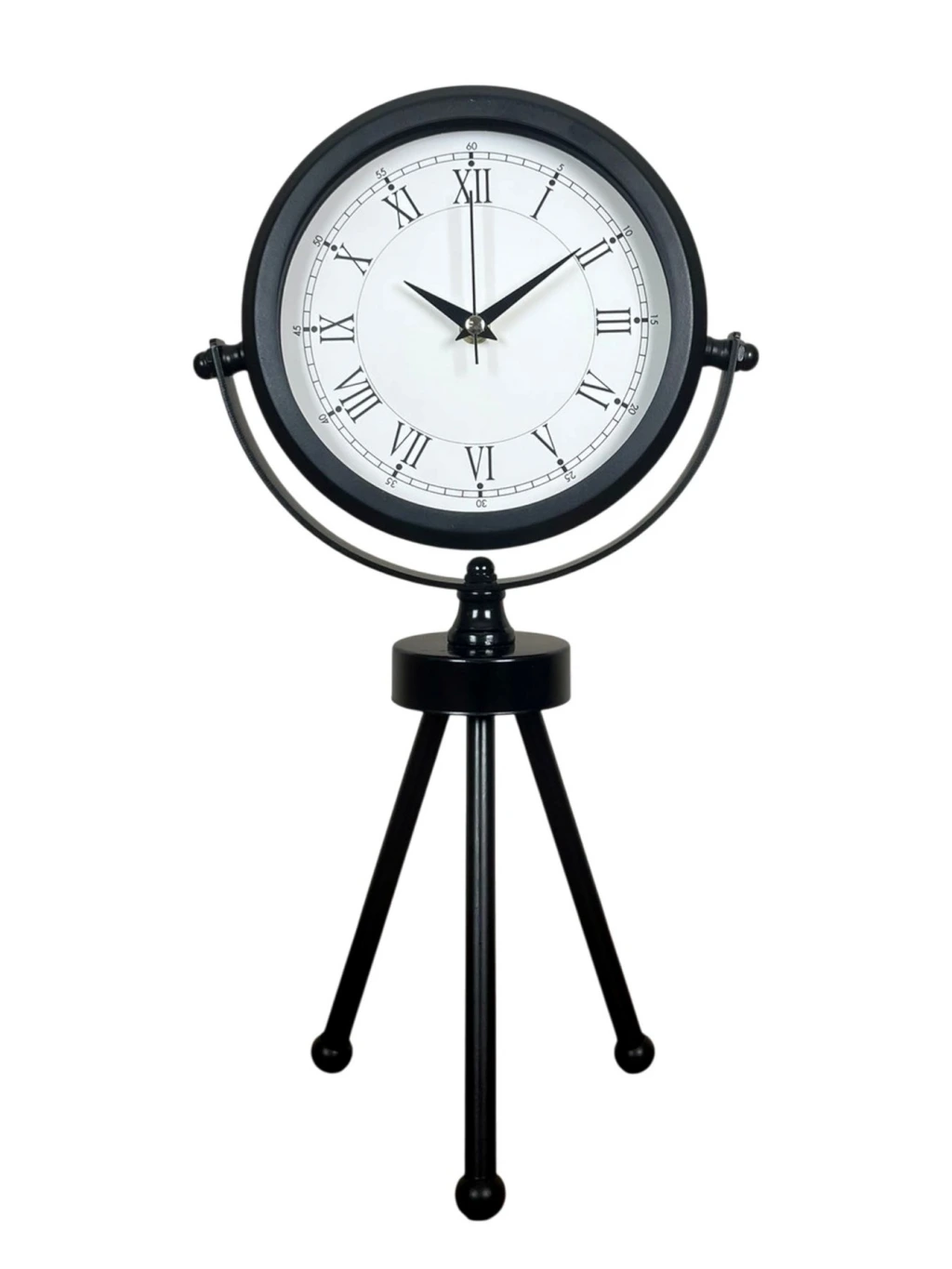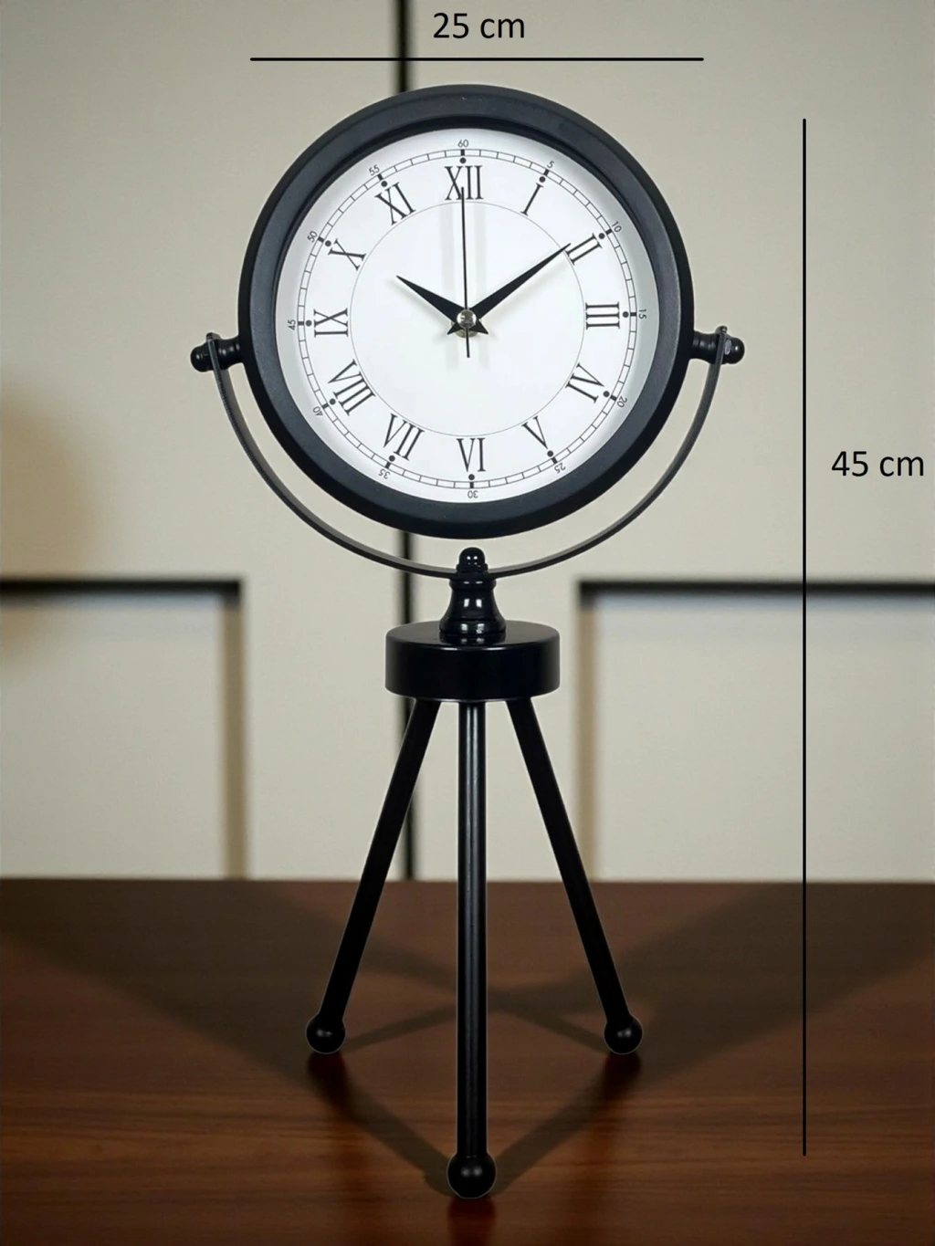 45 x 25 cm ölçülerindeki bu modern siyah üç ayaklı masa saati, minimal tasarımı ve güçlü duruşuyla her ortama şıklık katar. Gerçek cam korumalı kadranı sayesinde net görüntü ve uzun ömürlü kullanım sağlar. Tamamen metal gövdesi ve tripod ayak yapısıyla sağlam, dekoratif ve premium bir görünüm sunar. Sessiz akar saniye mekanizmasıyla ev, ofis ve çalışma alanlarında rahatsızlık vermeden kullanılabilir.