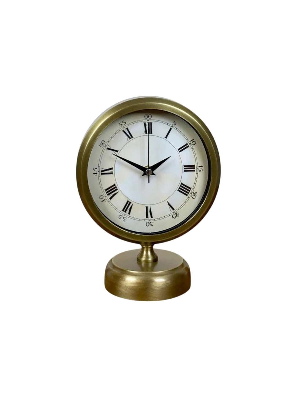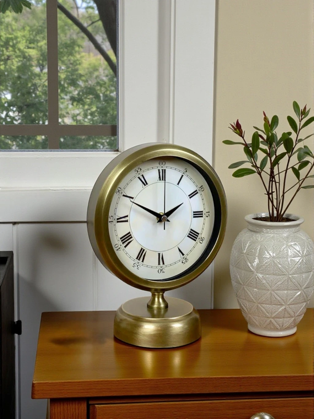 Klasik tasarımın zarafetini yansıtan bu eskitme vintage masa saati, Roma rakamlı kadranı ve beyaz zemin tasarımıyla zamansız bir estetik sunar. Eskitme metal çerçevesi, saate nostaljik ve karakterli bir görünüm kazandırırken; sade detayları sayesinde modern ve klasik dekorasyonlarla uyum içinde kullanılabilir.