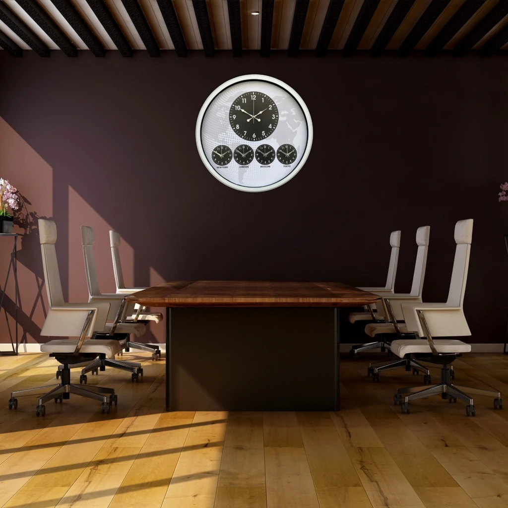 Merkezde bulunan büyük ana saat net ve kolay okunabilir yapı sunarken, alt bölümde yer alan New York – London – Moscow – Tokyo zaman göstergeleri uluslararası bağlantıları olan işletmeler için fonksiyonel bir kullanım sağlar.