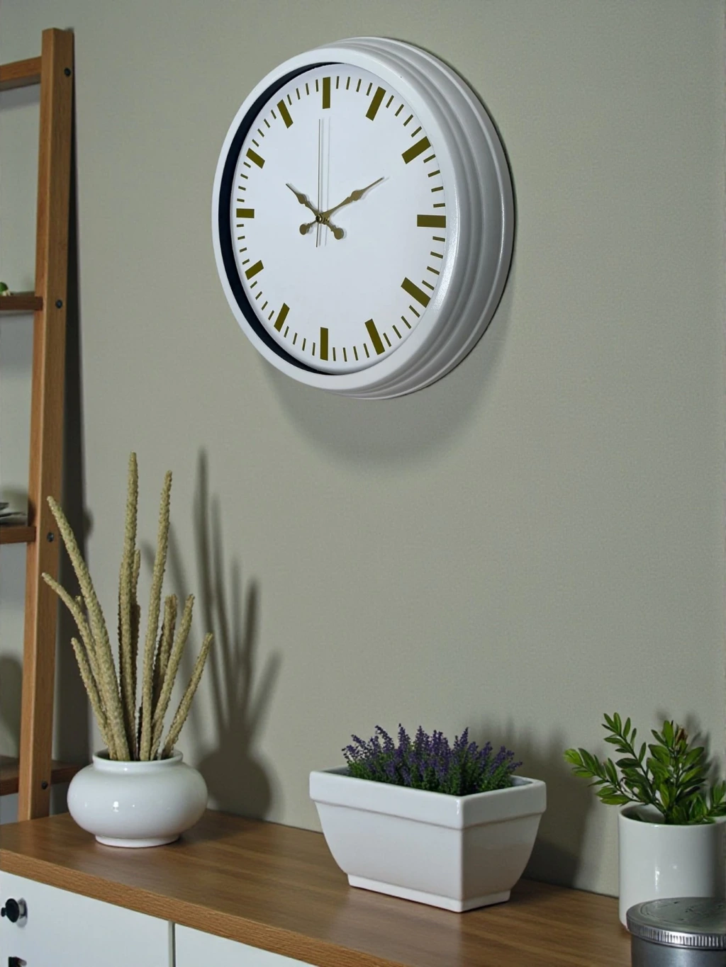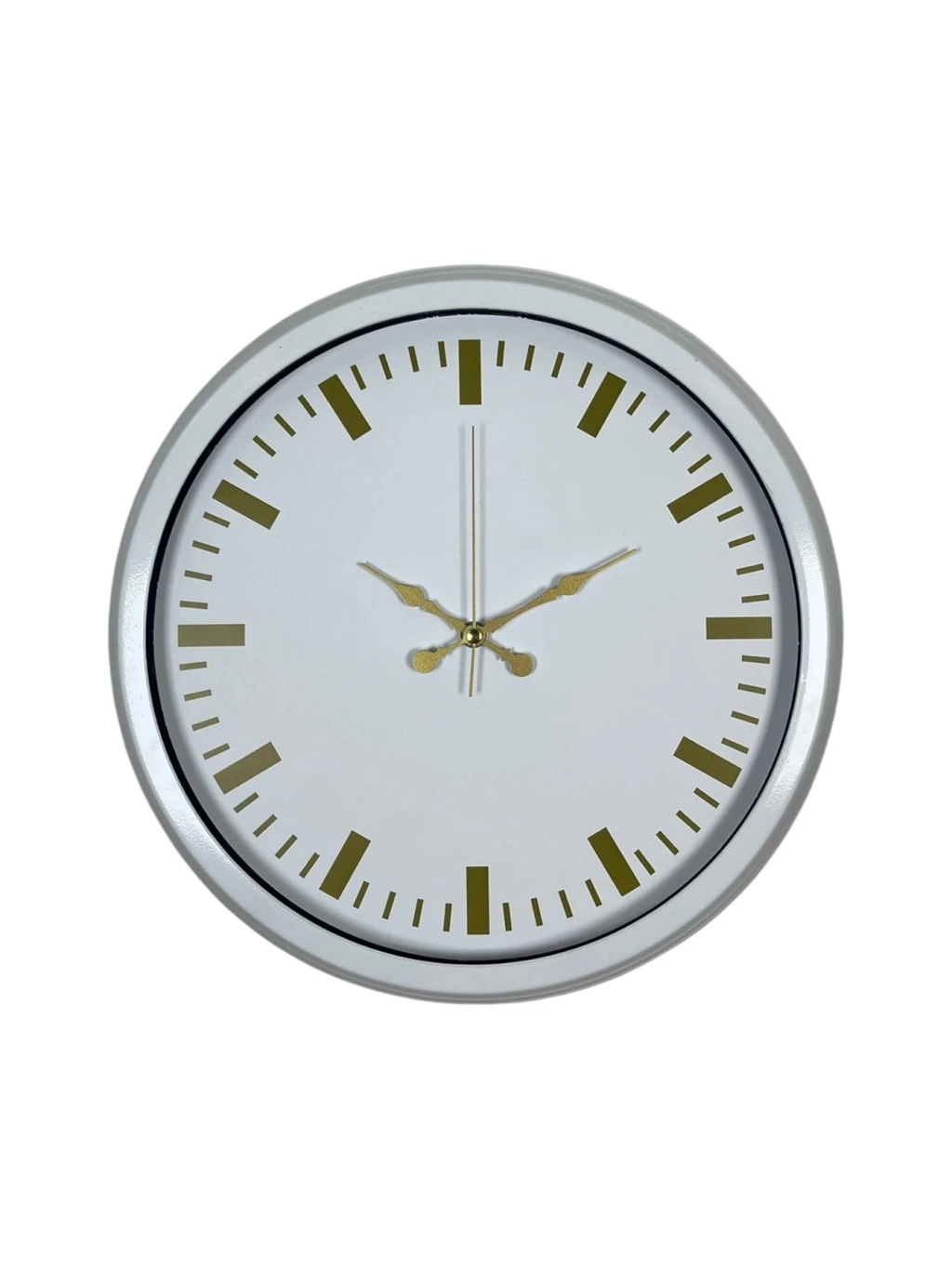 Zarif beyaz kadranı ve gold detaylarıyla öne çıkan bu duvar saati, bulunduğu ortama ferah ve lüks bir hava katar. Minimal tasarımı sayesinde hem modern hem de klasik dekorasyonlarla uyum sağlar. Gold akrep, yelkovan ve indeksler; beyaz zemin üzerinde şık bir kontrast oluşturarak saatin estetik değerini artırır.
