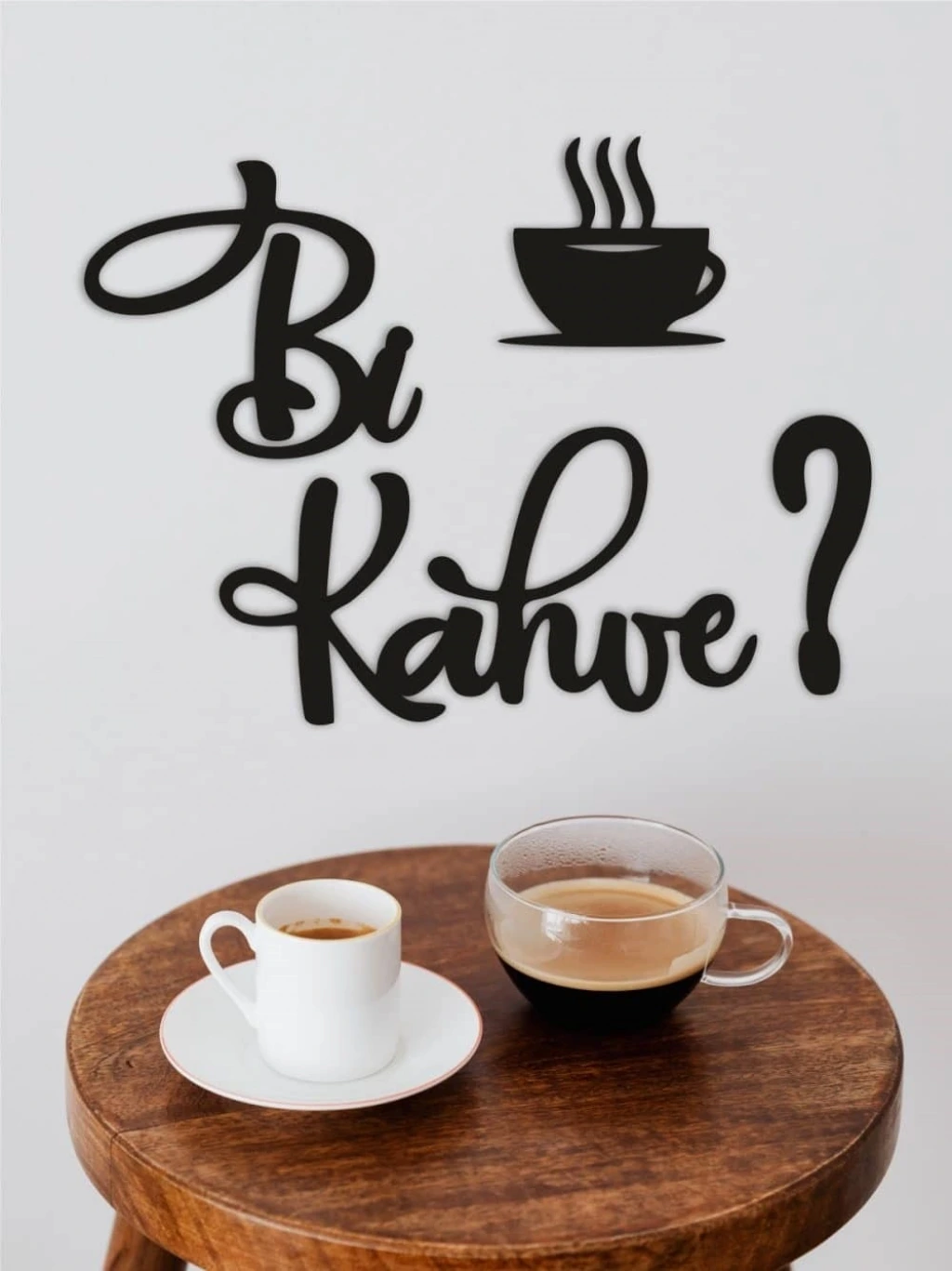 Bi Kahve?, kahve fincanı figürü ve samimi yazı tasarımıyla hazırlanmış, kahve severler için özel olarak tasarlanmış modern ahşap duvar dekorudur. Kahve köşelerine, mutfaklara ve kafe ortamlarına sıcak, davetkâr ve keyifli bir hava katar.