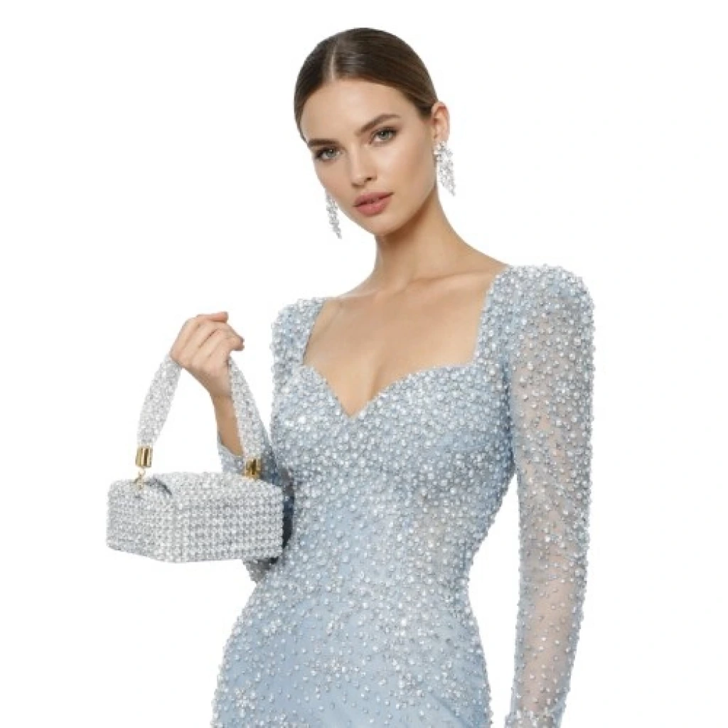Atelier Emine’in Crystal Gelato Couture koleksiyonuna ait Bianca Gesso, 8 mm optik sınıfı kristal boncukların yüksek mukavemetli misina ile tek tek örülmesiyle üretilmiş, heykelsi formu ve dengeli hacmiyle öne çıkan premium mini çanta modelidir.