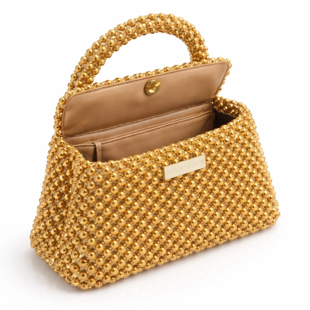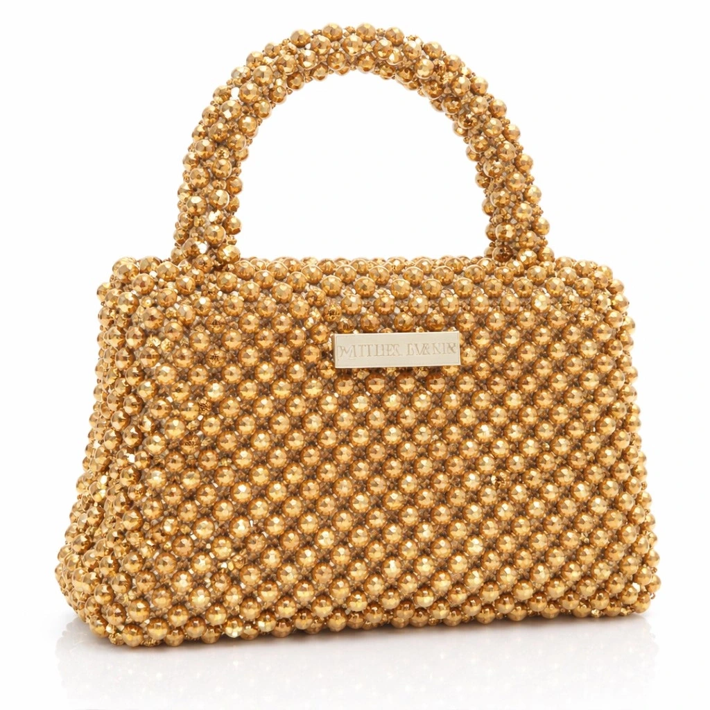 Atelier Emine’in Crystal Gelato Couture koleksiyonuna ait Bianca Gold, 8 mm optik sınıfı kristal boncukların yüksek mukavemetli misina ile tek tek örülmesiyle üretilmiş, kompakt ve dengeli formlu premium mini çanta modelidir.