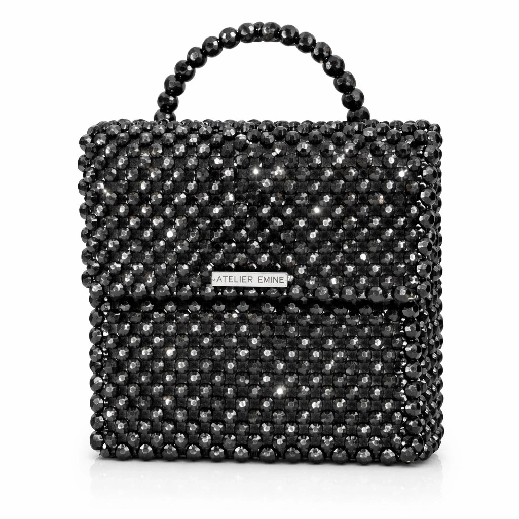 Çanta gövdesi, 8 mm standart yuvarlak kesim optik sınıfı kristal boncukların, yüksek dayanımlı monofilament misina kullanılarak yüksek yoğunluklu düz örgü tekniğiyle tek tek işlenmesi sonucu tamamen el işçiliğiyle oluşturulmuştur. Kristallerin sık ve homojen dizilimi, yüzey boyunca kesintisiz bir parlaklık sağlarken; örgü yapısı çantanın desteksiz şekilde formunu koruyabilen rijit bir yapı kazanmasını mümkün kılar.