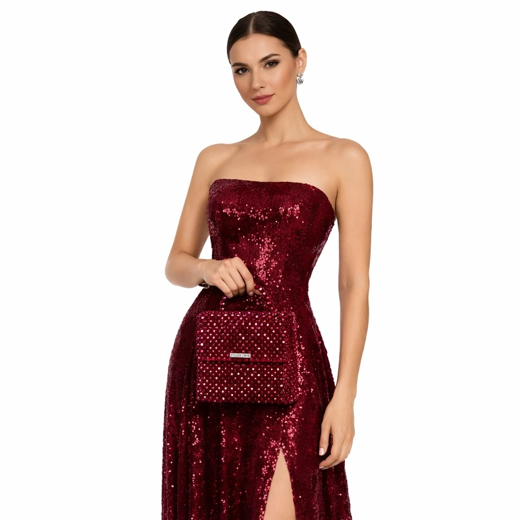 Çanta gövdesi, 8 mm standart yuvarlak kesim optik sınıfı kristal boncukların, yüksek dayanımlı monofilament misina kullanılarak yüksek yoğunluklu düz örgü tekniğiyle tek tek işlenmesi sonucu tamamen el işçiliğiyle oluşturulmuştur. Kristallerin sık ve homojen dizilimi, yüzey boyunca kesintisiz bir parlaklık sağlarken; örgü yapısı çantanın desteksiz şekilde formunu koruyabilen rijit bir yapı kazanmasını mümkün kılar.