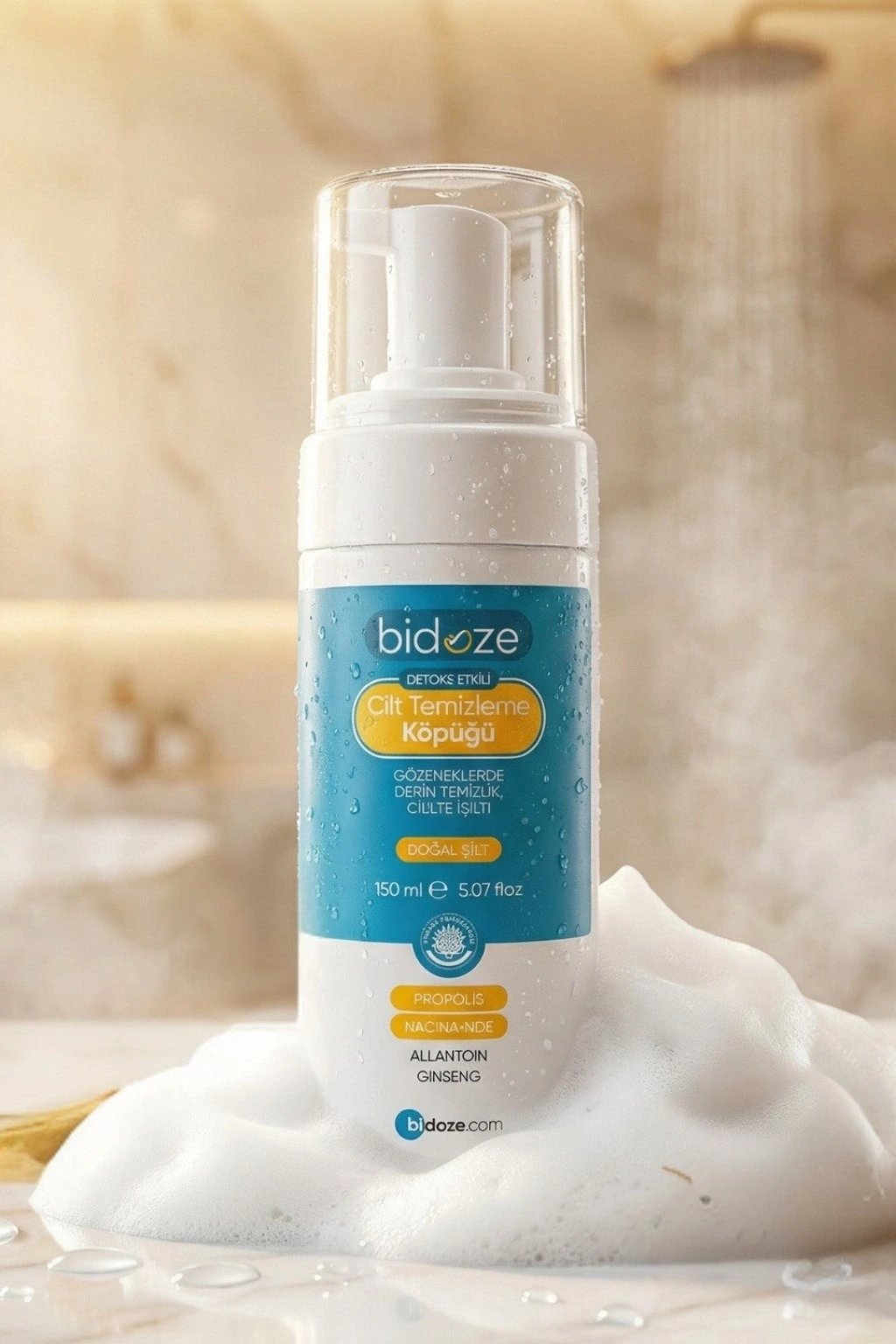 Bidoze Cilt Temizleme Köpüğü, cildinizi günün yorgunluğundan, makyaj kalıntılarından, yağdan ve kirden arındırırken; içeriğindeki Propolis ve Ginseng ile cildinize detoks etkisi yapan lüks bir temizleyicidir.