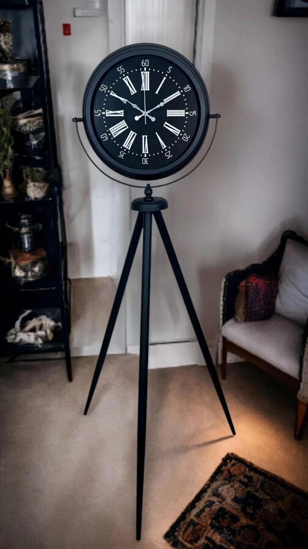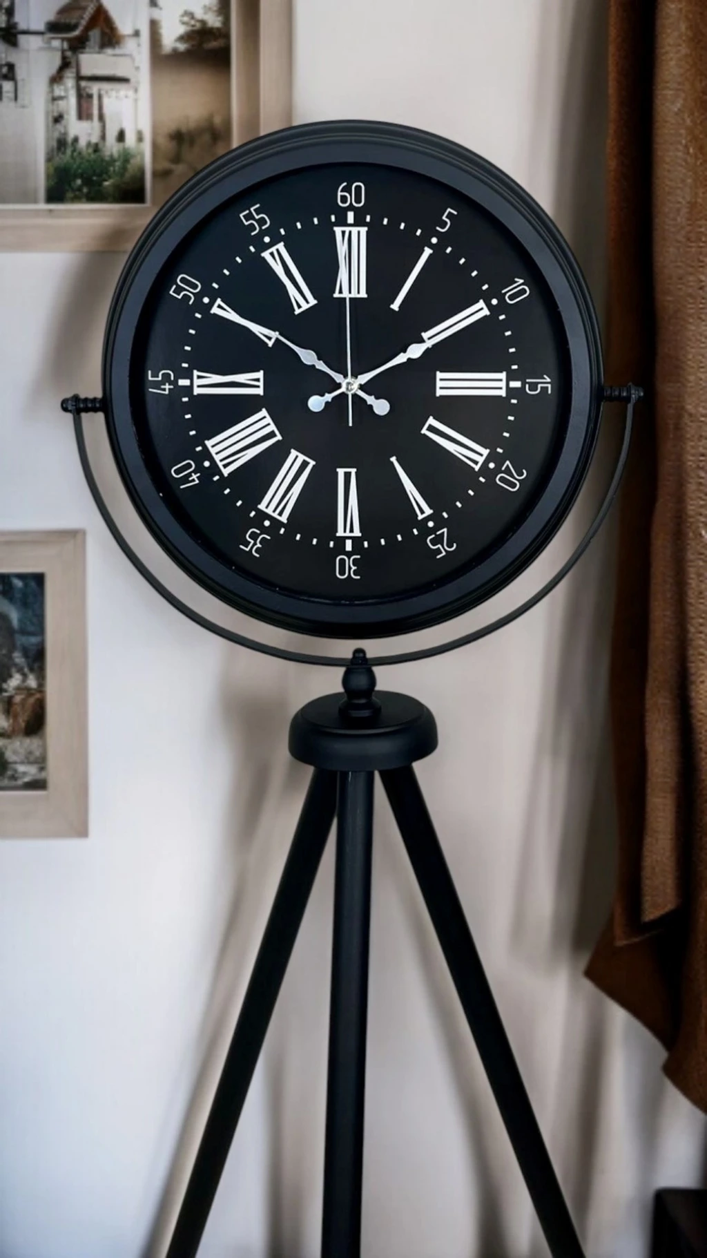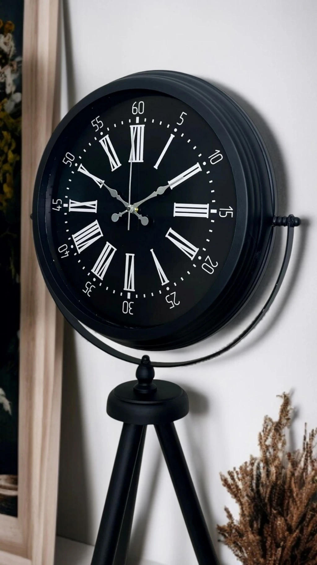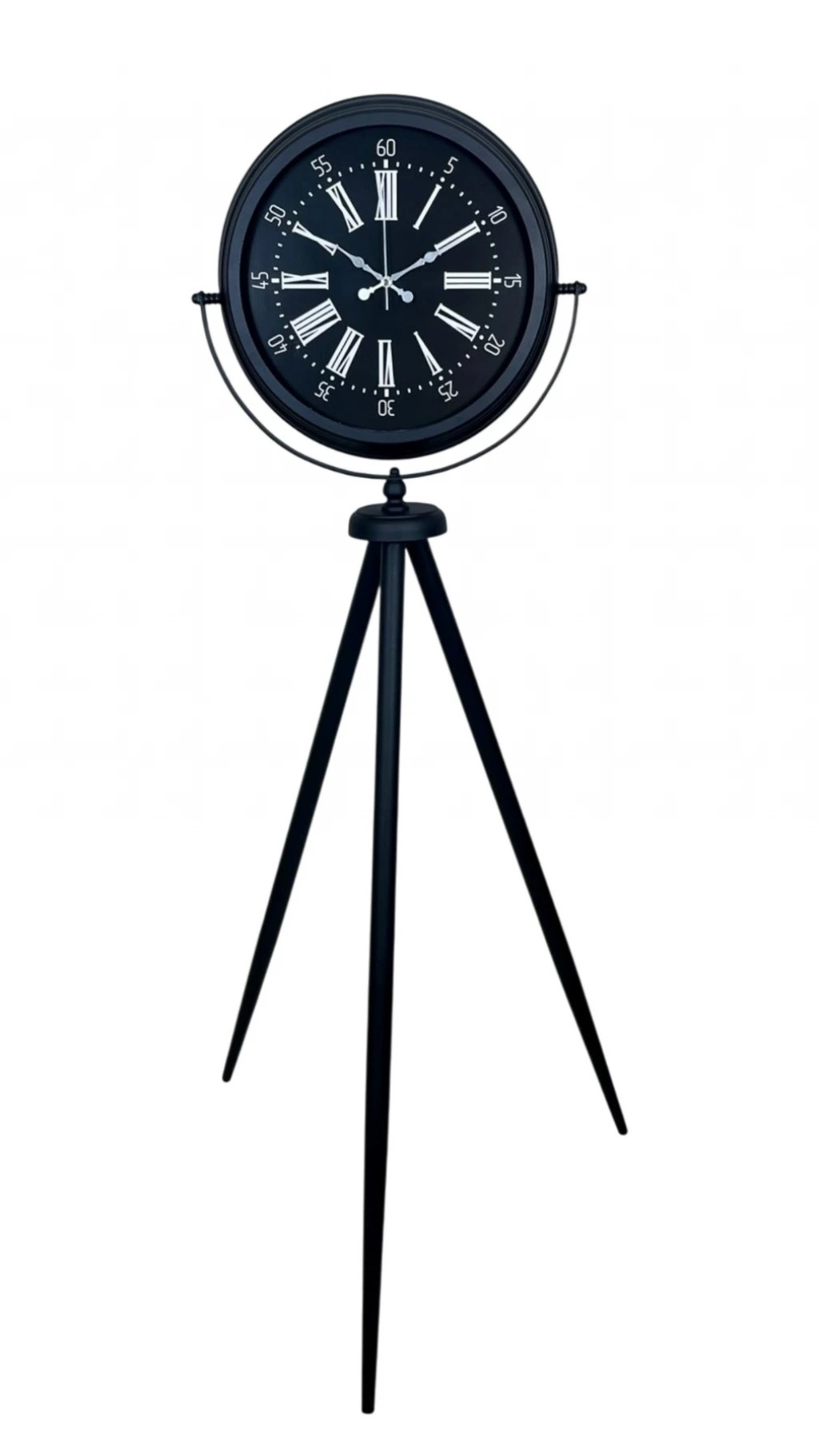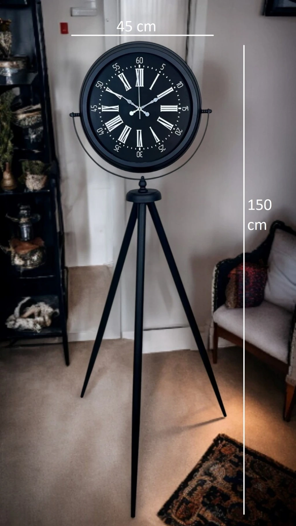 Klasik Roma rakamlarının şıklığını modern tripod tasarımla bir araya getiren Siyah Tripod Ayaklı Dekoratif Salon Saati, 150 x 45 cm ölçüsüyle bulunduğu ortamda güçlü bir duruş sergiler. Siyah metal tripod ayak yapısı; modern, loft ve endüstriyel dekorasyonlara uyum sağlarken, siyah kadran üzerindeki Roma rakamları ve çevresindeki dakika skalası ürüne hem nostaljik hem de rafine bir görünüm kazandırır. Bu özel tasarım, sıradan saatlerden farklı olarak dekorun parçası değil, çoğu zaman dekorun odak noktası olur.