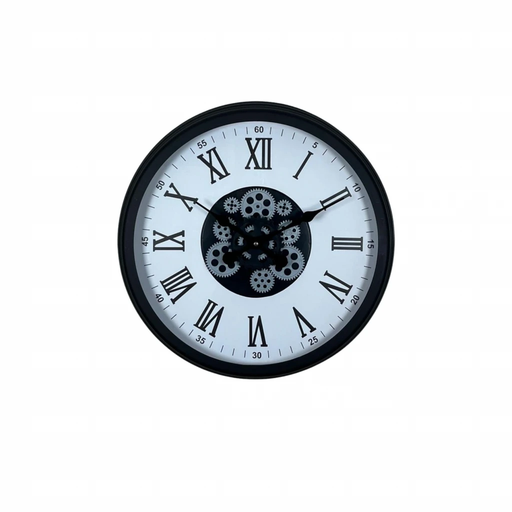 Siyah çerçevesi ve beyaz kadranı arasındaki kontrast sayesinde saat uzaktan dahi rahatlıkla okunabilir. Merkezde yer alan dekoratif hareketli çark mekanizması, ürüne dinamik ve dikkat çekici bir görünüm kazandırır.