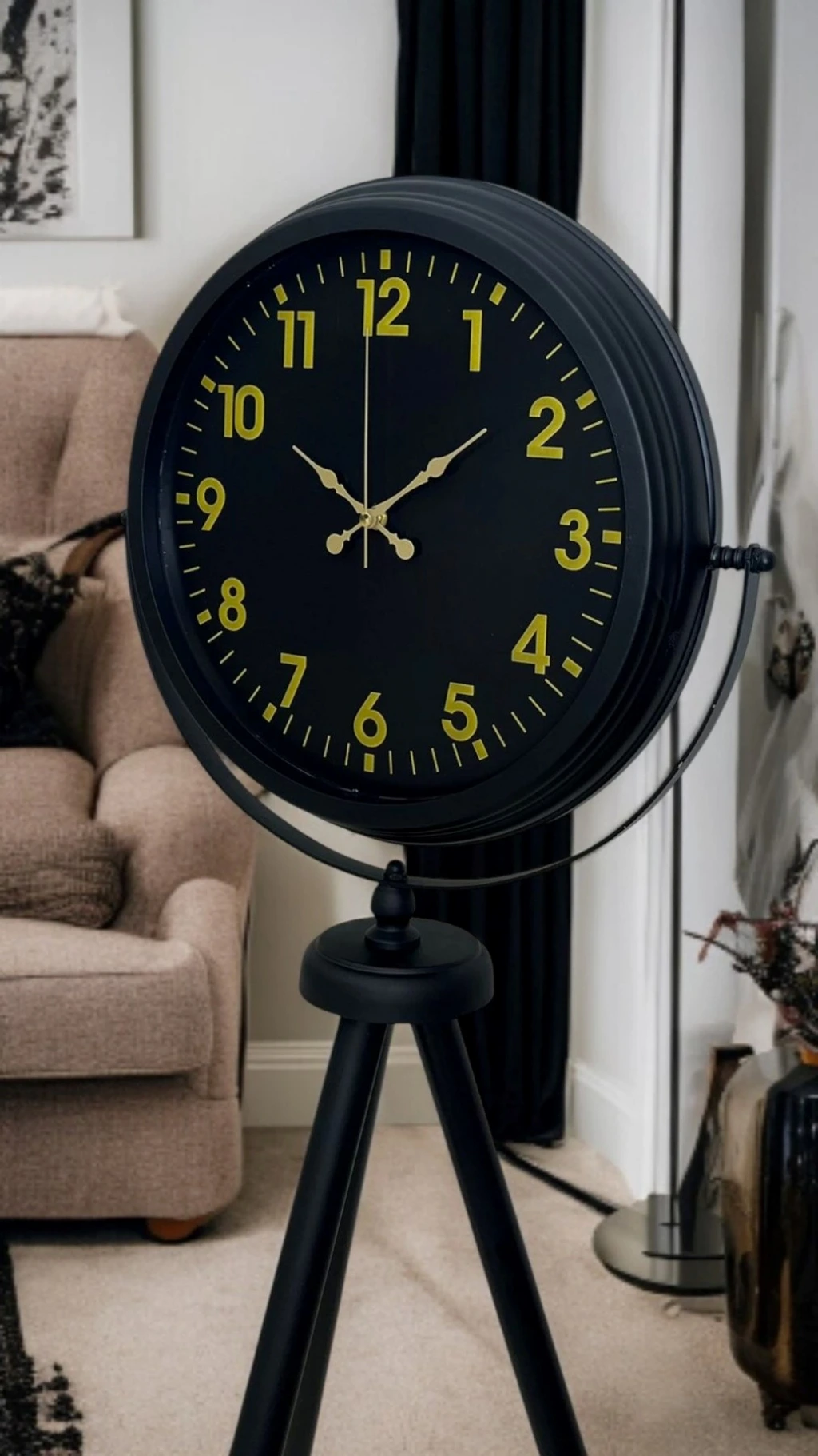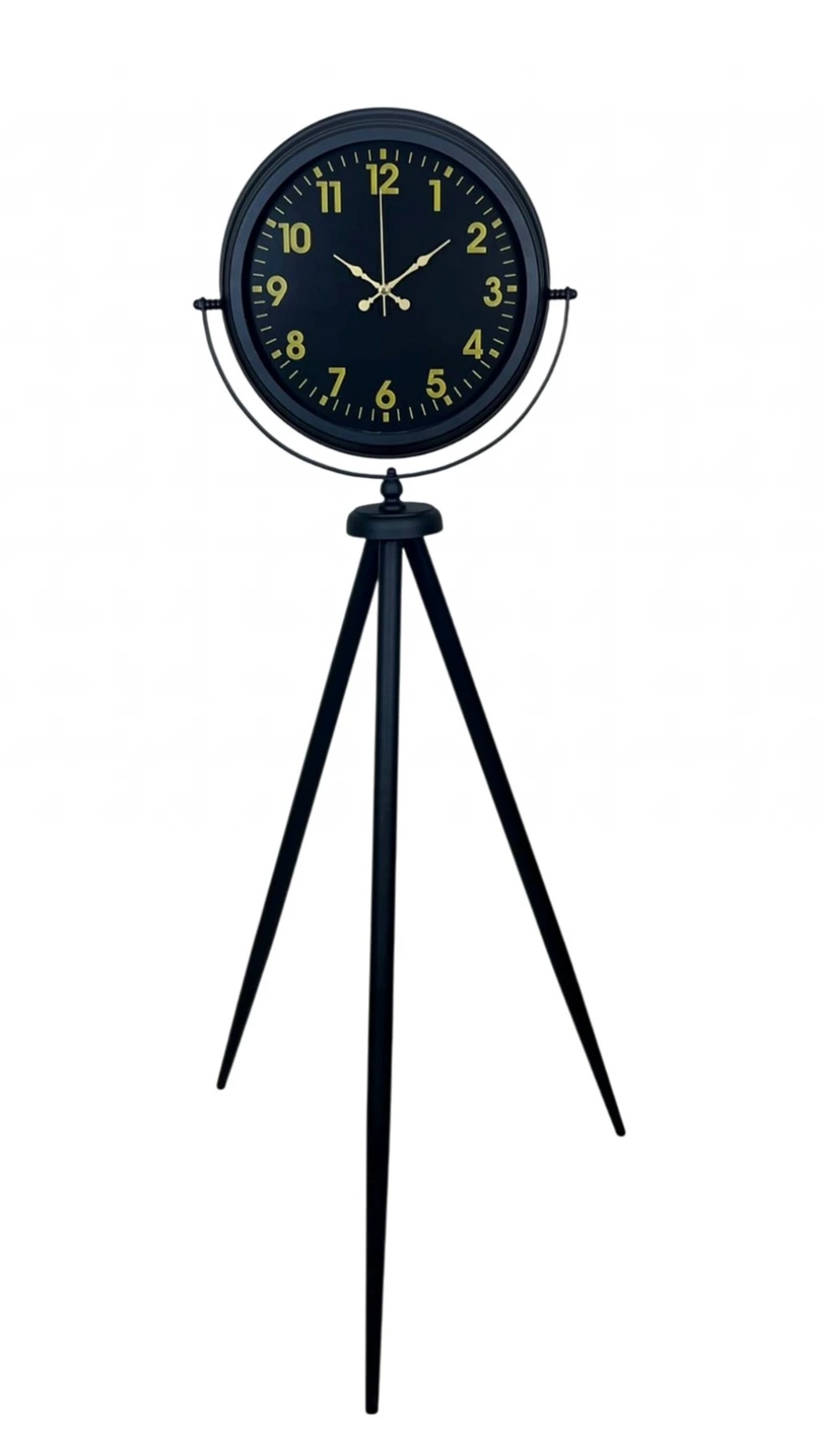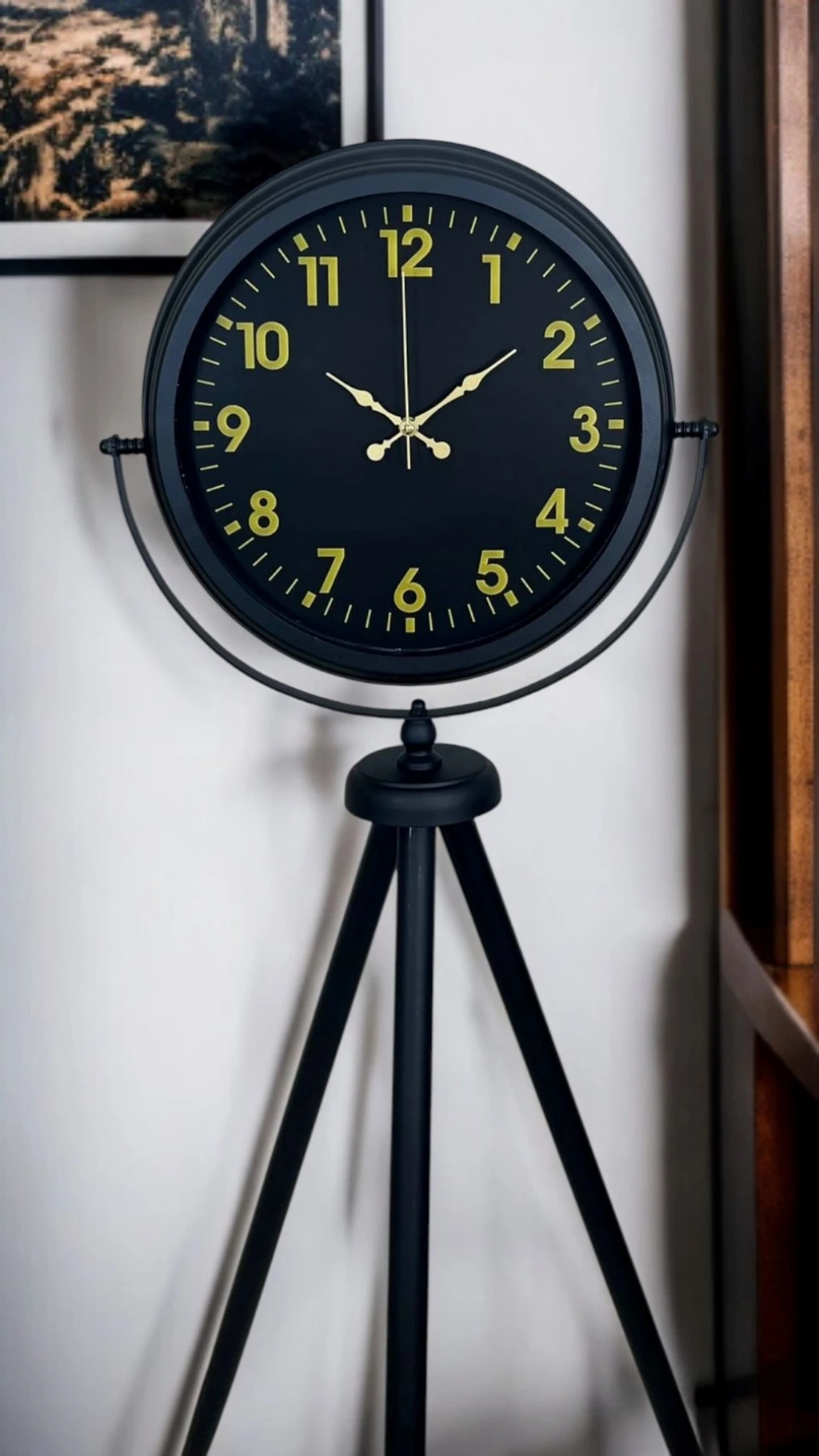 Yaşam alanınıza güçlü bir duruş ve premium bir şıklık kazandıran Siyah Tripod Ayaklı Dekoratif Salon Saati, 150 x 45 cm ölçüsüyle salon, ofis ve geniş mekanlarda dikkat çeken bir dekor objesidir. Siyah metal tripod ayak tasarımı modern, loft ve endüstriyel dekorasyonlarla kusursuz uyum sağlarken; siyah kadran üzerinde yer alan gold rakamlar ve gold ibreler ürüne lüks bir görünüm katar. Bu kontrast tasarım sayesinde saat, bulunduğu ortamda “vitrin etkisi” oluşturur ve dekorun en güçlü tamamlayıcısı olur.